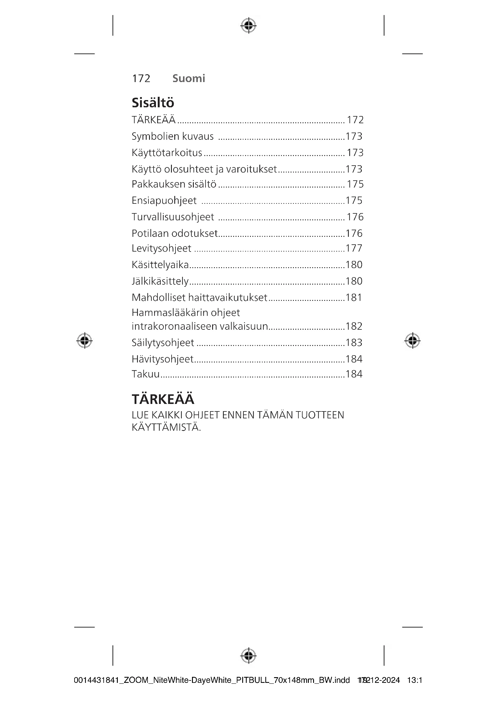 - - Näytä potilaalle ruiskun avulla, miten valkaisugeeliä levitetään hampaan sisään. Geeli pysyy hampaan sisällä suositeltavan käyttöajan. Täytä myös yksilöllinen lusikka geelillä valkaistaksesi hampaan ulkopintaa samanaikaisesti. - Neuvo potilasta huuhtelemaan ydinontelo valkaisukäsittelyn jälkeen huolellisesti Monoject-ruiskulla ja vedellä. - Optimaalisten valkaisutulosten saavuttamiseksi toista menettely tarpeen mukaan useiden päivien ajan. Käytä hampaiden valkaisusarjan sisältämää sävyopasta seurataksesi edistymistä aina 3–4käyttökerran jälkeen. Ota huomioon, että devitaalit hampaat voivat vaalentua nopeammin. - Haluttujen tulosten saavuttamisen jälkeen kuivaa ydinontelo sisältä, aseta kuiva vanupallo ja sulje se väliaikaisesti. - Jatka valkaisua käyttämällä yksilöllisiä lusikoita halutun sävyn säilyttämiseksi. Odota viimeisen valkaisukerran jälkeen 7–10päivää ennen sidostetun pysyvän restauraation tekemistä. Säilytysohjeet Säilytä tuotetta pimeässä ja kuivassa paikassa, jonka lämpötila on15–25°C. Tuotteen säilyvyys heikkenee, jos säilytyslämpötila on korkeampi kuin 25°C. 300014431841_ZOOM_NiteWhite-DayeWhite_PITBULL_70x148mm_BW.indd 183300014431841_ZOOM_NiteWhite-DayeWhite_PITBULL_70x148mm_BW.indd 18319-12-2024 13:1219-12-2024 13:12184 Suomi Svenska 185 Hävitysohjeet Tuote on hävitettävä paikallisten jätehuoltomääräysten mukaisesti. Takuu Philips vakuuttaa, että tämän tuotteen valmistuksessa on noudatettu asianmukaista huolellisuutta. Tämä takuu korvaa ja sulkee pois kaikki muut takuut, joita ei nimenomaisesti mainita tässä, ovatpa ne sitten oletettuja tai ilmaistuja lain perusteella tai muuten, mukaan lukien, mutta muitakaan pois sulkematta, mitkä tahansa takuut sopivuudesta kaupankäynnin kohteeksi tai mihin tiettyyn käyttötarkoitukseen. Innehåll VIKTIGT p. 185