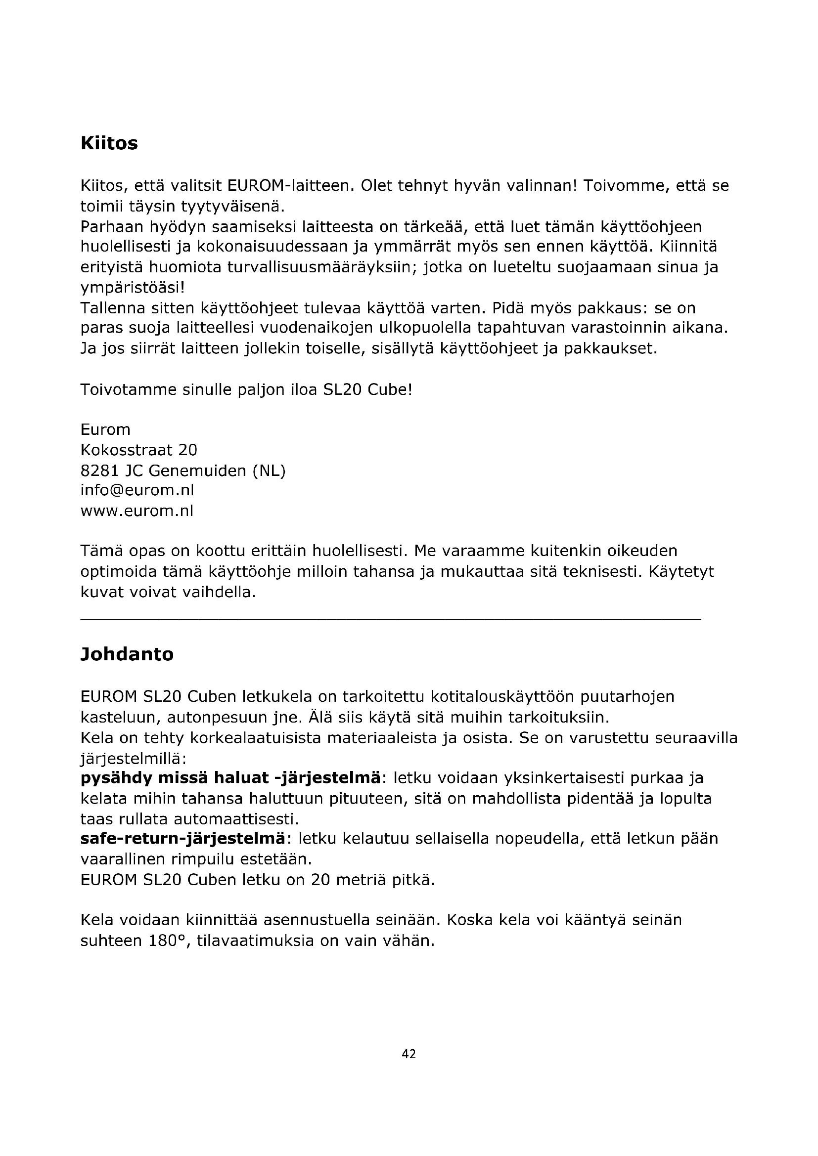 Johdanto EUROM SL20 Cuben letkukela on tarkoitettu kotitalouskäyttöön puutarhojen kasteluun, autonpesuun jne. Älä siis käytä sitä muihin tarkoituksiin. Kela on tehty korkealaatuisista materiaaleista ja osista. Se on varustettu seuraavilla järjestelmillä: pysähdy missä haluat -järjestelmä: letku voidaan yksinkertaisesti purkaa ja kelata mihin tahansa haluttuun pituuteen, sitä on mahdollista pidentää ja lopulta taas rullata automaattisesti. safe-return-järjestelmä: letku kelautuu sellaisella nopeudella, että letkun pään vaarallinen rimpuilu estetään. EUROM SL20 Cuben letku on 20 metriä pitkä. Kela voidaan kiinnittää asennustuella seinään. Koska kela voi kääntyä seinän suhteen 180°, tilavaatimuksia on vain vähän.43