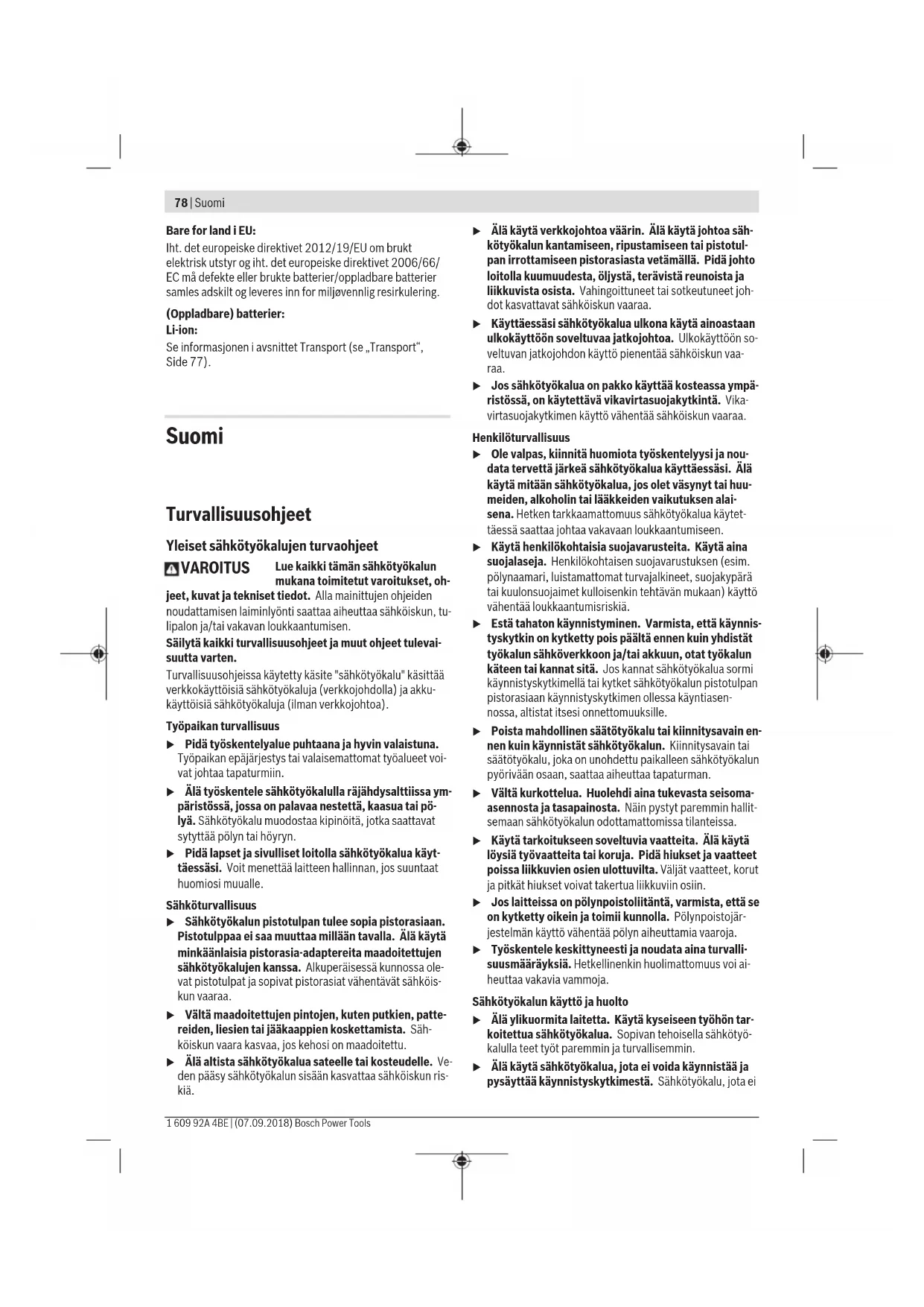 Näissä käyttöohjeissa ilmoitetut tärinä- ja melupäästötiedot on mitattu standardissa EN62841 määritetyn mittausmene- telmän mukaan ja niitä voi käyttää sähkötyökalujen keskinäi- seen vertailuun. Ne soveltuvat myös tärinä- ja melupäästöjen alustavaan arviointiin. Ilmoitetut tärinä- ja melupäästöt vastaavat sähkötyökalun pääasiallisia käyttötapoja. Tärinä- ja melupäästöt saattavat kuitenkin poiketa ilmoitetuista arvoista, jos sähkötyökalua käytetään toisiin töihin, muilla käyttötarvikkeilla tai riittämät- tömästi huollettuna. Tämä saattaa suurentaa koko työsken- telyajan tärinä- ja melupäästöjä huomattavasti. Tärinä- ja melupäästöjen tarkaksi arvioimiseksi on huomioi- tava myös ne ajat, jolloin laite on sammutettuna tai tyhjä- käynnillä. Tämä voi vähentää huomattavasti koko työskente- lyajan tärinä- ja melupäästöjä. Määrittele tarvittavat lisävarotoimenpiteet käyttäjän suojele- miseksi tärinän aiheuttamilta haitoilta (esimerkiksi sähkötyö- kalujen ja käyttötarvikkeiden huolto, käsien pitäminen lämpi- minä ja työprosessien organisointi). Asennus Akun lataus u Käytä vain tarvikesivulla mainittuja latauslaitteita. Vain nämä latauslaitteet soveltuvat sähkötyökalussasi käytettävälle litiumioniakulle. Huomautus: akku toimitetaan osittain ladattuna. Akun täy- den tehon varmistamiseksi akku tulee ladata latauslaitteessa täyteen ennen ensikäyttöä. Litiumioniakun voi ladata koska tahansa. Tämä ei lyhennä akun elinikää. Latauksen keskeytys ei vaurioita akkua. Litiumioniakku on suojattu "Electronic Cell Protection (ECP)" (elektronisella kennojen suojauksella) syväpurkautu- misen estämiseksi. Kun akku on lähes tyhjä, suojakytkin kat- kaisee sähkötyökalun toiminnan: käyttötarvike pysähtyy. u Älä paina enää käynnistyskytkintä sähkötyökalun toi- minnan automaattisen katkaisun jälkeen. Akku saattaa vahingoittua. Suomi | 81 Bosch Power Tools 1 609 92A 4BE | (07.09.2018)82 | Suomi 1 609 92A 4BE | (07.09.2018) Bosch Power Tools Akun irrottaminen Kun haluat irrottaa akun sähkötyökalusta, paina akun lukituk- sen avauspainiketta ja vedä akku takakautta pois. Älä irrota akkua väkisin. Akun lataustilan näyttö Akun lataustilan näyttö (13) koostuu 3 vihreästä LED-va- losta. Se näyttää akun lataustilan muutaman sekunnin ajan käynnistyspainikkeen (14) painalluksen tai pohjaan painami- sen yhteydessä. LED-valo Kapasiteetti 3vihreää LED-valoa palaa jatkuvasti ≥ 66% 2vihreää LED-valoa palaa jatkuvasti 33–66% 1 vihreä LED-valo palaa jatkuvasti 11–33% 1 vihreä LED-valo vilkkuu hitaasti ≤ 10% Lataustilan näytön 3 LED-valoa vilkkuvat nopeasti, jos akun lämpötila ei ole –30...+65°C alueella ja/tai ylikuor- mitussuoja on lauennut. Käyttötarvikkeen vaihto Käyttötarvikkeen asennus (katso kuva A) Työnnä käyttötarvike pitimen (2) pohjaan. Pitimen mag- neetti pitää käyttötarviketta paikallaan. Käyttötarvikkeen irrotus Vedä käyttötarvike pois pitimestä (2). Poraistukan asennus (katso kuva B) Irrota käyttötarvike. Työnnä istukka pitimeen (2). Istukka lukittuu kuuluvasti pai- kalleen. Tarkista kunnollinen kiinnitys istukasta vetämällä. Käyttötarvikkeen asentaminen istukkaan (katso kuva C) Työnnä käyttötarvike istukan pohjaan. Istukan magneetti pi- tää käyttötarviketta paikallaan. Ruuvinpidin (katso kuva D) Ruuvinpidin (16) pitää ruuvit suorassa niin, että ne saa oh- jattua helpommin työkappaletta vasten. Irrota käyttötarvike. Työnnä ruuvinpidin käyttötarvikkeen pitimeen (2) niin, että se lukittuu kuuluvasti paikalleen. Paina magneettikaulus (15) rajoittimeen asti sähkötyökalun suuntaan. Asenna sen jälkeen ruuvauskärki (20) ruuvinpitimeen (16) ja vedä magneettikaulusta eteenpäin ruuvauskärjen päälle. Aseta ruuvi ruuvauskärkeen. Poraistukka (katso kuva E) Avaa poraistukka (18) kääntämällä sitä kiertosuuntaan ➊, kunnes voit asentaa käyttötarvikkeen. Asenna käyttötarvike paikalleen. Kiristä poraistukan (18) holkkia voimakkaasti kädellä kierto- suuntaan ➋. Tämän myötä poranistukka lukittuu automaatti- sesti. Istukan kääntäminen (katso kuva F) Vedä vapautusrengasta (1) sähkötyökalusta poispäin ja ir- rota sen jälkeen istukka pitimestä (2). Käännä istukka haluamaasi asentoon ja työnnä se jälleen pai- kalleen. Tarkista kunnollinen kiinnitys istukasta vetämällä. Istukan irrottaminen (katso kuva G) Irrota käyttötarvike. Vedä vapautusrengasta (1) sähkötyökalusta poispäin ja vedä istukka irti pitimestä (2). Istukoiden yhdistely (katso kuva H) Irrota käyttötarvike. Asenna kulmavaihtopää (17) pitimeen (2). Tarkista kunnollinen kiinnitys kulmavaihtopäästä (17) vetä- mällä. Asenna poraistukka (18) kulmavaihtopäähän (17). Tarkista kunnollinen kiinnitys poraistukasta (18) vetämällä. Pölyn-/purunpoisto Työstettävistä materiaaleista syntyvä pöly (esimerkiksi lyijy- pitoinen pinnoite, tietyt puulaadut, kivi ja metalli) voi olla ter- veydelle vaarallista. Pölyn koskettaminen tai hengittäminen saattaa aiheuttaa käyttäjälle tai lähellä oleville ihmisille aller- gisia reaktioita ja/tai hengitystiesairauksia. Tietyt pölylaadut (esimerkiksi tammi- tai pyökkipöly) katso- taan syöpää aiheuttaviksi, varsinkin puunkäsittelyaineiden yhteydessä (kromaatti, puunsuoja-aine). Asbestipitoisia ai- neita saavat käsitellä vain ammattilaiset. – Huolehdi työkohteen hyvästä tuuletuksesta. – Suosittelemme käyttämään suodatusluokan P2 hengitys- suojanaamaria. Noudata käsiteltäviä materiaaleja koskevia maakohtaisia määräyksiä. u Estä pölyn kertyminen työpisteeseen. Pöly saattaa olla herkästi syttyvää. Käyttö Käyttöönotto Akun asennus Työnnä ladattu akku (9) takakautta sähkötyökalun rungon si- sään niin, että se lukkiutuu kunnolla paikalleen. Pyörintäsuunnan asetus Elektronisella suunnanvaihtokytkimellä (7) voit vaihta