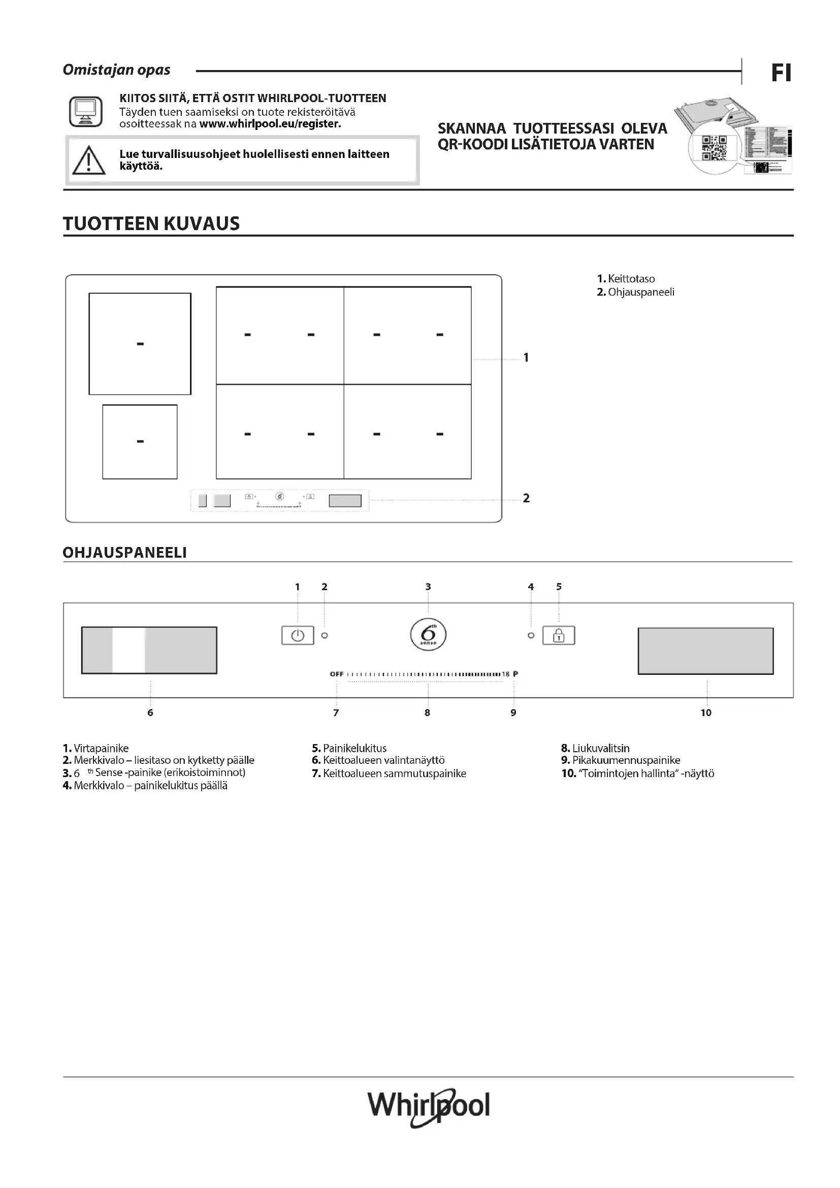 - Jos näyttöön keittotasoa käynnistettäessä tulee aakkosnumeerinen koodi, toimi seuraavan taulukon mukaan. Huomaa: Vesi, kattiloista roiskunut neste tai jokin esine liesitason säätönuppien kohdalla saattaa vahingossa aktivoida tai ottaa pois käytöstä ohjauspaneelin lukitustoiminnon. Lämmön jakautuminen, "Pannukakku" testi standardin EN 60350-2 §7.3 mukaisesti Lämmön tehokkuus, "Ranskalaiset perunat" testi standardin EN 60350-2 §7.4 mukaisesti Sulattaminen ja lämpimänäpito, "suklaa" Haudutus, "riisipuuro" EKOSUUNNITTELU: Testaus on suoritettu määräysten mukaisesti valitsemalla lieden kaikki keittoalueet muodostaen yhden ainoan alu een tai käyttäen Flexifull-toimintoa. Tarkastetut reseptit Tarkastetut kypsennysasennotHUOLTOPALVELU Täyden tuen saamiseksi on tuote rekisteröitävä osoitteessa www.whirlpool. eu/register. ENNEN KUIN OTAT YHTEYTTÄ HUOLTOPALVELUUN: