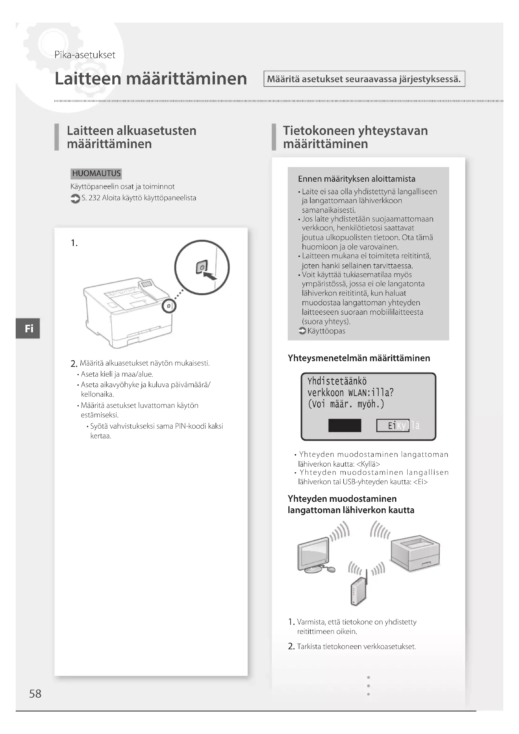 Määritä alkuasetukset näytön mukaisesti.•Asetakielijamaa/alue.•Asetaaikavyöhykejakuluvapäivämäärä/kellonaika.•Määritäasetuksetluvattomankäytönestämiseksi.•SyötävahvistukseksisamaPIN-koodikaksikertaa.Ennen määrityksen aloittamista•Laiteeisaaollayhdistettynälangalliseenja langattomaan lähiverkkoon samanaikaisesti.•Joslaiteyhdistetäänsuojaamattomaanverkkoon, henkilötietosi saattavat joutua ulkopuolisten tietoon. Ota tämä huomioon ja ole varovainen.•Laitteenmukanaeitoimitetareititintä,joten hanki sellainen tarvittaessa.•Voitkäyttäätukiasematilaamyösympäristössä, jossa ei ole langatonta lähiverkon reititintä, kun haluat muodostaa langattoman yhteyden laitteeseen suoraan mobiililaitteesta (suora yhteys). KäyttöopasYhteysmenetelmän määrittäminen EiKyllä Yhdistetäänkö verkkoon WLAN:illa? (Voi määr. myöh.)