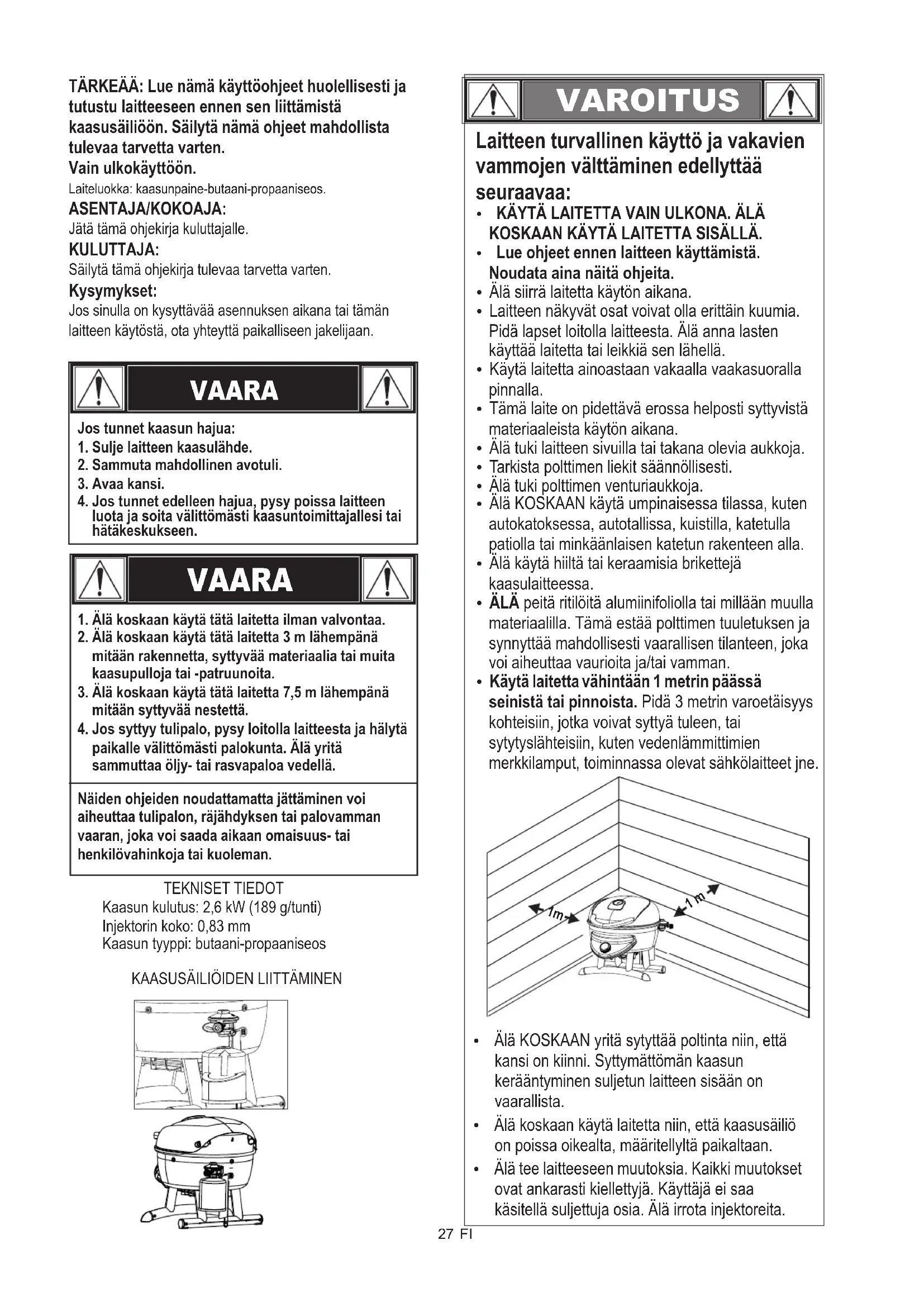 VAARA Jos tunnet kaasun hajua:1. Sulje laitteen kaasulähde.2. Sammuta mahdollinen avotuli.3. Avaa kansi.4. Jos tunnet edelleen hajua, pysy poissa laitteen luota ja soita välittömästi kaasuntoimittajallesi tai hätäkeskukseen.TEKNISET TIEDOT VAARA Näiden ohjeiden noudattamatta jättäminen voi aiheuttaa tulipalon, räjähdyksen tai palovamman vaaran, joka voi saada aikaan omaisuus- tai henkilövahinkoja tai kuoleman.Kaasun kulutus: 2,6 kW (189 g/tunti)Injektorin koko: 0,83 mmKaasun tyyppi: butaani-propaaniseosKAASUSÄILIÖIDEN LIITTÄMINENTÄRKEÄÄ: Lue nämä käyttöohjeet huolellisesti ja tutustu laitteeseen ennen sen liittämistä kaasusäiliöön. Säilytä nämä ohjeet mahdollista tulevaa tarvetta varten.Vain ulkokäyttöön.Laiteluokka: kaasunpaine-butaani-propaaniseos.ASENTAJA/KOKOAJA:Jätä tämä ohjekirja kuluttajalle.KULUTTAJA:Säilytä tämä ohjekirja tulevaa tarvetta varten.Kysymykset:Jos sinulla on kysyttävää asennuksen aikana tai tämän laitteen käytöstä, ota yhteyttä paikalliseen jakelijaan. VAROITUS Laitteen turvallinen käyttö ja vakavien vammojen välttäminen edellyttää seuraavaa: