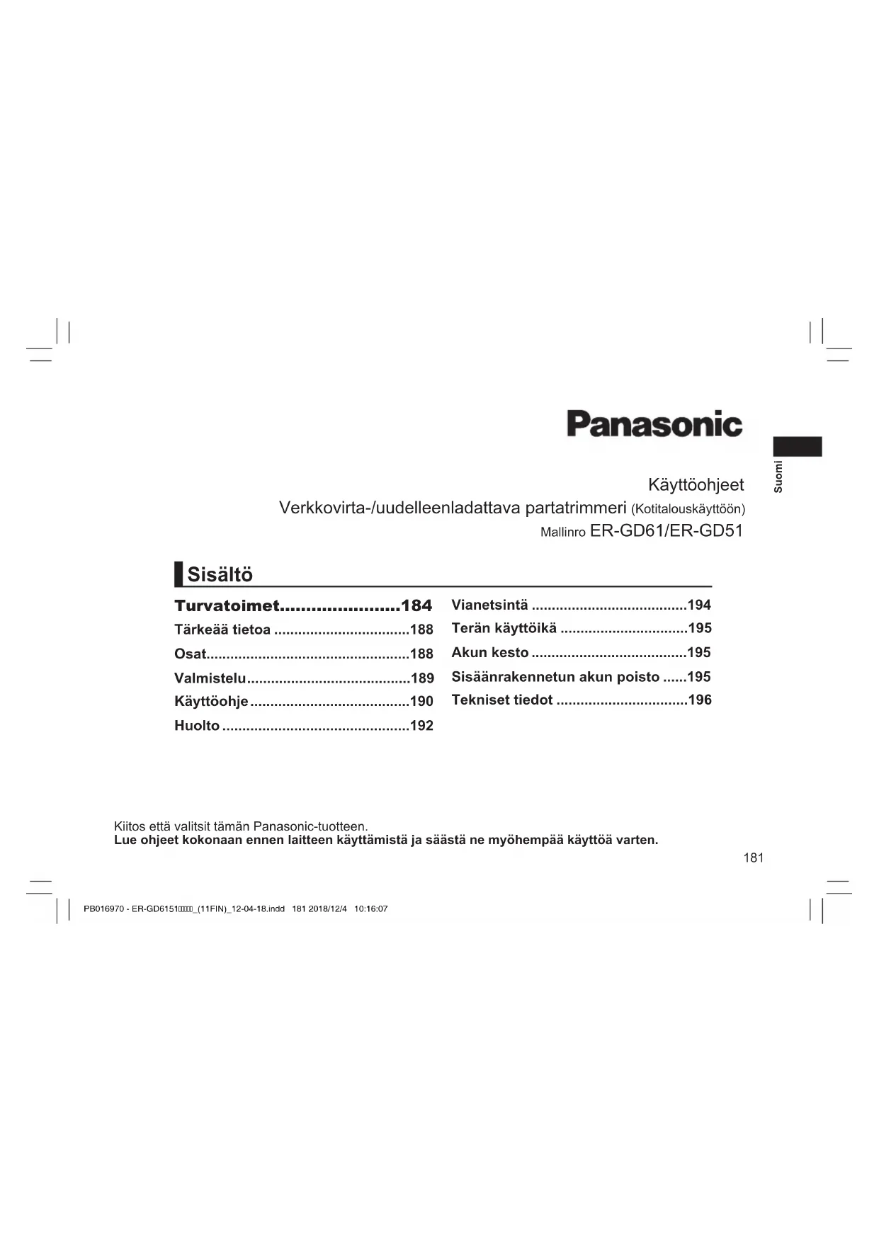 - PB016970 - ER-GD6151_(11FIN)_12-04-18.indd 195 2018/12/4 10:16:16196 Suomi Ympäristönsuojelu ja materiaalien kierrätys Tässä trimmerissä on nikkelimetallihydridiakku. Varmista, että akku hävitetään ongelmajätekeskuksen kautta, mikäli maassasi on sellainen. Tekniset tiedot Virtalähde Katso verkkolaitteen arvokilvestä. (automaattinen jännitteenvalinta) Moottorin jännite 1,2 V Latausaika Noin 1 tunti Ilmassa kantautuva melu 67 (dB (A) re 1 pW) Tämä tuote on tarkoitettu vain kotitalouskäyttöön. Vanhojen laitteiden ja paristojen hävittäminen Vain EU-jäsenmaille ja kierrätysjärjestelmää käyttäville maille Tämä symboli tuotteissa, pakkauksessa ja/ tai asiakirjoissa tarkoittaa, että käytettyjä sähköllä toimivia ja elektronisia tuotteita eikä paristoja ei saa laittaa yleisiin talousjätteisiin. Johda vanhat tuotteet ja käytetyt paristot käsittelyä, uusiointia tai kierrätystä varten vastaaviin keräyspisteisiin laissa annettujen määräysten mukaisesti. Hävittämällä tuotteet asiaankuuluvasti, autat samalla suojaamaan arvokkaita luonnonvaroja ja estämään mahdollisia negatiivisia vaikutuksia ihmiseen ja luontoon. Lisätietoa keräämisestä ja kierrätyksestä saa paikalliselta jätehuollosta vastuulliselta viranomaiselta. Maiden lainsäädännön mukaisesti tämän jätteen määräystenvastaisesta hävittämisestä voidaan antaa sakkorangaistuksia. Huomautus paristosymbolista (symboli alhaalla) Tämä symboli voidaan näyttää jonkin kemiallisen symbolin yhteydessä. Siinä tapauksessa se perustuu vastaaviin direktiiveihin, jotka on annettu kyseessä olevalle kemikaalille. PB016970 - ER-GD6151_(11FIN)_12-04-18.indd 196 2018/12/4 10:16:16197 Polski Instrukcja obsługi (Użycie w domu) Trymer do zarostu zasilany prądem zmiennym/akumulatorem Nr modelu ER‑GD61/ER‑GD51 Dziękujemy za wybór produktu rmy Panasonic. Przed rozpoczęciem użytkowania tego urządzenia prosimy o przeczytanie całej instrukcji i zachowanie jej do wykorzystania w przyszłości. Środki ostrożności p. 200