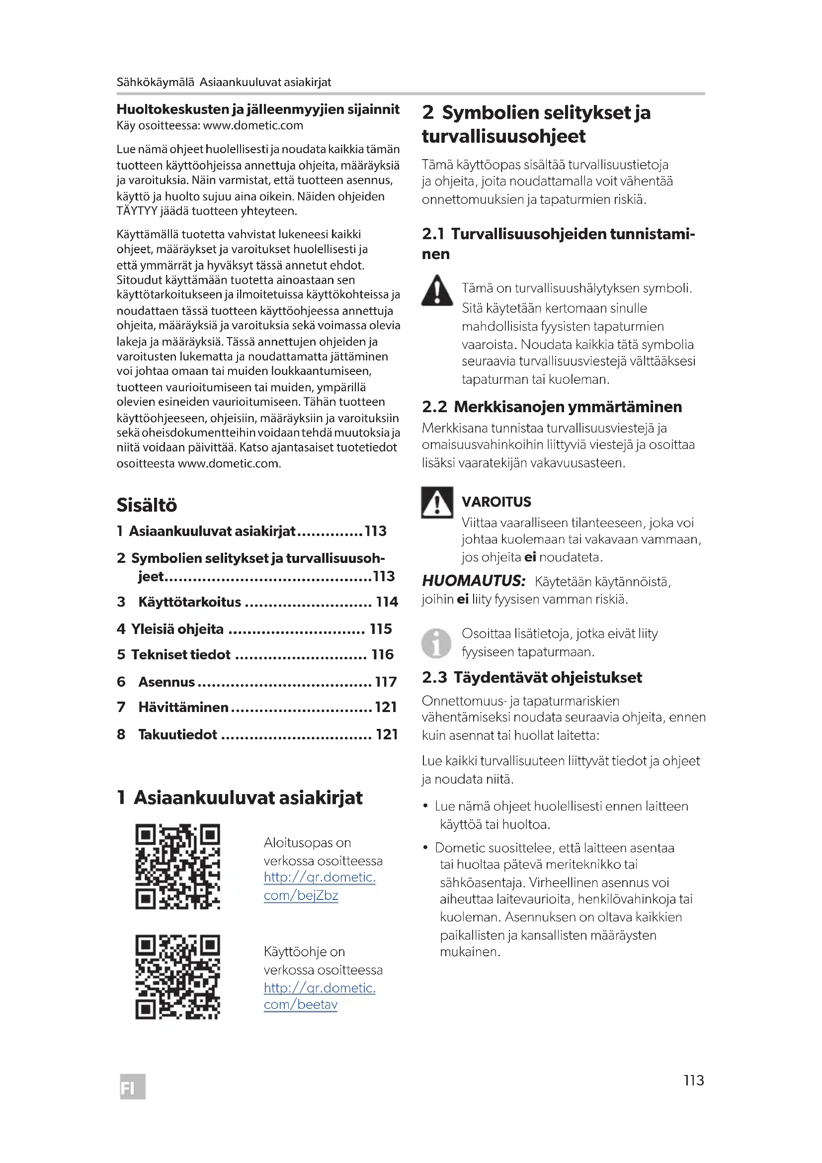 - Dometic suosittelee, että laitteen asentaa tai huoltaa pätevä meriteknikko tai sähköasentaja. Virheellinen asennus voi aiheuttaa laitevaurioita, henkilövahinkoja tai kuoleman. Asennuksen on oltava kaikkien paikallisten ja kansallisten määräysten mukainen. Huoltokeskusten ja jälleenmyyjien sijainnit Käy osoitteessa: www.dometic.com Lue nämä ohjeet huolellisesti ja noudata kaikkia tämän tuotteen käyttöohjeissa annettuja ohjeita, määräyksiä ja varoituksia. Näin varmistat, että tuotteen asennus, käyttö ja huolto sujuu aina oikein. Näiden ohjeiden TÄYTYY jäädä tuotteen yhteyteen. Käyttämällä tuotetta vahvistat lukeneesi kaikki ohjeet, määräykset ja varoitukset huolellisesti ja että ymmärrät ja hyväksyt tässä annetut ehdot. Sitoudut käyttämään tuotetta ainoastaan sen käyttötarkoitukseen ja ilmoitetuissa käyttökohteissa ja noudattaen tässä tuotteen käyttöohjeessa annettuja ohjeita, määräyksiä ja varoituksia sekä voimassa olevia lakeja ja määräyksiä. Tässä annettujen ohjeiden ja varoitusten lukematta ja noudattamatta jättäminen voi johtaa omaan tai muiden loukkaantumiseen, tuotteen vaurioitumiseen tai muiden, ympärillä olevien esineiden vaurioitumiseen. Tähän tuotteen käyttöohjeeseen, ohjeisiin, määräyksiin ja varoituksiin sekä oheisdokumentteihin voidaan tehdä muutoksia ja niitä voidaan päivittää. Katso ajantasaiset tuotetiedot osoitteesta www.dometic.com. Sisältö 1 Asiaankuuluvat asiakirjat Aloitusopas on verkossa osoitteessa http://qr.dometic. com/bejZbz Käyttöohje on verkossa osoitteessa http://qr.dometic. com/beetavKäyttötarkoitus Sähkökäymälä