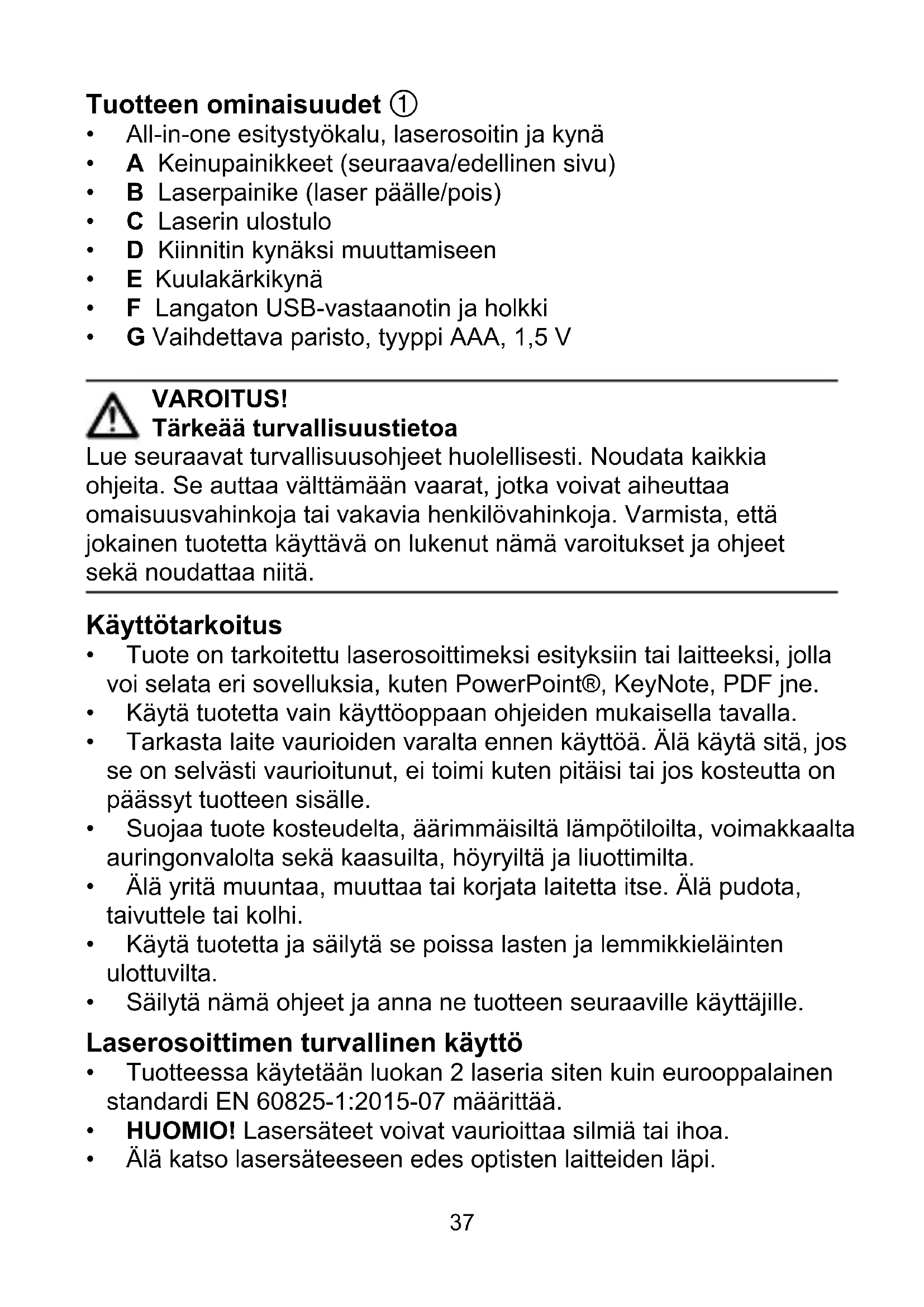 - G Vaihdettava paristo, tyyppi AAA, 1,5 V VAROITUS! Tärkeää turvallisuustietoa Lue seuraavat turvallisuusohjeet huolellisesti. Noudata kaikkia ohjeita. Se auttaa välttämään vaarat, jotka voivat aiheuttaa omaisuusvahinkoja tai vakavia henkilövahinkoja. Varmista, että jokainen tuotetta käyttävä on lukenut nämä varoitukset ja ohjeet sekä noudattaa niitä. Käyttötarkoitus