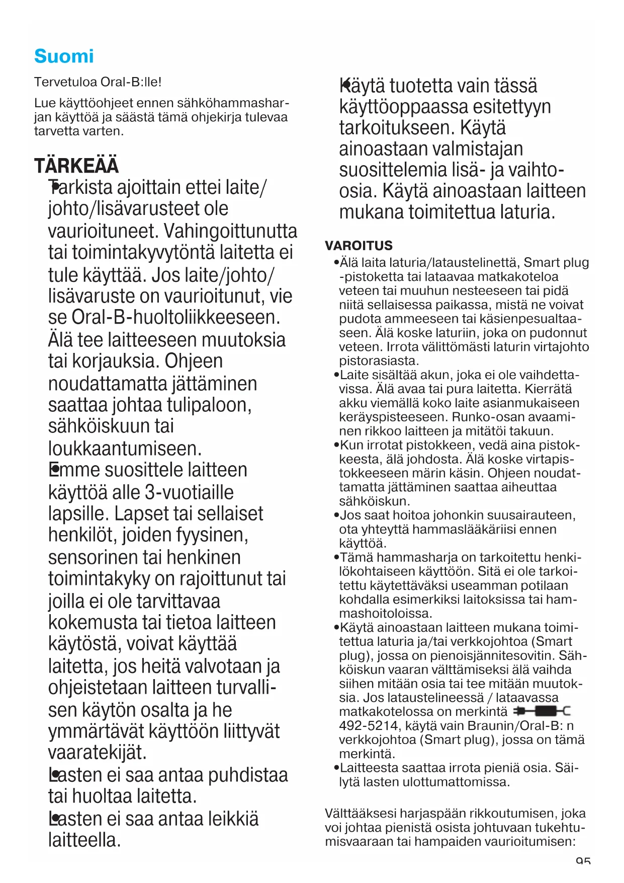 - Käytä ainoastaan laitteen mukana toimi- tettua laturia ja/tai verkkojohtoa (Smart plug), jossa on pienoisjännitesovitin. Säh- köiskun vaaran välttämiseksi älä vaihda siihen mitään osia tai tee mitään muutok- sia. Jos lataustelineessä / lataavassa matkakotelossa on merkintä 492-5214, käytä vain Braunin/Oral-B: n verkkojohtoa (Smart plug), jossa on tämä merkintä.