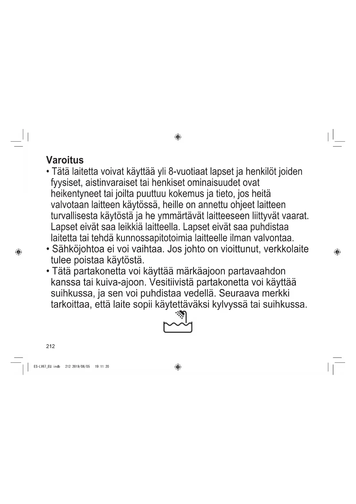 - Tätä partakonetta voi käyttää märkäajoon partavaahdon kanssa tai kuiva‑ajoon. Vesitiivistä partakonetta voi käyttää suihkussa, ja sen voi puhdistaa vedellä. Seuraava merkki tarkoittaa, että laite sopii käytettäväksi kylvyssä tai suihkussa. ES-LV67_EU.indb 212 2019/06/05 19:11:20213 TR RO H SK CZ PL FIN S N P DK E NL I F D GB