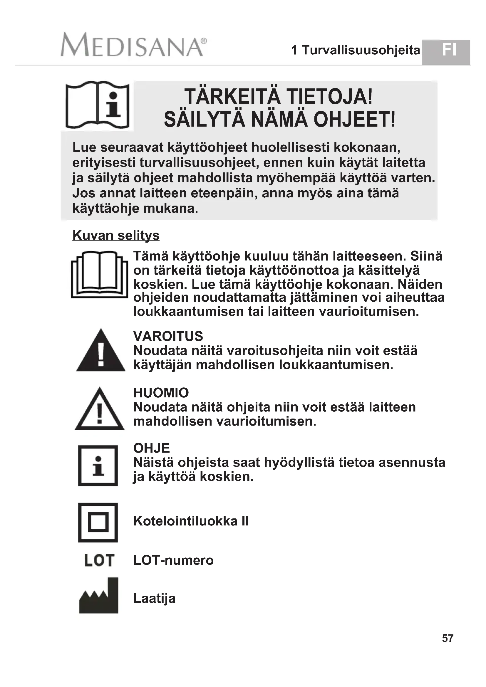 5 Garantie 56FI 1 Turvallisuusohjeita TÄRKEITÄ TIETOJA! SÄILYTÄ NÄMÄ OHJEET! Tämä käyttöohje kuuluu tähän laitteeseen. Siinä on tärkeitä tietoja käyttöönottoa ja käsittelyä koskien. Lue tämä käyttöohje kokonaan. Näiden ohjeiden noudattamatta jättäminen voi aiheuttaa loukkaantumisen tai laitteen vaurioitumisen. VAROITUS Noudata näitä varoitusohjeita niin voit estää käyttäjän mahdollisen loukkaantumisen. HUOMIO Noudata näitä ohjeita niin voit estää laitteen mahdollisen vaurioitumisen. OHJE Näistä ohjeista saat hyödyllistä tietoa asennusta ja käyttöä koskien. Kotelointiluokka II Kuvan selitys LOT-numero Laatija Lue seuraavat käyttöohjeet huolellisesti kokonaan, erityisesti turvallisuusohjeet, ennen kuin käytät laitetta ja säilytä ohjeet mahdollista myöhempää käyttöä varten. Jos annat laitteen eteenpäin, anna myös aina tämä käyttäohje mukana. 57• Ota huomioon, että tyyppikilvessä mainittu sähköjännite vastaa verkkovirtaasi, ennen kuin liität laitteen virransyöttöön. Pidä verkkojohto ja laite loitolla kuumuudesta, kuumista pinnoista, kosteudesta ja nesteistä. Älä ikinä koske verk- kopistoketta tai verkkokytkintä, kun ne ovat vedessä, tai märin tai kostein käsin. Älä tartu veteen pudonneeseen laitteeseen. Irrota verkkopistoke heti. Älä nosta tuotetta, jos se putoaa veteen. Irrota johto välittömästi pistorasiasta. Katkaise laitteesta virta käyttöosan painikkeiden avulla heti käytön jälkeen ja irrota verkkopistoke pistorasiasta. Irrottaaksesi laitteen sähköverkosta älä koskaan vedä verkkojohdosta, vaan aina verkkopistokkeesta! Älä kanna, vedä tai kierrä laitetta verkkojohdosta. Jos verkkojohto on vaurioitunut, sen saa vaarojen välttämi- seksi vaihtaa ainoastaan MEDISANA, valtuutettu jälleen- myyjä tai vastaava pätevä henkilö. Huomioi, ettei johto aiheuta kompastumisvaaraa. Sitä ei saa