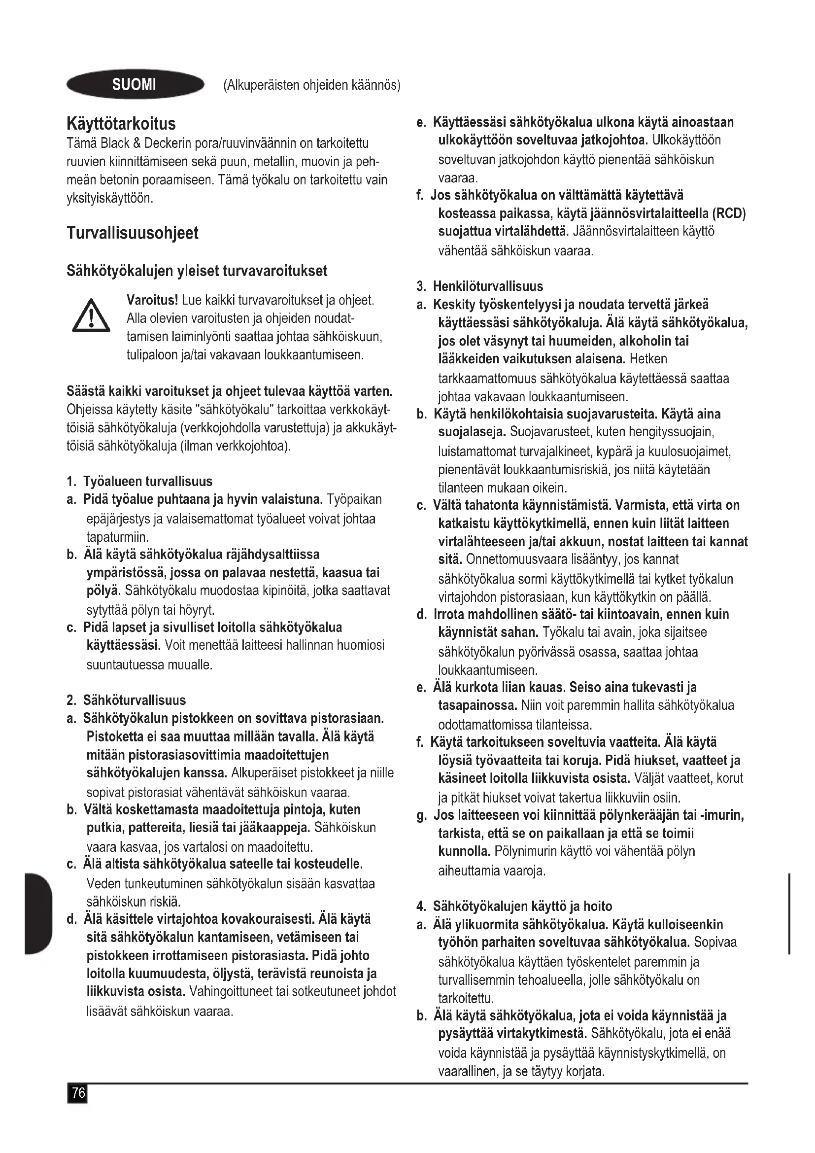 Varoitus! Lue kaikki turvavaroitukset ja ohjeet. Alla olevien varoitusten ja ohjeiden noudat- tamisen laiminlyönti saattaa johtaa sähköiskuun, tulipaloon ja/tai vakavaan loukkaantumiseen. Säästä kaikki varoitukset ja ohjeet tulevaa käyttöä varten. Ohjeissa käytetty käsite "sähkötyökalu" tarkoittaa verkkokäyt- töisiä sähkötyökaluja (verkkojohdolla varustettuja) ja akkukäyt- töisiä sähkötyökaluja (ilman verkkojohtoa).