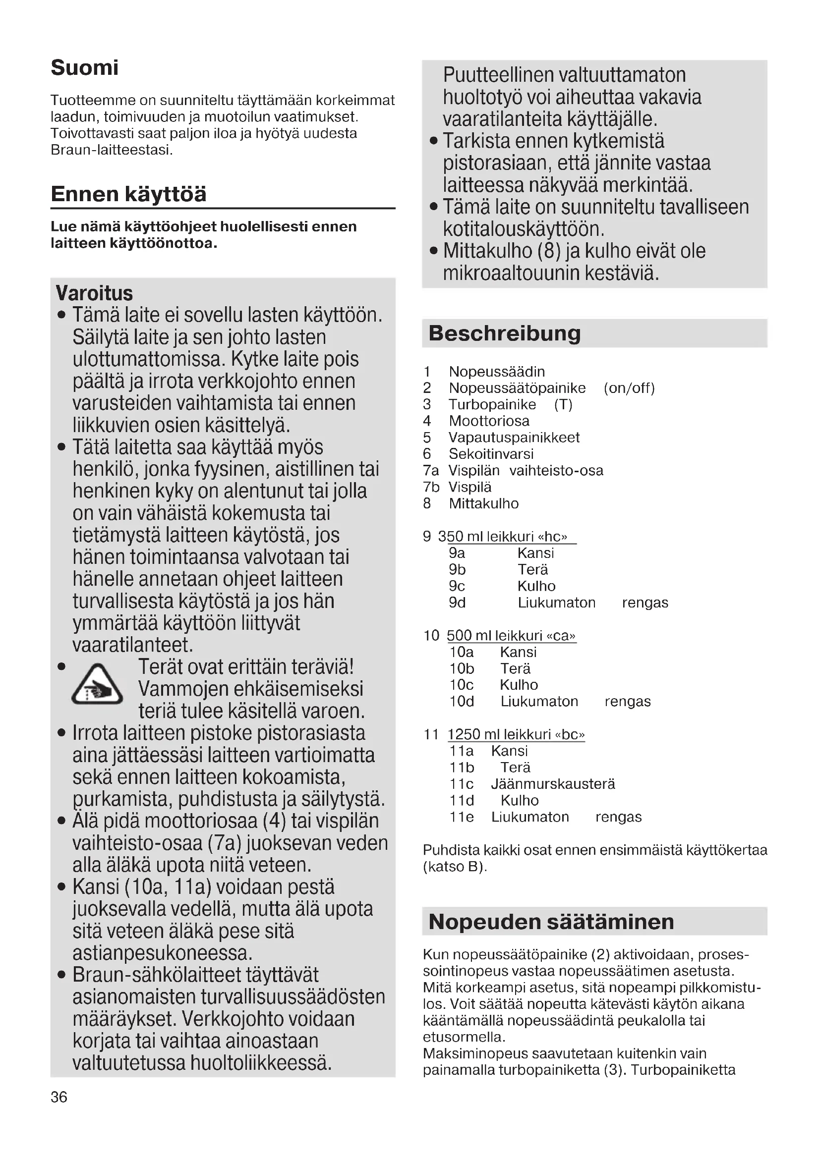 Braun-sähkölaitteet täyttävät asianomaisten turvallisuussäädösten määräykset. Verkkojohto voidaan korjata tai vaihtaa ainoastaan valtuutetussa huoltoliikkeessä. Puutteellinen valtuuttamaton huoltotyö voi aiheuttaa vakavia vaaratilanteita käyttäjälle.