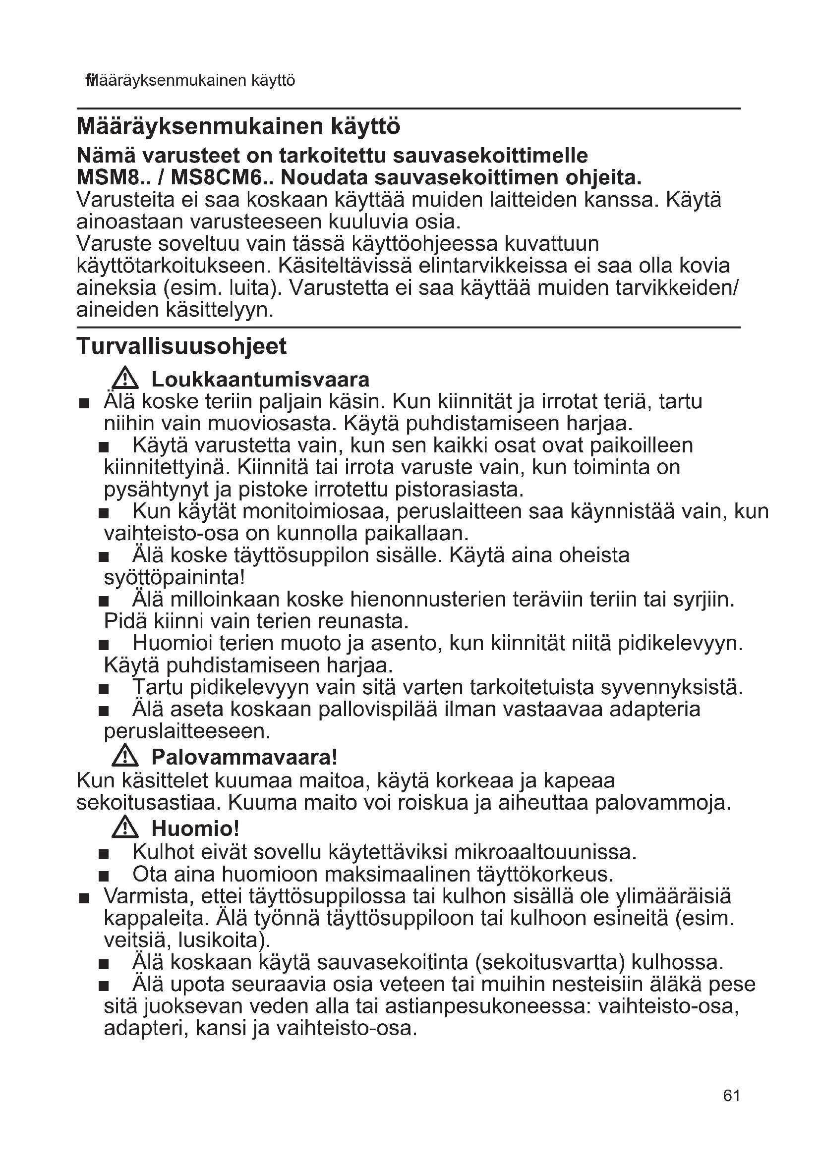 Määräyksenmukainen käyttö Määräyksenmukainen käyttö Nämä varusteet on tarkoitettu sauvasekoittimelle MSM8.. / MS8CM6.. Noudata sauvasekoittimen ohjeita. Varusteita ei saa koskaan käyttää muiden laitteiden kanssa. Käytä ainoastaan varusteeseen kuuluvia osia. Varuste soveltuu vain tässä käyttöohjeessa kuvattuun käyttötarkoitukseen. Käsiteltävissä elintarvikkeissa ei saa olla kovia aineksia (esim. luita). Varustetta ei saa käyttää muiden tarvikkeiden/ aineiden käsittelyyn. Turvallisuusohjeet W Loukkaantumisvaara ■ Älä koske teriin paljain käsin. Kun kiinnität ja irrotat teriä, tartu niihin vain muoviosasta. Käytä puhdistamiseen harjaa. ■ Käytä varustetta vain, kun sen kaikki osat ovat paikoilleen kiinnitettyinä. Kiinnitä tai irrota varuste vain, kun toiminta on pysähtynyt ja pistoke irrotettu pistorasiasta. ■ Kun käytät monitoimiosaa, peruslaitteen saa käynnistää vain, kun vaihteisto-osa on kunnolla paikallaan. ■ Älä koske täyttösuppilon sisälle. Käytä aina oheista syöttöpaininta! ■ Älä milloinkaan koske hienonnusterien teräviin teriin tai syrjiin. Pidä kiinni vain terien reunasta. ■ Huomioi terien muoto ja asento, kun kiinnität niitä pidikelevyyn. Käytä puhdistamiseen harjaa. ■ Tartu pidikelevyyn vain sitä varten tarkoitetuista syvennyksistä. ■ Älä aseta koskaan pallovispilää ilman vastaavaa adapteria peruslaitteeseen. W Palovammavaara! Kun käsittelet kuumaa maitoa, käytä korkeaa ja kapeaa sekoitusastiaa. Kuuma maito voi roiskua ja aiheuttaa palovammoja. W Huomio! ■ Kulhot eivät sovellu käytettäviksi mikroaaltouunissa. ■ Ota aina huomioon maksimaalinen täyttökorkeus. ■ Varmista, ettei täyttösuppilossa tai kulhon sisällä ole ylimääräisiä kappaleita. Älä työnnä täyttösuppiloon tai kulhoon esineitä (esim. veitsiä, lusikoita). ■ Älä koskaan käytä sauvasekoitinta (sekoitusvartta) kulhossa. ■ Älä upota seuraavia osia veteen tai muihin nesteisiin äläkä pese sitä juoksevan veden alla tai astianpesukoneessa: vaihteisto-osa, adapteri, kansi ja vaihteisto-osa.62 Turvallisuusohjeet W Tärkeää! Varuste on ehdottomasti puhdistettava huolellisesti jokaisen käytön jälkeen tai kun sitä ei ole käytetty pitkään aikaan. X ”Puhdistus ja hoito” katso sivu 67 Ennen ensimmäistä käyttöä Uusi varuste on otettava pakkauksesta, puhdistettava ja tarkastettava ennen käyttöä. Huomio! Viallista varustetta ei saa koskaan käyttää! ■ Ota kaikki varusteet pakkauksesta ja poista pakkausmateriaali. ■ Tarkista, että kaikki osat ovat mukana eikä niissä ole näkyviä vaurioita. X Kuva A ■ Puhdista ja kuivaa osat huolellisesti ennen ensimmäistä käyttökertaa. X ”Puhdistus ja hoito” katso sivu 67 Symbolit ja merkinnät Symboli Merkitys