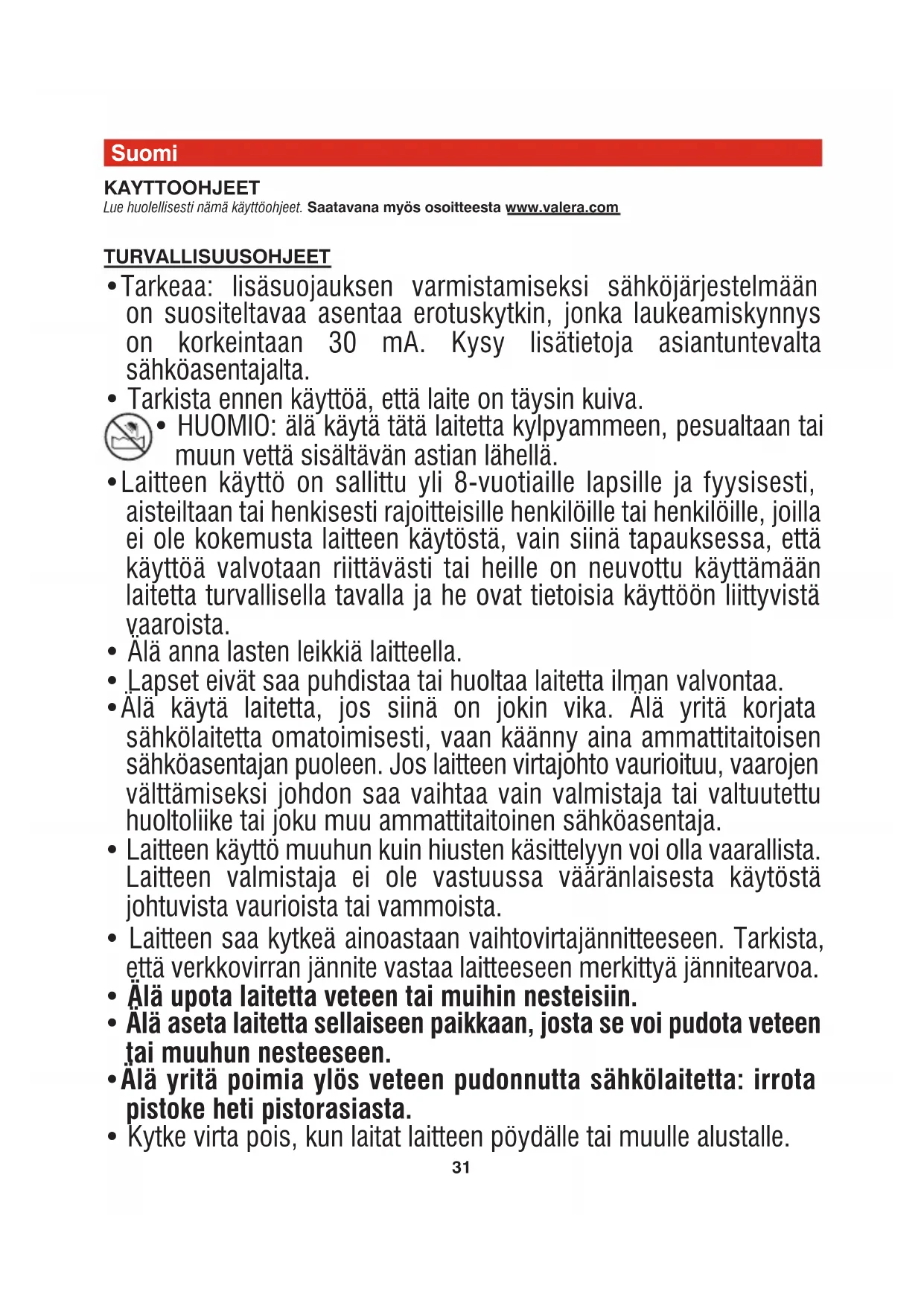 - Älä yritä poimia ylös veteen pudonnutta sähkölaitetta: irrota pistoke heti pistorasiasta.