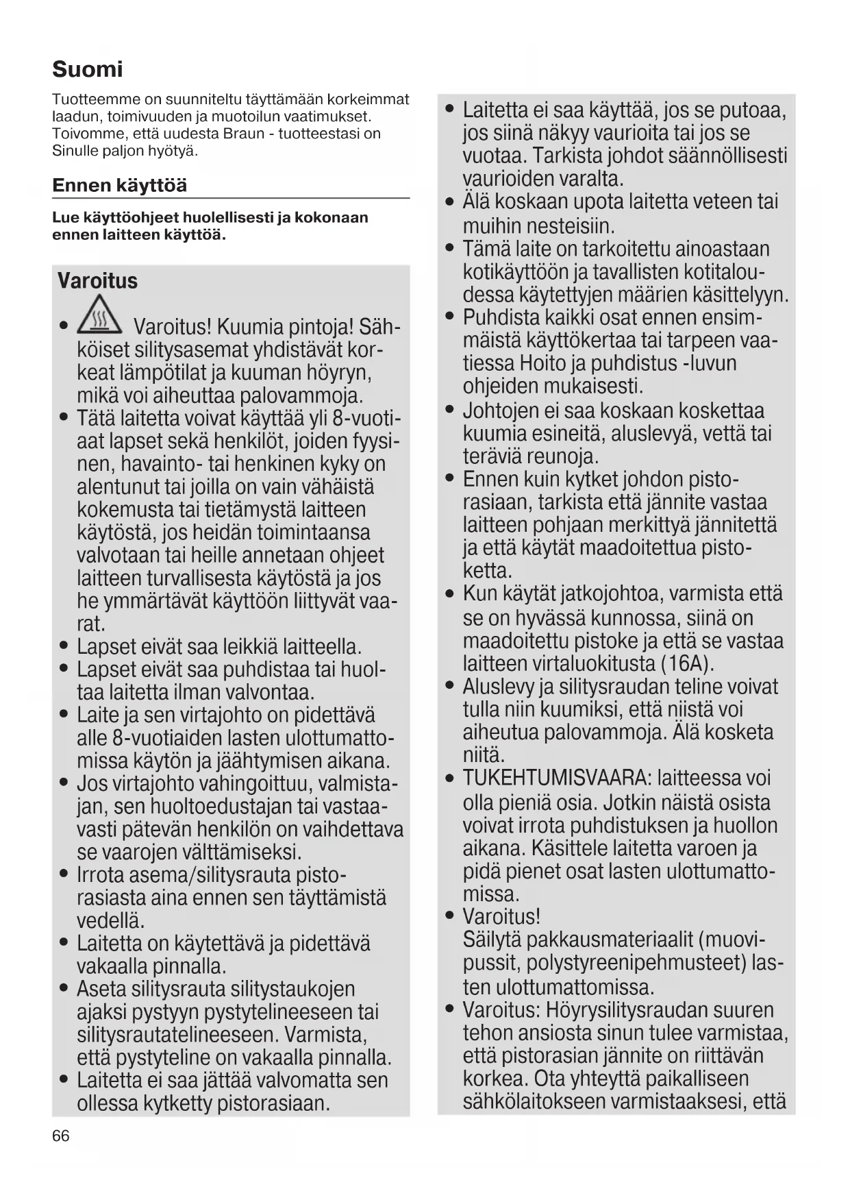 Laitteesta ei tule höyryä. Vesisäiliössä ei ole riittävästi vettä. Irrota laite pistorasiasta; tarkista, onko kalkinpoistosuodatinpatruuna valmisteltu ja asetettu oikein; täytä vesi maksimitasolle; sulje vesisäiliön kansi; kytke laite pistorasiaan ja odota, että lämpötilan hallinnan merkkivalo palaa tasaisesti; paina höyrypainiketta, kunnes aluslevystä tulee höyryä. Jos yllä kuvattu ei ratkaise ongel- maa, toimi seuraavasti: paina nolla- us- ja höyrypainiketta samanaikai- sesti, kunnes höyry alkaa virrata. Kun höyry virtaa, vapauta painik- keet. Höyrypainiketta ei ole painettu. Uusi kalkinpoistosuodatinpatruu- na on asennettu juuri. Kalkinpoistosuodatinpatruuna ei ole asetettu oikein. Kalkinpoiston merkkivalo palaa, ja höyrypainiketta painettaessa silitysraudasta tulee vähemmän tai ei ol- lenkaan höyryä. Kalkinpoistosuodatinpatruuna on vaihdettava. Vaihda kalkinpoistosuodatinpatruu- na ja paina nollauspainiketta 5 se- kuntia, kunnes merkkivalo sammuu. Voit myös käyttää suoloista puhdis- tettua vettä. Jätä tällöin kalkinpois- tosuodatinpatruuna säiliöön ja paina nollauspainiketta 5 sekuntia aina, kun kalkinpoiston merkkivalo syttyy. Laitteesta kuuluu kovaa värinään liittyvää ääntä (hil- jainen pumppausääni on normaalia). Uusi kalkinpoistosuodatinpatruu- na on asennettu juuri. Paina höyrypainiketta, kunnes kova ääni lakkaa ja höyry alkaa virrata aluslevystä. Vesisäiliö on tyhjä. Täytä vesisäiliö ja paina höyry- painiketta, kunnes kova ääni lakkaa ja höyry alkaa virrata aluslevystä. Kalkinpoistosuodatinpatruuna ei ole paikoillaan. Aseta kalkinpoistosuodatinpatruuna säiliöön. Kalkinpoistosuodatinpatruuna on vioittunut tai siinä näkyy hal- keamia. Tarkista kalkinpoistosuodatinpat- ruuna huolella. Jos näet mitään merkkejä vaurioista tai halkeamia, vaihda kalkinpoistosuodatinpatruu- na uuteen. Kun laite kytketään päälle ensimmäistä kertaa, siitä tulee savua/hajua. Jotkut osat on käsitelty tiivistys/ voiteluaineella, joka höyrystyy silitysraudan lämmetessä ensim- mäistä kertaa. Tämä on normaalia ja lakkaa, kun silitysrautaa on käytetty muutaman kerran. Jos savua/hajua tulee vielä laitteen sammuttamisen jälkeenkin, ota yhteys valtuutettuun Braunin asiakaspalveluun. Silitysraudasta tulee liikaa höyryä. Turbo-tila on päällä. Aktivoi iCare- tai ecotila painamalla tilapainiketta. 5712811981-01_CareStyle_1_INT_S6-152.indd 70 08.06.18 11:1471 Aluslevystä tulee (likaisia) vesipisaroita ja roskaa. Kun kalkinpoistosuodatinpa- truuna on vaihdettu, aluslevystä saattaa tihkua vettä. Paina höyrypainiketta useaan ker- taan silitysraudan ollessa poissa silityslaudan päältä. Pyyhi aluslevy kuivaksi liinalla. Kaikki merkkivalot vilkkuvat. Järjestelmävirhe. Irrota järjestelmä pistorasiasta ja kytke se takaisin. Jos ongelma ei ratkea, sammuta laite välittömästi ja ota yhteys valtuutettuun Braun- asiakapalveluun. 5712811981-01_CareStyle_1_INT_S6-152.indd 71 08.06.18 11:1472 Polski Nasze produkty zostały zaprojektowane tak, aby spełniać najwyższe standardy w zakresie jakości, funkcjonalności i wzornictwa. Mamy nadzieję, że nowy produkt fi rmy Braun spełni Państwa oczekiwania. Przed użyciem Przed użyciem urządzenia należy dokładnie i w całości przeczytać instrukcję obsługi. Uwaga