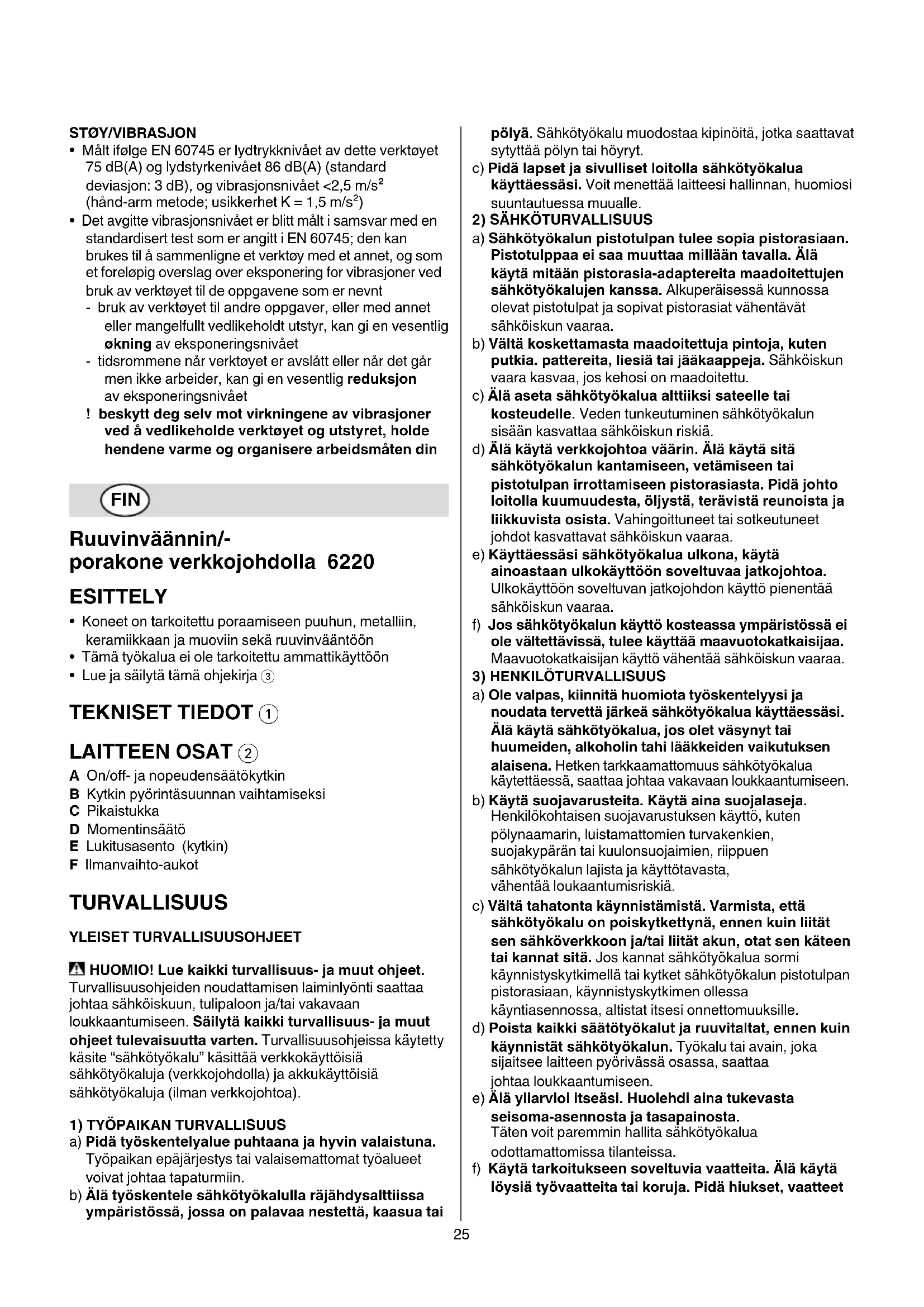 - Lue ja säilytä tämä ohjekirja 3 TEKNISET TIEDOT 1 LAITTEEN OSAT 2 A On/o- ja nopeudensäätökytkin B Kytkin pyörintäsuunnan vaihtamiseksi C Pikaistukka D Momentinsäätö E Lukitusasento (kytkin) F Ilmanvaihto-aukot TURVALLISUUS YLEISET TURVALLISUUSOHJEET HUOMIO! Lue kaikki turvallisuus- ja muut ohjeet. Turvallisuusohjeiden noudattamisen laiminlyönti saattaa johtaa sähköiskuun, tulipaloon ja/tai vakavaan loukkaantumiseen. Säilytä kaikki turvallisuus- ja muut ohjeet tulevaisuutta varten. Turvallisuusohjeissa käytetty käsite “sähkötyökalu” käsittää verkkokäyttöisiä sähkötyökaluja (verkkojohdolla) ja akkukäyttöisiä sähkötyökaluja (ilman verkkojohtoa).