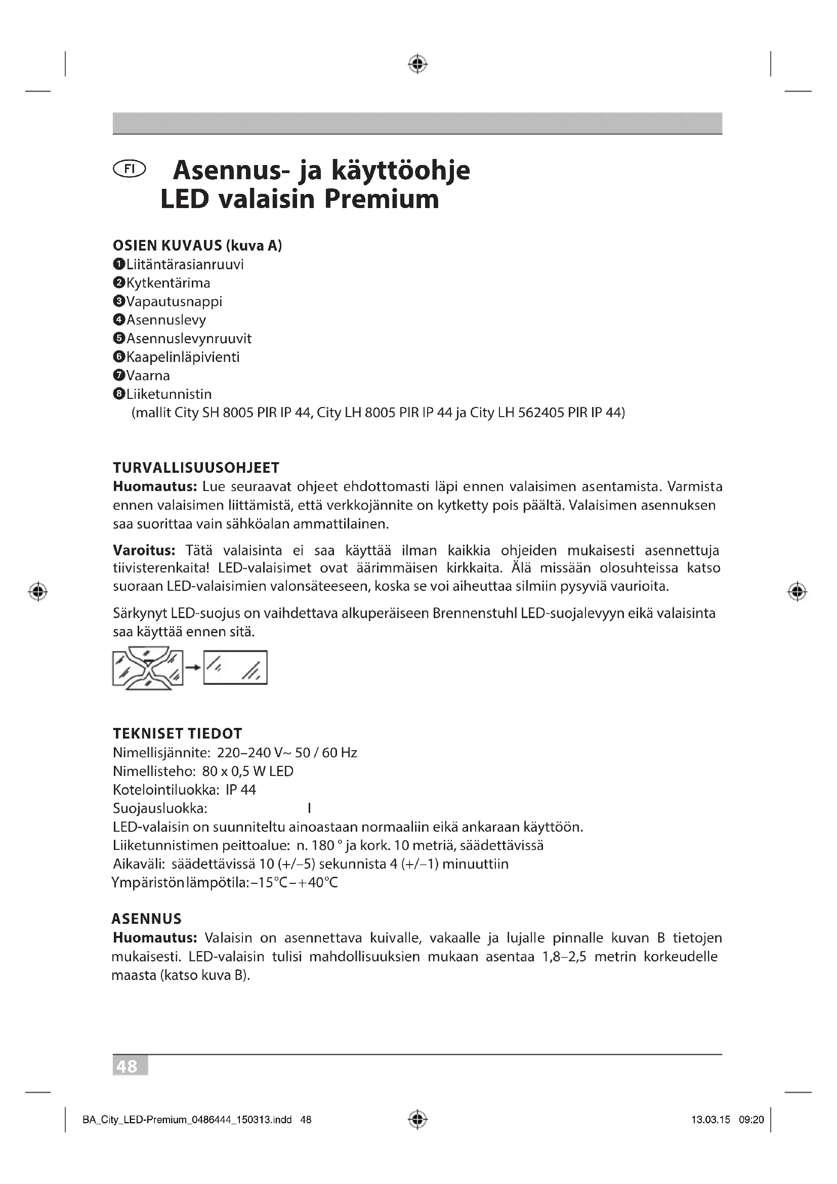 Liiketunnistin (mallit City SH 8005 PIR IP 44, City LH 8005 PIR IP 44 ja City LH 562405 PIR IP 44) TURVALLISUUSOHJEET Huomautus: Lue seuraavat ohjeet ehdottomasti läpi ennen valaisimen asentamista. Varmista ennen valaisimen liittämistä, että verkkojännite on kytketty pois päältä. Valaisimen asennuksen saa suorittaa vain sähköalan ammattilainen. Varoitus: Tätä valaisinta ei saa käyttää ilman kaikkia ohjeiden mukaisesti asennettuja tiivisterenkaita! LED-valaisimet ovat äärimmäisen kirkkaita. Älä missään olosuhteissa katso suoraan LED-valaisimien valonsäteeseen, koska se voi aiheuttaa silmiin pysyviä vaurioita. Särkynyt LED-suojus on vaihdettava alkuperäiseen Brennenstuhl LED-suojalevyyn eikä valaisinta saa käyttää ennen sitä. TEKNISET TIEDOT Nimellisjännite: 220–240V~ 50 / 60Hz Nimellisteho: 80 x 0,5W LED Kotelointiluokka: IP 44 Suojausluokka: I LED-valaisin on suunniteltu ainoastaan normaaliin eikä ankaraan käyttöön. Liiketunnistimen peittoalue: n. 180 ° ja kork. 10metriä, säädettävissä Aikaväli: säädettävissä 10 (+/–5) sekunnista 4 (+/–1) minuuttiin Ymp äristön lämpötila: –15 °C – + 40 °C ASENNUS Huomautus: Valaisin on asennettava kuivalle, vakaalle ja lujalle pinnalle kuvan B tietojen mukaisesti. LED-valaisin tulisi mahdollisuuksien mukaan asentaa 1,8–2,5 metrin korkeudelle maasta (katso kuva B). BA_City_LED-Premium_0486444_150313.indd 48 13.03.15 09:2049