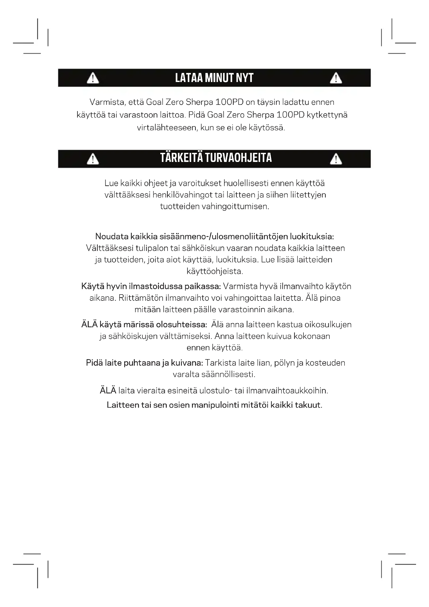 goalzero.com/warranty にて製品保証 を必ず有効にしてください49Varmista, että Goal Zero Sherpa 100PD on täysin ladattu ennen käyttöä tai varastoon laittoa. Pidä Goal Zero Sherpa 100PD kytkettynä virtalähteeseen, kun se ei ole käytössä. Lue kaikki ohjeet ja varoitukset huolellisesti ennen käyttöä välttääksesi henkilövahingot tai laitteen ja siihen liitettyjen tuotteidenvahingoittumisen. Noudata kaikkia sisäänmeno-/ulosmenoliitäntöjen luokituksia: Välttääksesi tulipalon tai sähköiskun vaaran noudata kaikkia laitteen ja tuotteiden, joita aiot käyttää, luokituksia. Lue lisää laitteiden käyttöohjeista. Käytä hyvin ilmastoidussa paikassa: Varmista hyvä ilmanvaihto käytön aikana. Riittämätön ilmanvaihto voi vahingoittaa laitetta. Älä pinoa mitään laitteen päälle varastoinnin aikana. ÄLÄ käytä märissä olosuhteissa: Älä anna laitteen kastua oikosulkujen ja sähköiskujen välttämiseksi. Anna laitteen kuivua kokonaan ennenkäyttöä. Pidä laite puhtaana ja kuivana: Tarkista laite lian, pölyn ja kosteuden varalta säännöllisesti. ÄLÄ laita vieraita esineitä ulostulo- tai ilmanvaihtoaukkoihin. Laitteen tai sen osien manipulointi mitätöi kaikki takuut.