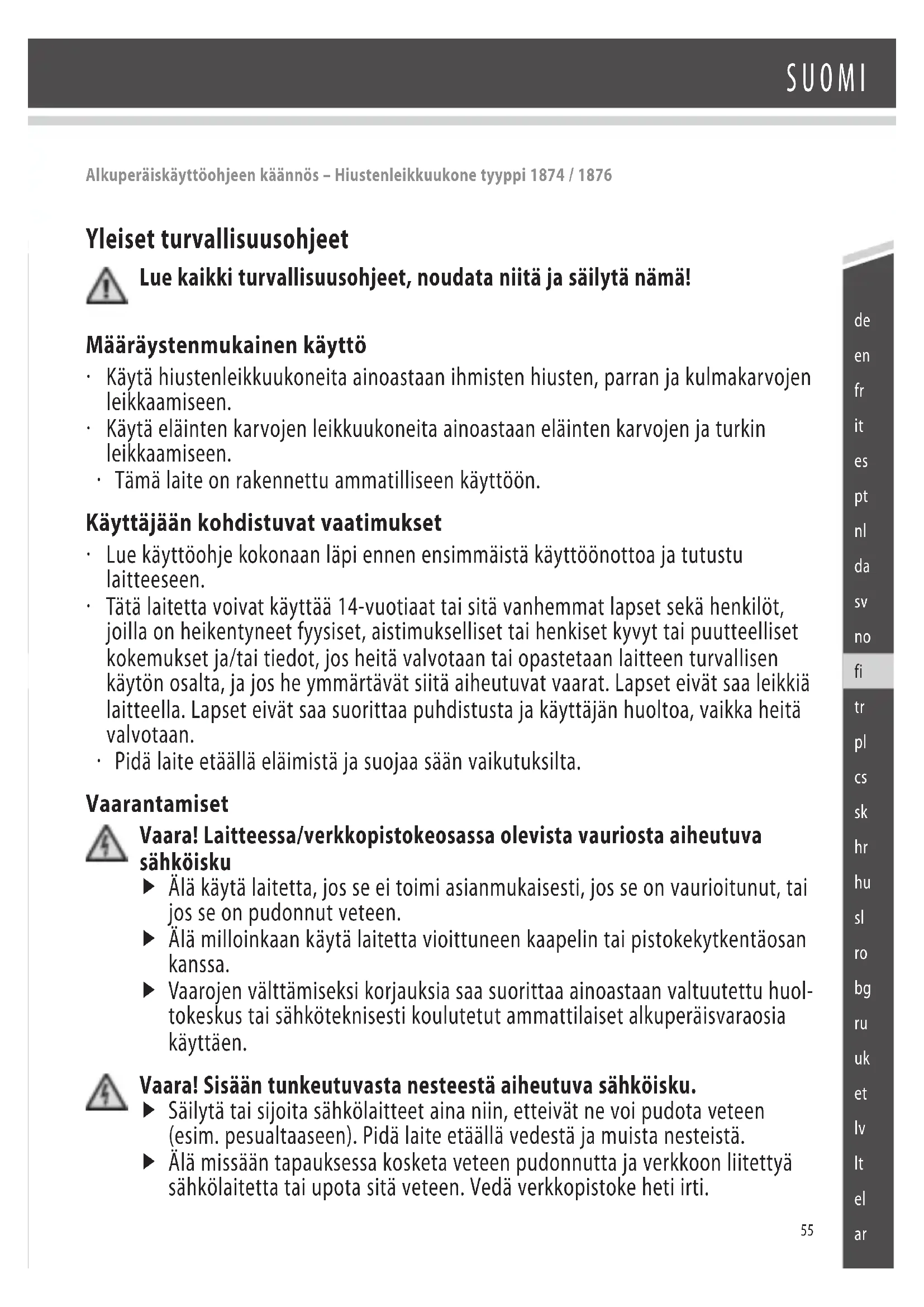 - Pidä laite etäällä eläimistä ja suojaa sään vaikutuksilta. Vaarantamiset Vaara! Laitteessa/verkkopistokeosassa olevista vauriosta aiheutuva sähköisku f Älä käytä laitetta, jos se ei toimi asianmukaisesti, jos se on vaurioitunut, tai jos se on pudonnut veteen. f Älä milloinkaan käytä laitetta vioittuneen kaapelin tai pistokekytkentäosan kanssa. f Vaarojen välttämiseksi korjauksia saa suorittaa ainoastaan valtuutettu huol- tokeskus tai sähköteknisesti koulutetut ammattilaiset alkuperäisvaraosia käyttäen. Vaara! Sisään tunkeutuvasta nesteestä aiheutuva sähköisku. f Säilytä tai sijoita sähkölaitteet aina niin, etteivät ne voi pudota veteen (esim. pesualtaaseen). Pidä laite etäällä vedestä ja muista nesteistä. f Älä missään tapauksessa kosketa veteen pudonnutta ja verkkoon liitettyä sähkölaitetta tai upota sitä veteen. Vedä verkkopistoke heti irti. Alkuperäiskäyttöohjeen käännös – Hiustenleikkuukone tyyppi 1874 / 187656 SUOMI