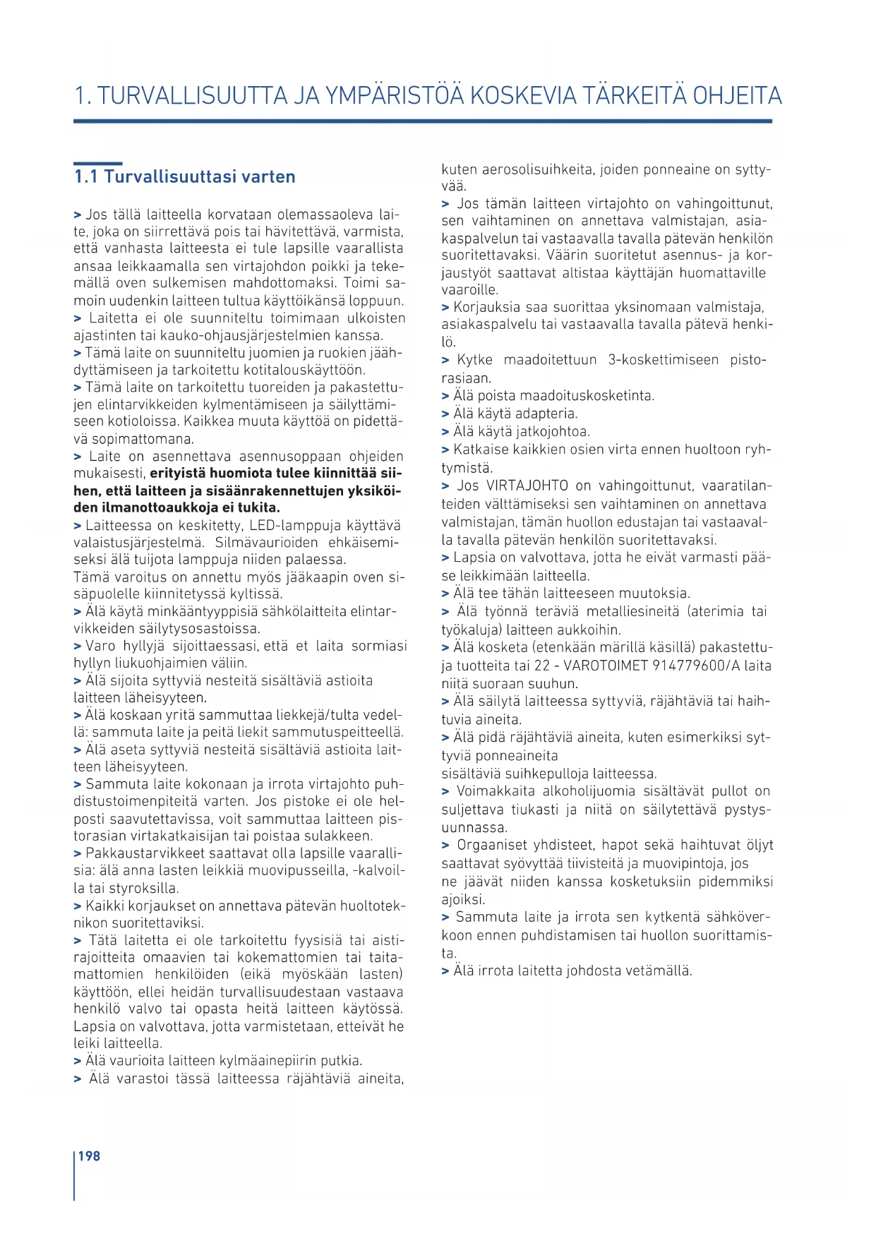 > Jos tällä laitteella korvataan olemassaoleva lai- te, joka on siirrettävä pois tai hävitettävä, varmista, että vanhasta laitteesta ei tule lapsille vaarallista ansaa leikkaamalla sen virtajohdon poikki ja teke- mällä oven sulkemisen mahdottomaksi. Toimi sa- moin uudenkin laitteen tultua käyttöikänsä loppuun. > Laitetta ei ole suunniteltu toimimaan ulkoisten ajastinten tai kauko-ohjausjärjestelmien kanssa. > Tämä laite on suunniteltu juomien ja ruokien jääh- dyttämiseen ja tarkoitettu kotitalouskäyttöön. > Tämä laite on tarkoitettu tuoreiden ja pakastettu- jen elintarvikkeiden kylmentämiseen ja säilyttämi- seen kotioloissa. Kaikkea muuta käyttöä on pidettä- vä sopimattomana. > Laite on asennettava asennusoppaan ohjeiden mukaisesti, erityistä huomiota tulee kiinnittää sii- hen, että laitteen ja sisäänrakennettujen yksiköi- den ilmanottoaukkoja ei tukita. > Laitteessa on keskitetty, LED-lamppuja käyttävä valaistusjärjestelmä. Silmävaurioiden ehkäisemi- seksi älä tuota lamppuja niiden palaessa. Tämä varoitus on annettu myös jääkaapin oven si- säpuolelle kiinnitetyssä kyltissä. > Älä käytä minkääntyyppisiä sähkölaitteita elintar- vikkeiden säilytysosastoissa. > Varo hyllyjä soittaessasi, että et laita sormiasi hyllyn liukuohjaimien väliin. > Älä soita syttyviä nesteitä sisältäviä astioita laitteen läheisyyteen. > Älä koskaan yritä sammuttaa liekkejä/tulta vedel- lä: sammuta laite ja peitä liekit sammutuspeitteellä. > Älä aseta syttyviä nesteitä sisältäviä astioita lait- teen läheisyyteen. > Sammuta laite kokonaan ja irrota virtajohto puh- distustoimenpiteitä varten. Jos pistoke ei ole hel- posti saavutettavissa, voit sammuttaa laitteen pis- torasian virtakatkaisan tai poistaa sulakkeen. > Pakkaustarvikkeet saattavat olla lapsille vaaralli- sia: älä anna lasten leikkiä muovipusseilla, -kalvoil- la tai styroksilla. > Kaikki korjaukset on annettava pätevän huoltotek- nikon suoritettaviksi. > Tätä laitetta ei ole tarkoitettu fyysisiä tai aisti- rajoitteita omaavien tai kokemattomien tai taita- mattomien henkilöiden (eikä myöskään lasten) käyttöön, ellei heidän turvallisuudestaan vastaava henkilö valvo tai opasta heitä laitteen käytössä. Lapsia on valvottava, jotta varmistetaan, etteivät he leiki laitteella. > Älä vaurioita laitteen kylmäainepiirin putkia. > Älä varastoi tässä laitteessa räjähtäviä aineita, kuten aerosolisuihkeita, joiden ponneaine on sytty- vää. > Jos tämän laitteen virtajohto on vahingoittunut, sen vaihtaminen on annettava valmistajan, asia- kaspalvelun tai vastaavalla tavalla pätevän henkilön suoritettavaksi. Väärin suoritetut asennus- ja kor- jaustyöt saattavat altistaa käyttäjän huomattaville vaaroille. > Korjauksia saa suorittaa yksinomaan valmistaja, asiakaspalvelu tai vastaavalla tavalla pätevä henki- lö. > Kytke maadoitettuun 3-koskettimiseen pisto- rasiaan. > Älä poista maadoituskosketinta. > Älä käytä adapteria. > Älä käytä jatkojohtoa. > Katkaise kaikkien osien virta ennen huoltoon ryh- tymistä. > Jos VIRTAJOHTO on vahingoittunut, vaaratilan- teiden välttämiseksi sen vaihtaminen on annettava valmistajan, tämän huollon edustajan tai vastaaval- la tavalla pätevän henkilön suoritettavaksi. > Lapsia on valvottava, jotta he eivät varmasti pää- se leikkimään laitteella. > Älä tee tähän laitteeseen muutoksia. > Älä työnnä teräviä metalliesineitä (aterimia tai työkaluja) laitteen aukkoihin. > Älä kosketa (etenkään märillä käsillä) pakastettu- ja tuotteita tai 22 - VAROTOIMET 914779600/A laita niitä suoraan suuhun. > Älä säilytä laitteessa syttyviä, räjähtäviä tai haih- tuvia aineita. > Älä pidä räjähtäviä aineita, kuten esimerkiksi syt- tyviä ponneaineita sisältäviä suihkepulloja laitteessa. > Voimakkaita alkoholuomia sisältävät pullot on suljettava tiukasti ja niitä on säilytettävä pystys- uunnassa. > Orgaaniset yhdisteet, hapot sekä haihtuvat öljyt saattavat syövyttää tiivisteitä ja muovipintoja, jos ne jäävät niiden kanssa kosketuksiin pidemmiksi ajoiksi. > Sammuta laite ja irrota sen kytkentä sähköver- koon ennen puhdistamisen tai huollon suorittamis- ta. > Älä irrota laitetta johdosta vetämällä.199 FIFI