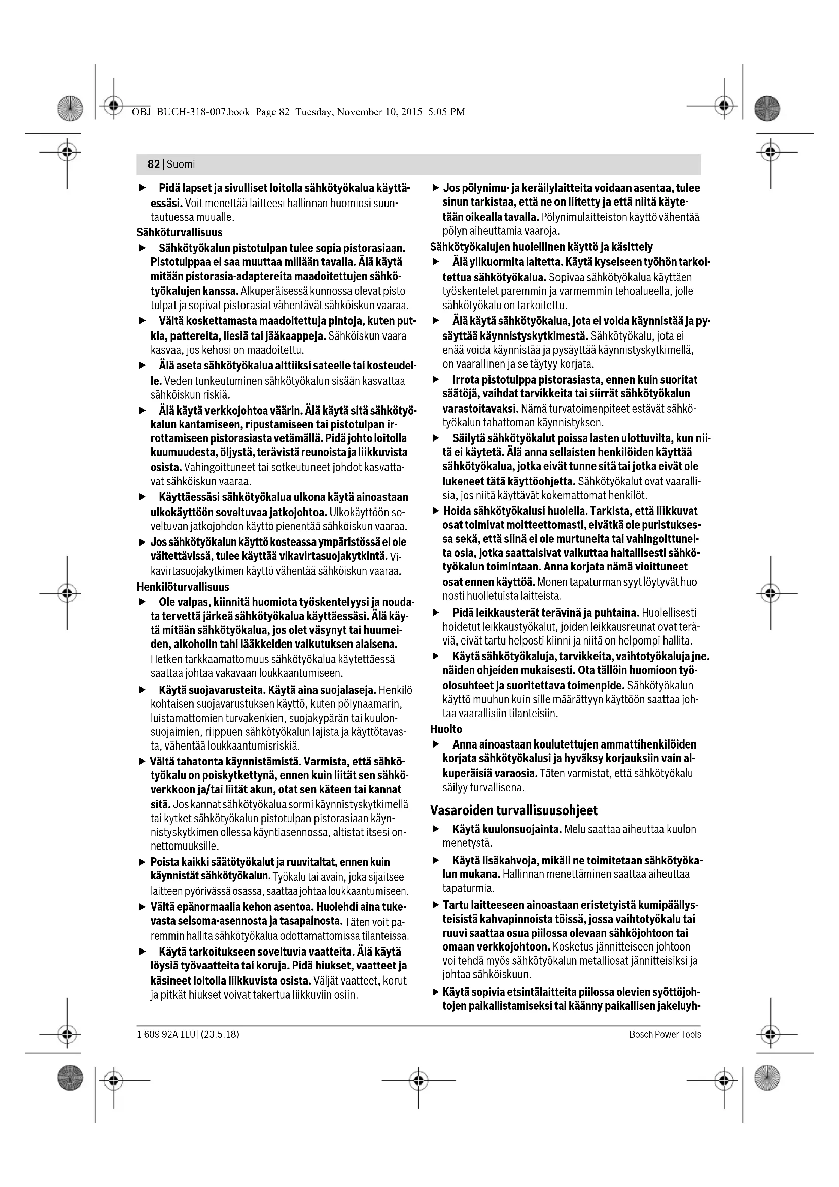 Käytä sopivia etsintälaitteita piilossa olevien syöttöjoh- tojen paikallistamiseksi tai käänny paikallisen jakeluyh- OBJ_BUCH-318-007.book Page 82 Tuesday, November 10, 2015 5:05 PMSuomi | 83 Bosch Power Tools1 609 92A 1LU | (23.5.18) tiön puoleen. Kosketus sähköjohtoon saattaa johtaa tulipa- loon ja sähköiskuun. Kaasuputken vahingoittaminen saattaa johtaa räjähdykseen. Vesijohtoon tunkeutuminen aiheuttaa aineellista vahinkoa tai saattaa johtaa sähköiskuun. Pidä työn aikana sähkötyökalua kaksin käsin ja ota tu- keva seisoma-asento. Sähkötyökalua pystyy ohjaamaan varmemmin kahdella kädellä. Varmista työkappale. Kiinnityslaitteilla tai ruuvipenkkiin kiinnitetty työkappale pysyy tukevammin paikoillaan kuin kädessä pidettynä.