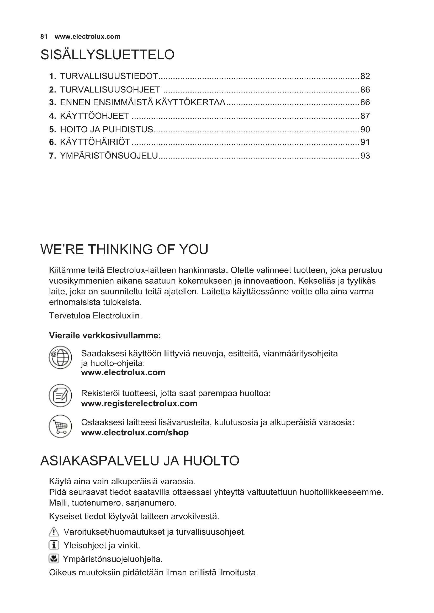 Saadaksesi kayttoon liittyvia neuvoja, esitteita, vianmaaritysohjeita ja huolto-ohjeita: www.electrolux.com