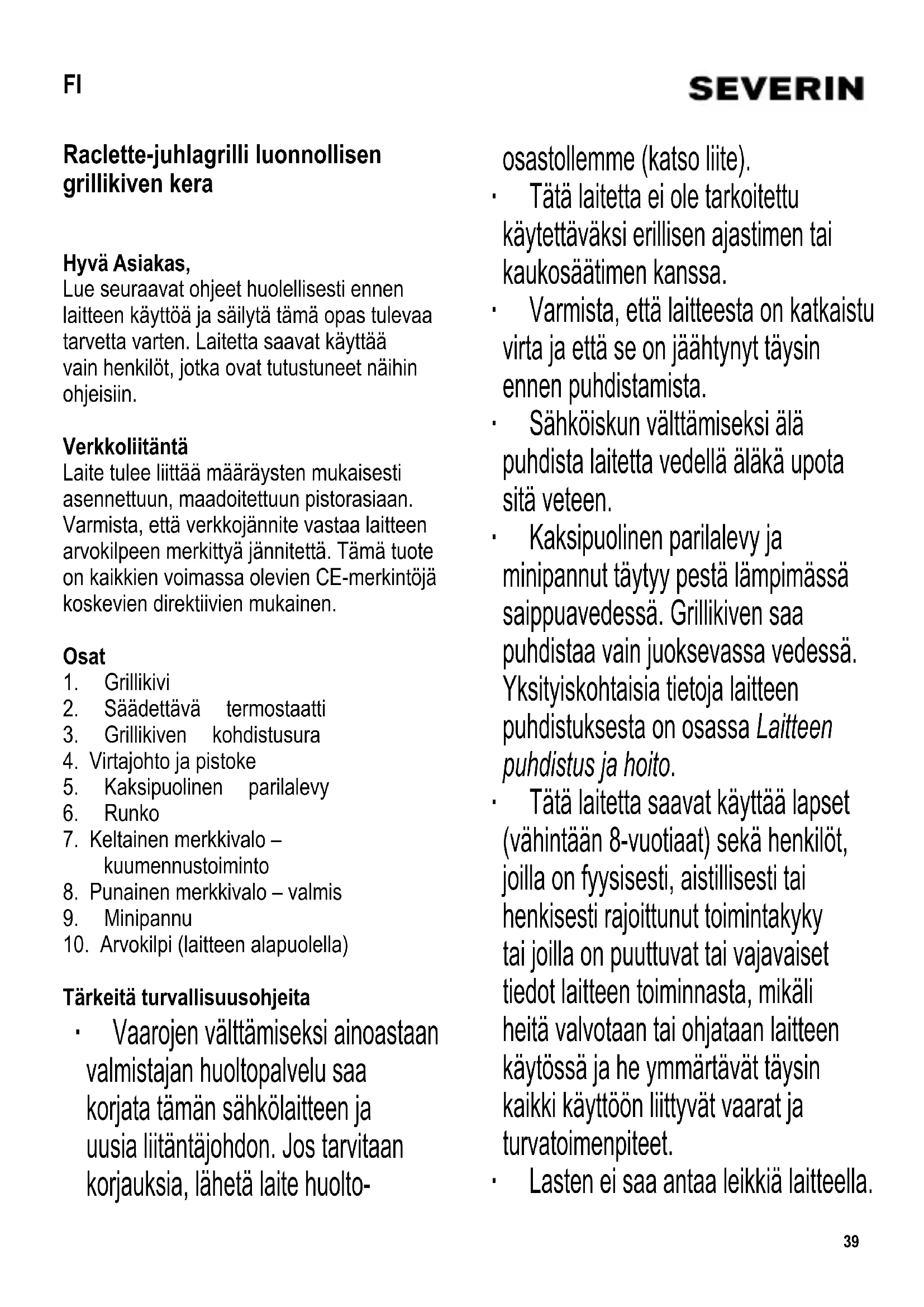 Tärkeitä turvallisuusohjeita ∙ Vaarojen välttämiseksi ainoastaan valmistajan huoltopalvelu saa korjata tämän sähkölaitteen ja uusia liitäntäjohdon. Jos tarvitaan korjauksia, lähetä laite huolto- osastollemme (katso liite). ∙ Tätä laitetta ei ole tarkoitettu käytettäväksi erillisen ajastimen tai kaukosäätimen kanssa. ∙ Varmista, että laitteesta on katkaistu virta ja että se on jäähtynyt täysin ennen puhdistamista. ∙ Sähköiskun välttämiseksi älä puhdista laitetta vedellä äläkä upota sitä veteen. ∙ Kaksipuolinen parilalevy ja minipannut täytyy pestä lämpimässä saippuavedessä. Grillikiven saa puhdistaa vain juoksevassa vedessä. Yksityiskohtaisia tietoja laitteen puhdistuksesta on osassa Laitteen puhdistus ja hoito. ∙ Tätä laitetta saavat käyttää lapset (vähintään 8-vuotiaat) sekä henkilöt, joilla on fyysisesti, aistillisesti tai henkisesti rajoittunut toimintakyky tai joilla on puuttuvat tai vajavaiset tiedot laitteen toiminnasta, mikäli heitä valvotaan tai ohjataan laitteen käytössä ja he ymmärtävät täysin kaikki käyttöön liittyvät vaarat ja turvatoimenpiteet. ∙ Lasten ei saa antaa leikkiä laitteella. FI40 ∙ Lasten ei saa antaa tehdä laitteen puhdistus- tai huoltotoimenpiteitä, elleivät he ole aikuisen valvonnassa sekä vähintään 8 vuotta vanhoja. ∙ Laite ja sen liitäntäjohto täytyy aina pitää alle 8-vuotiaiden ulottumattomissa. ∙ Varoitus: Pidä lapset poissa pakkausmateriaalien luota potentiaalisen vaaratilanteen esim. tukehtumisvaaran vuoksi. ∙ Ennen käyttöönottoa tarkista laite ja mahdolliset lisäosat vaurioiden varalta. Jos laite on esimerkiksi pudonnut kovalle pinnalle tai liitäntäjohdon vetämiseen on käytetty liikaa voimaa, laitetta ei saa enää käyttää: näkymättömätkin vauriot voivat aiheuttaa laitetta käytettäessä vaaratilanteita. ∙ Laitteen pinnat, kaksipuolinen parilalevy, grillikivi ja minipannut kuumenevat käytön aikana. Varoitus: Palovammojen vaara on olemassa. ∙ Älä koskaan poistu paikalta laitteen ollessa toimintakunnossa. ∙ Älä jätä liitäntäjohtoa roikkumaan äläkä anna sen koskettaa kuumia osia. ∙ Käytön aikana parilan on oltava tulenkestävällä, roiskeet ja tahrautumisen kestävällä työtasolla. Rasvaista tai nestepitoista ruokaa valmistettaessa ei aina ole mahdollista välttää roiskumista. ∙ Älä aseta grilliä seinän viereen tai nurkkaan ja varmista, ettei sen lähellä ole tulenarkoja materiaaleja. ∙ Ennen käyttöä kaksipuolinen parilalevy ja grillikivi on asetettava laitteen päälle kuumennuselementin yläpuolelle. ∙ Irrota pistotulppa pistorasiasta aina - käytön jälkeen, - jos laitteessa on käyttöhäiriö, - ennen laitteen puhdistamista. ∙ Kun irrotat pistotulpan pistorasiasta, älä vedä liitäntäjohdosta; tartu aina pistotulppaan. ∙ Valmistaja ei ole vastuussa mahdollisista vaurioista, jos ne johtuvat laitteen väärinkäytöstä tai käyttöohjeiden laiminlyömisestä. ∙ Tämä laite on tarkoitettu kotitalouskäyttöön tai vastaavaan, kuten - toimistot ja muut kaupalliset ympäristöt - maatalousyritykset - hotellien, motellien jne. ja vastaavien yritysten asiakkaat - aamiaisen ja majoituksen tarjoavat majatalot. Käyttö Ennen ensimmäistä käyttöönottoa ∙ Poista kaikki pakkausmateriaali. ∙ Puhdista kaksipuolinen parilalevy, grillikivi ja minipannut kostealla liinalla. ∙ Lämmitä laitetta ja minipannuja noin 10 minuutin ajan tyhjänä, jotta laitteen ensimmäisen käyttökerran aikainen tyypillinen ominaishaju haihtuu (kevyttä savunmuodostusta voi olla havaittavissa). Sen takia täytyy varmistaa riittävä tuuletus avaamalla ikkuna tai parvekkeen ovi. ∙ Puhdista laite tämän jälkeen kappaleessa Laitteen puhdistus ja hoito olevan kuvauksen mukaisesti. Kivialusta ∙ Kiinnitä kivialusta lämpövastuksen päälle kiillotettu puoli ylöspäin. Varoitus: vältä asettamasta kylmää kivialustaa kuumalle41 lämpövastukselle. ∙ Kivialustalla voidaan kypsentää vihanneksia, lihaviipaleita, kalaa jne. ∙ Alusta on luonnonkiveä. Lämpötilan vaihteluiden aikana tapahtuva luonnollinen laajentuminen ja viileneminen aiheuttaa pieniä halkeamia ja värin tummumista. Tämä on normaalia, eikä vaikuta haitallisesti laitteen toimintaan. ∙ Älä aseta kivialustalle jäistä ruokaa tai etikkaa sisältäviä ruoka-aineita (esim. suolakurkkuja tai sinappia). Kaksipuolinen parilalevy ∙ Aseta parilalevy laitteeseen kuumennuselementin päälle. ∙ Parilalevyä voidaan käyttää uurrepuoli ylöspäin normaaliin grillaamiseen. Parilalevyä pitää voidella hieman ennen käyttöä. Kääntöpuoli soveltuu 4 pienen ohukaisen tai pannukakun paistamiseen. Säädettävä termostaatti ja merkkivalo Jos termostaattinuppi on asetettu maksimisäätöön (oikea asento), kuumennuselementti on päällä suurimman osan ajasta. Jos termostaattinuppia käännetään vasemmalle (matalampi säätö), kuumennuselementti sammuu ajoittain ja kytkeytyy sitten päälle uudestaan. Keltainen merkkivalo palaa niin kauan kun kuumennuselementti on kytkettynä päälle. Kun ruoka on valmista, käännä termostaatti pienimpään asentoonsa ja vedä verkkopistoke irti. Käyttö ∙ Aseta grillikivi ja kaksipuolinen parilalevy laitteen päälle ja varmista samalla, että grillikivessä oleva kohdistusura on kiinnitetty kunnolla kannattimen ulokkeisiin. Käyttöturvallisuutta varten parilalevyssä olevan lisäreunaman on istuttava tukevasti ulokkeiden edessä kannattimen päällä. ∙ Kytke pistoke sopivaan pistorasiaan ja työnnä termostaattia oikealle pääteasentoon. ∙ Anna laitteen esilämmetä noin 10 minuutin ajan, jotta saavutetaan tarvittava lämpötila. Grillikiven käyttö edellyttää kuitenkin noin 25 minuutin esilämmitysaikaa. ∙ Aseta grillattava ruoka tarpeen mukaan joko parilalevylle tai kivelle. Parilalevyä voidaan käyttää myös ohukaisten tai pannukakkujen valmistamiseen. ∙ Aseta raclette-juust