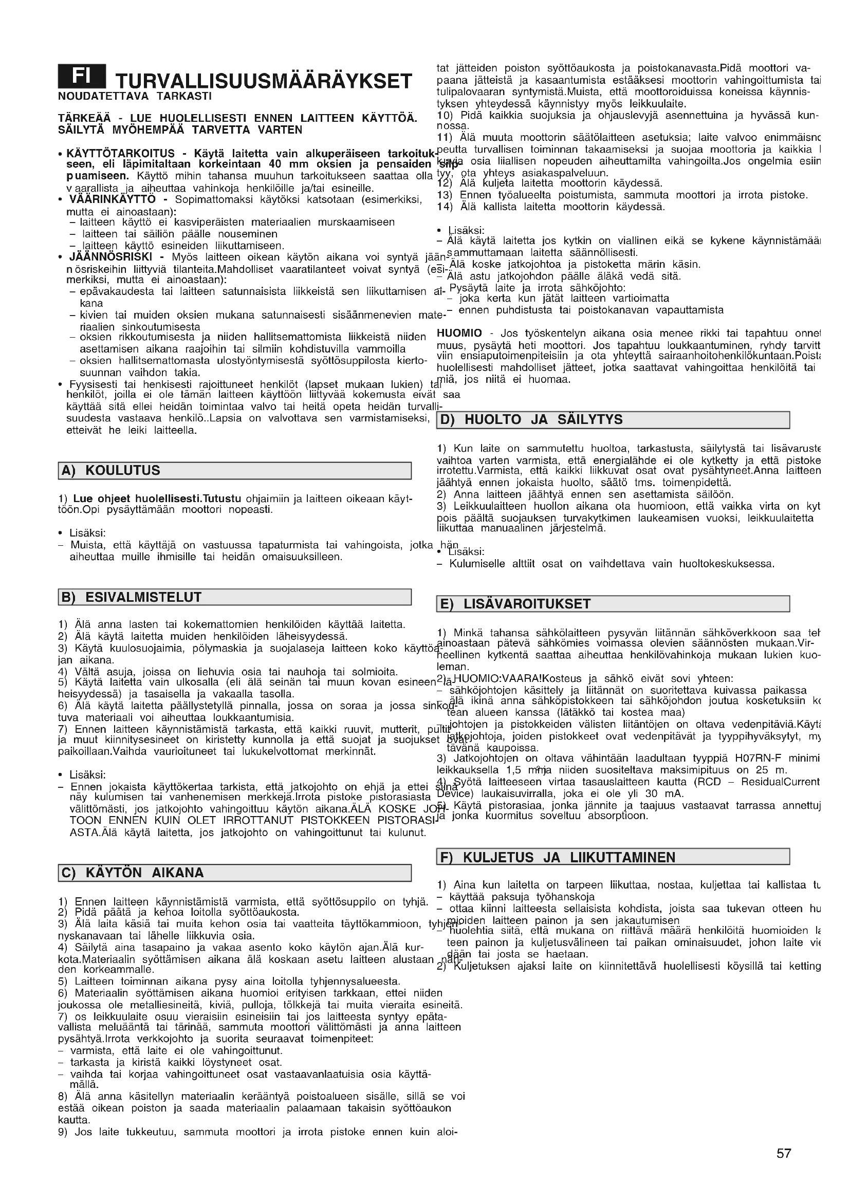 - Lisäksi: – Kulumiselle alttiit osat on vaihdettava vain huoltokeskuksessa.