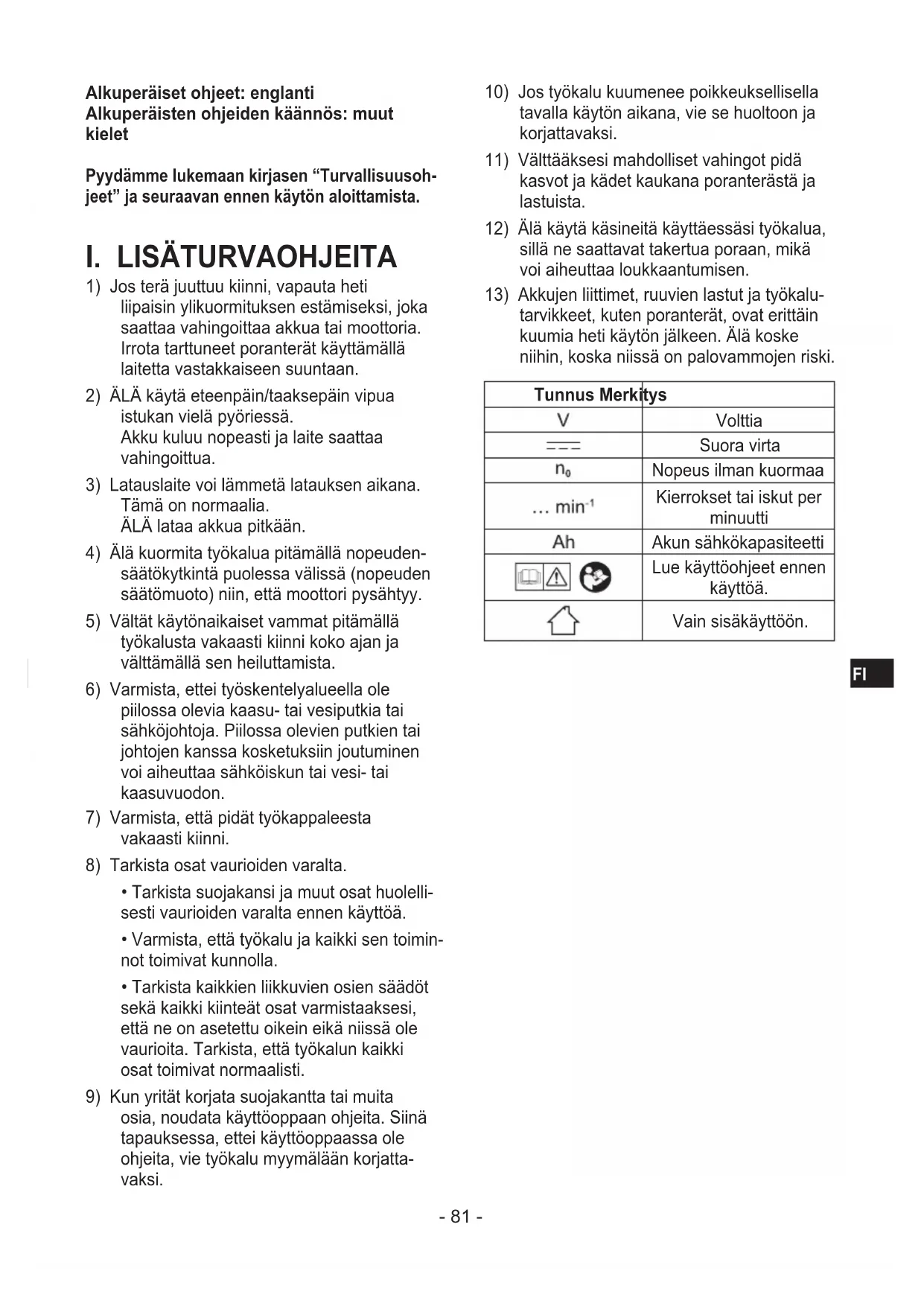 tarvikkeet, kuten poranterät, ovat erittäin kuumia heti käytön jälkeen. Älä koske niihin, koska niissä on palovammojen riski. Tunnus Merkitys Volttia Suora virta Nopeus ilman kuormaa Kierrokset tai iskut per minuutti Akun sähkökapasiteetti Lue käyttöohjeet ennen käyttöä. Vain sisäkäyttöön.- 82 -