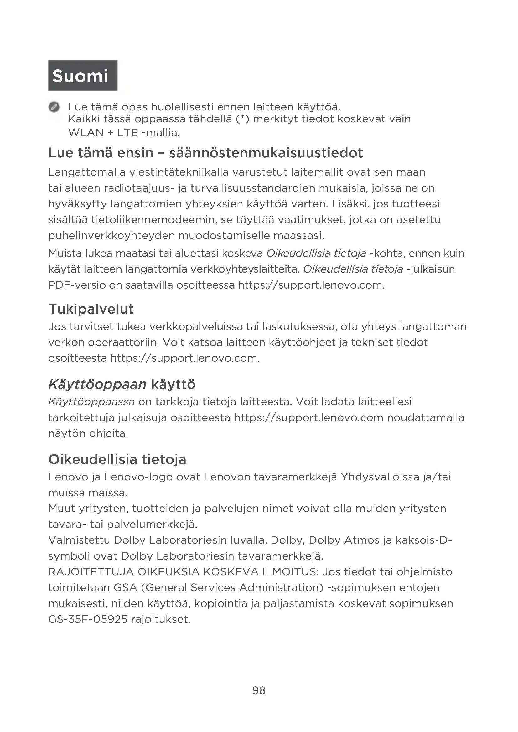 Lue tämä ensin – säännöstenmukaisuustiedot Langattomalla viestintätekniikalla varustetut laitemallit ovat sen maan tai alueen radiotaajuus- ja turvallisuusstandardien mukaisia, joissa ne on hyväksytty langattomien yhteyksien käyttöä varten. Lisäksi, jos tuotteesi sisältää tietoliikennemodeemin, se täyttää vaatimukset, jotka on asetettu puhelinverkkoyhteyden muodostamiselle maassasi. Muista lukea maatasi tai aluettasi koskeva Oikeudellisia tietoja -kohta, ennen kuin käytät laitteen langattomia verkkoyhteyslaitteita. Oikeudellisia tietoja -julkaisun PDF-versio on saatavilla osoitteessa https://support.lenovo.com. Tukipalvelut Jos tarvitset tukea verkkopalveluissa tai laskutuksessa, ota yhteys langattoman verkon operaattoriin. Voit katsoa laitteen käyttöohjeet ja tekniset tiedot osoitteesta https://support.lenovo.com. Käyttöoppaan käyttö Käyttöoppaassa on tarkkoja tietoja laitteesta. Voit ladata laitteellesi tarkoitettuja julkaisuja osoitteesta https://support.lenovo.com noudattamalla näytön ohjeita. Oikeudellisia tietoja Lenovo ja Lenovo-logo ovat Lenovon tavaramerkkejä Yhdysvalloissa ja/tai muissa maissa. Muut yritysten, tuotteiden ja palvelujen nimet voivat olla muiden yritysten tavara- tai palvelumerkkejä. Valmistettu Dolby Laboratoriesin luvalla. Dolby, Dolby Atmos ja kaksois-D- symboli ovat Dolby Laboratoriesin tavaramerkkejä. RAJOITETTUJA OIKEUKSIA KOSKEVA ILMOITUS: Jos tiedot tai ohjelmisto toimitetaan GSA (General Services Administration) -sopimuksen ehtojen mukaisesti, niiden käyttöä, kopiointia ja paljastamista koskevat sopimuksen GS-35F-05925 rajoitukset. Suomi99 Laitteen yhteenveto Malli Versio Lenovo YT-X705F WLAN Lenovo YT-X705L LTE Lenovo YT-X705X LTE+puhe