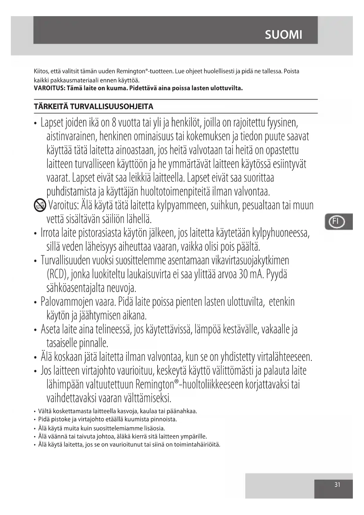 Jotta vältettäisiin vaarallisista aineista ympäristölle ja terveydelle koituvat haitat, näillä symboleilla varustettuja laitteita sekä ladattavia ja kertakäyttöisiä paristoja ei saa hävittää lajittelemattomana sekajätteenä. Hävitä sähkö- ja elektroniikkatuotteet sekä, mikäli sovellettavissa, ladattavat ja kertakäyttöiset paristot asianmukaiseen viralliseen kierrätys-/keräilypisteeseen.34 Obrigado por adquirir este novo produto Remington®. Leia o manual de instruções e conserve-o em lugar seguro. Retire todo o material de embalagem antes do uso. ADVERTÊNCIA: este aparelho aquece. Mantenha-o afastado do alcance das crianças a todo o momento.