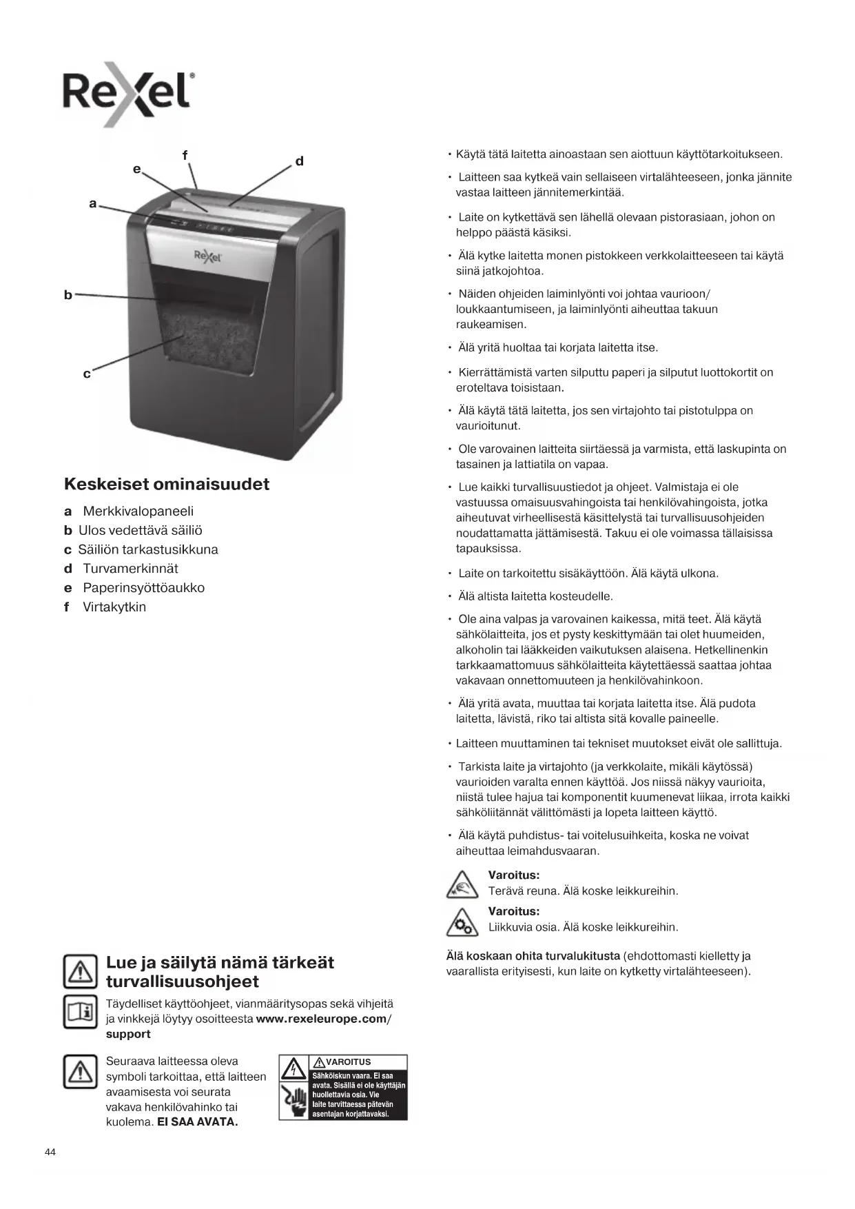 Älä koskaan ohita turvalukitusta (ehdottomasti kielletty ja vaarallista erityisesti, kun laite on kytketty virtalähteeseen). Varoitus: Terävä reuna. Älä koske leikkureihin. Varoitus: Liikkuvia osia. Älä koske leikkureihin. Keskeiset ominaisuudet a Merkkivalopaneeli b Ulos vedettävä säiliö c Säiliön tarkastusikkuna d Turvamerkinnät e Paperinsyöttöaukko f Virtakytkin