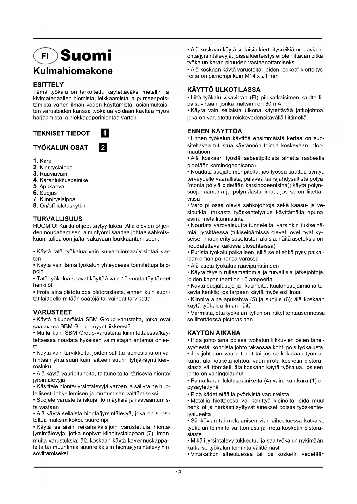 Tämä työkalu on tarkoitettu käytettäväksi metallin ja kivimateriaalien hiomista, leikkaamista ja purseenpoistamista varten ilman veden käyttämistä; asianmukais- ten varusteiden kanssa työkalua voidaan käyttää myös harjaamista ja hiekkapaperihiontaa varten