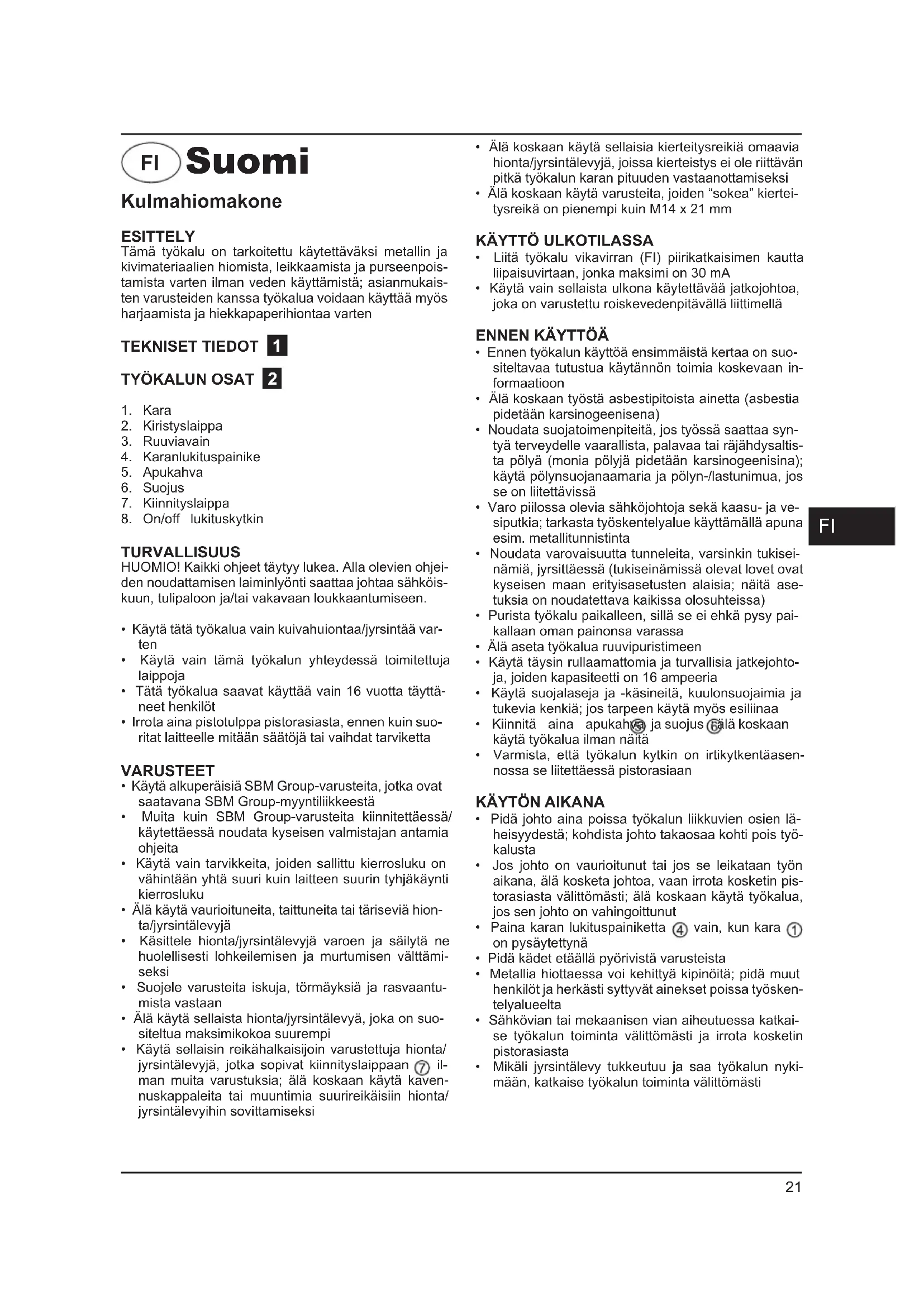 Tämä työkalu on tarkoitettu käytettäväksi metallin ja kivimateriaalien hiomista, leikkaamista ja purseenpoistamista varten ilman veden käyttämistä; asianmukais- ten varusteiden kanssa työkalua voidaan käyttää myös harjaamista ja hiekkapaperihiontaa varten