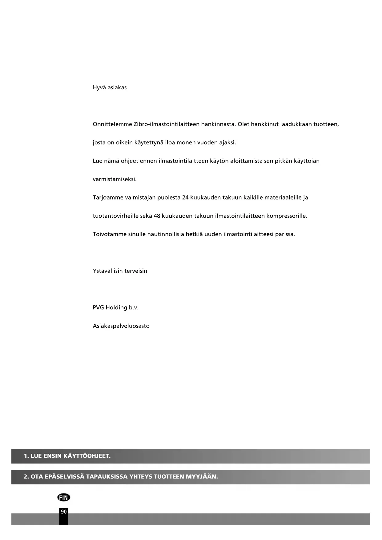 Hyvä asiakas Onnittelemme Zibro-ilmastointilaitteen hankinnasta. Olet hankkinut laadukkaan tuotteen, josta on oikein käytettynä iloa monen vuoden ajaksi. Lue nämä ohjeet ennen ilmastointilaitteen käytön aloittamista sen pitkän käyttöiän varmistamiseksi. Tarjoamme valmistajan puolesta 24 kuukauden takuun kaikille materiaaleille ja tuotantovirheille sekä 48 kuukauden takuun ilmastointilaitteen kompressorille. Toivotamme sinulle nautinnollisia hetkiä uuden ilmastointilaitteesi parissa. Ystävällisin terveisin PVG Holding b.v. Asiakaspalveluosasto man_S(C)32xx.qxd:man_S18xx 12-02-13 09:58 Page 90FIN