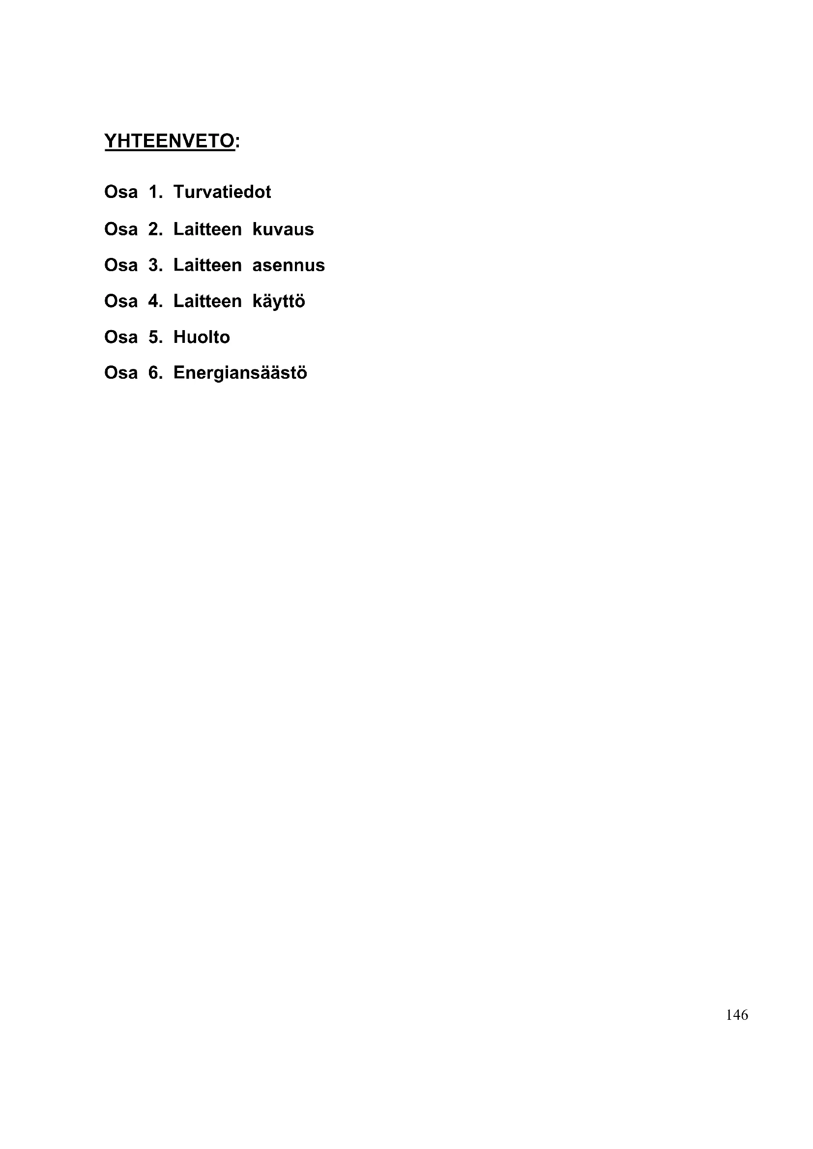 Vaatimukset ruokien tai muiden tuotteiden vahingonkorvauksista tai minkään muun seuraamuksellisen menetyksen korvaamisesta, taloudellinen menetys mukaan lukien ei kuulu takuun piiriin. Suosittelemme tarkastamaan jääkaapin/pakastimen oikean toiminnan säännöllisesti. Menetykset voivat aiheutua rikkoontumista seuraavasta toiminnan heikentymisestä tai laitteen vahingossa syntyneestä vikatilasta, pistokkeista, sulakkeista tai virranjakelusta. Nämä kuuluvat kotivakuutuksen piiriin tai ne saattavat vaatia lisävakuutuksen. Tarkasta asia vakuutusyhtiöltäsi.158 Osa 6.Energiansäästö Energian säästämiseksi suosittelemme seuraavaa: Asenna laite etäälle lämmönlähteistä ja suorasta auringonvalosta hyvin ilmastoituun huoneeseen. Älä laita jääkaappiin kuumaa ruokaa, jotta sisälämpötila ei nouse ja kompressorin ei tarvitse olla jatkuvasti päällä. Älä pidä jääkaapissa liikaa ruokaa, jotta ilma pääsee kiertämään hyvin. Sulata laite, mikäli siinä on jäätä, jotta kylmyys siirtyy tehokkaammin. Mikäli sähkövirta on katkennut, jääkaapin ovi kannattaa pitää suljettuna. Pidä laitteen ovia avattuina mahdollisimman vähän. Älä säädä lämpötilaa liian kylmäksi. Poista laitteen taakse kertynyt pöly.