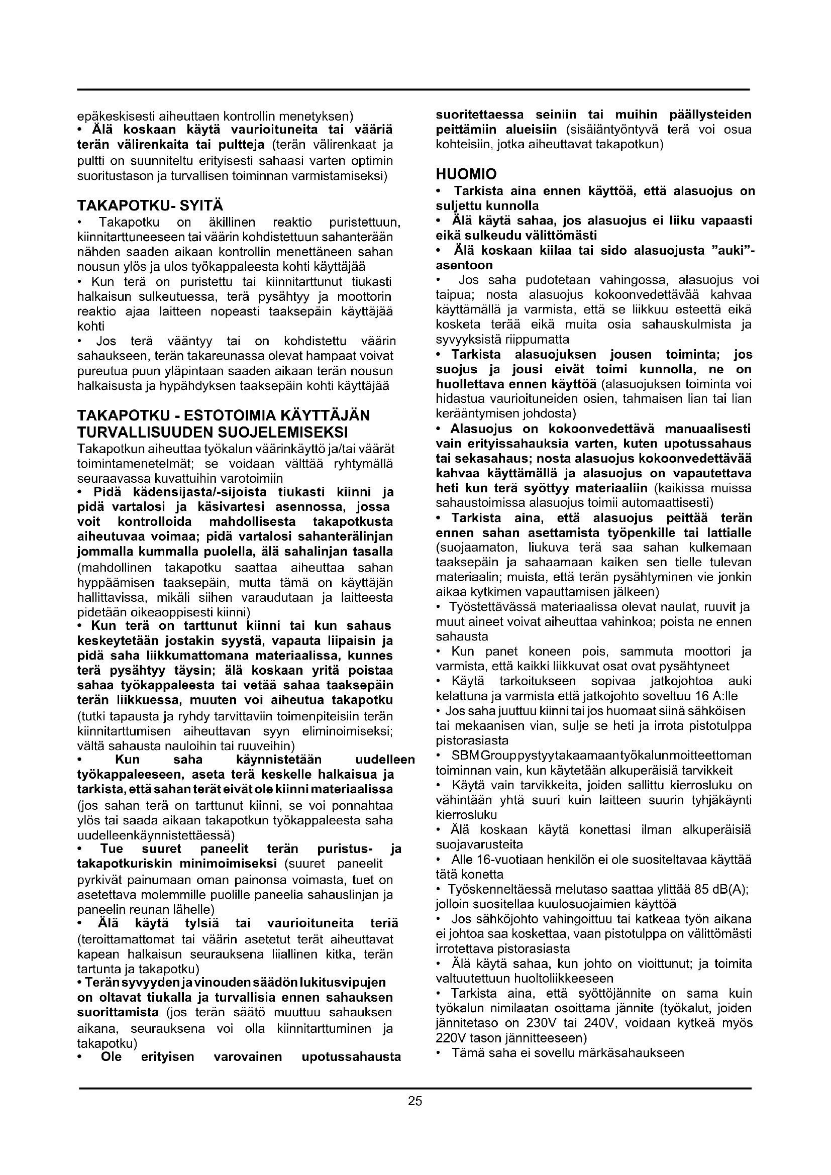 - Pidä kädet poissa sahausalueelta ja terästä; pidä toinen käsi etukahvalla (jos molemmat kädet pitävät kiinni sahasta, terän ei ole mahdollista päästä koskettamaan niitä)• Älä kurota työkappaleen alapuolelle (suojus ei pysty suojaamaan sinua terältä työkappaleen alapuolella)• Säädä sahaussyvyys sahattavan materiaalin paksuuden mukaiseksi (työkappaleen alapuolelta tulisi näkyä enimmillään hampaan verran sahanterää)• Älä koskaan pidä sahattavaa työkappaletta kädessäsi tai jalkojen poikki (työkalu on tärkeää tukea asianmukaisesti keholle aiheutuvien vaarojen, terän kiinnitarttumisen tai kontrollin menettämisen minimoimiseksi)• Pidä työkappaleesta kiinni sen eristetyistä tartuntapinnoista suoritettaessa toimintaa, jossa saha voi saada kontaktin kätkettyyn johtoon tai sen omaan sähköjohtoon (kontakti jännitteiseen johtoon saa myös työkalun paljastetut metalliosat jännitteisiksi ja aiheuttavat sähköiskun käyttäjälle)• Kuituja pitkin sahattaessa käytä aina sahausohjainta tai suorareunaista ohjainta (tämä parantaa sahauksen tarkkuutta ja vähentää terän kiinnitarttumista)• Käytä teriä aina oikeankokoisilla ja -muotoisilla jyrsintuurnan rei’illä(vinoneliö/pyöreä) (terät, jotka eivät vastaa sahan kiinnityslaitteita, toimivat och om möjligt damm-/spånutsugning• Såga ej extremt små arbetsstycken• Se till att arbetsområdet är fritt från föremål innan du startar arbetet• Använd aldrig din maskin ovanför huvudet• Använd endast sågbord som är utrustad med 0-spänningsströmbrytare som förhindrar återstart av motorn efter strömavbrott• Använd endast sågbord som är utrustad med klyvkniven• Dra alltid ur stickkontakten från vägguttaget innan du gör någon justering eller byter tillbehör Maskinen är dubbelt isolerad i överensstäm-melse med EN 50144, vilket innebär att det inte behövs någon jordledare. UNDERHÅLL Tillse att maskinen inte är spännings förande när underhållsarbeten utförs på de mekaniska delarna.SBM Groups maskiner har konstruerats för att under lång tid fungera problemfritt med ett minimalt underhåll. Genom att regelbundet rengöra maskinen och hantera den på rätt sätt bidrar du till en lång livslängd för din maskin.Rengör maskinhöljet regelbundet med en mjuk duk, företrädesvis efter varje användning. Tillse att ventila-tionsspringorna är fria från damm och smuts. Använd en mjuk duk fuktad med tvålvatten vid svår smuts. An-vänd inga lösningsmedel som bensin, alkohol, ammo-niak etc. Sådana ämnen skadar plastdelarna.Maskinen behöver ingen extra smörjning.Om en driftstörning uppträder till exempel till följd av att en del har blivit sliten, kontakta då din lokala SBM Gro-up- återförsäljare. MILJÖ För att undvika transportskador levereras maskinen i en så stadig förpackning som möjligt. Förpackningen har så långt det är möjligt tillverkats av återvinningsbart material. Ta därför tillvara möjligheten att återvinna för-packningen.Återlämna gamla maskiner till din lokala SBM Group-återförsäljare när du byter ut dem. Där kommer maski-nen att tas om hand på ett miljövänligt sätt.25 epäkeskisesti aiheuttaen kontrollin menetyksen)