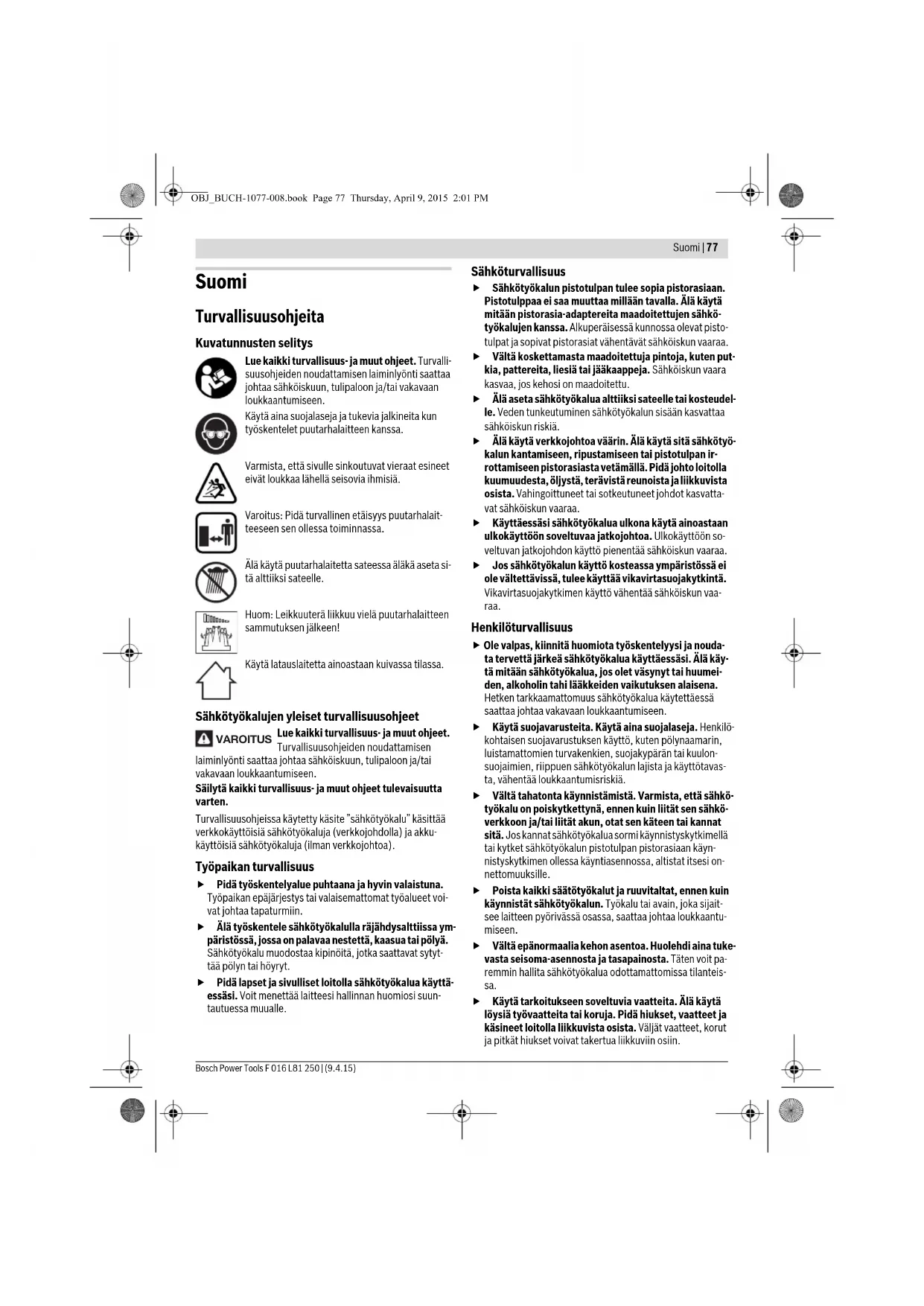 LED Kapasitet Kontinuerlig grønt lys 35 – 100% Blinklys grønt 15–35% Blinklys rødt 5 – 15% Kontinuerlig rødt lys 0 – 5% OBJ_BUCH-1077-008.book Page 75 Thursday, April 9, 2015 2:01 PM76 | Norsk F 016 L81 250 | (9.4.15) Bosch Power Tools Feilsøking Vedlikehold og rengjøring OBS! Slå av hageredskapet før du utfører vedlikeholds- eller rengjøringsarbeid. Etter at hageredskapet er slått av, fortsetter knivene å bevege seg i noen få sekunder. OBS! Du må ikke berøre kniver som beveger seg. Hold hageredskapet rent, for å kunne arbeide bra og sikkert. Bruk alltid sikkerhetshansker når du arbeider med ha- geredskapet eller utfører vedlikeholds-/rengjøringsar- beider. Sjekk hageredskapet med jevne mellomrom mht. synlige feil, slik som løse fester og slitte eller skadede deler. Kundeservice og rådgivning ved bruk www.bosch-garden.com Ved alle forespørsler og reservedelsbestillinger må du oppgi det 10-sifrede produktnummeret som er angitt på elektro- verktøyets typeskilt. Norsk Robert Bosch AS Postboks 350 1402 Ski Tel.: 64 87 89 50 Faks: 64 87 89 55 Transport Li-ion-batteriene i verktøyet underligger kravene for farlig gods. Batteriene kan transporteres på veier av brukeren uten ytterligere krav. Ved forsendelse gjennom tredje personer (f. eks.: lufttran- sport eller spedisjon) må det oppfylles spesielle krav til em- ballasje og merking. Du må da konsultere en ekspert for farlig gods ved forberedelse av forsendelsen. Deponering Hageredskaper, tilbehøret og emballasjen må leveres inn til miljøvennlig gjenvinning. Hageredskaper, ladeapparater og batterier må ikke kastes i vanlig søppel! Kun for EU-land: Iht. det europeiske direktivet 2012/19/EU om gamle elektriske og elektroniske maski- ner og iht. det europeiske direktivet 2006/66/EF må defekte eller oppbrukte batterier/oppladbare batterier samles inn adskilt og leveres inn til en miljøvennlig re- sirkulering. Integrerte batterier må kun fjernes til deponering. Der- som huset åpnes kan hageredskapet ødelegges. Når du skal ta batteriet ut av elektroverktøyet, aktiverer du av/på-bryteren til batteriet er helt utladet. Skru ut skruene på huset og ta av husdekselet for å ta ut batteriet. For å hindre kortslutning kobler du fra de enkelte tilkoblingene på batteriet etter tur, og isolerer polene til disse. Det er fortsatt restkapa- sitet i batteriet også etter fullstendig utlading, og denne kan frigjøres hvis det oppstår en kortslutning. Batterier/oppladbare batterier: Li-Ion: Ta hensyn til informasjonene i avsnittet «Transport». Rett til endringer forbeholdes. Symptomer Mulig årsak Utbedring For kort klippetid pr. batteriopplading Batteriet nærmer seg slutten på levetiden. Ta kontakt med kundeservice Batteri-ladeindikator lyser kontinuerlig Ingen opplading mulig Batteriet er defekt Ta kontakt med kundeservice OBJ_BUCH-1077-008.book Page 76 Thursday, April 9, 2015 2:01 PMSuomi | 77 Bosch Power Tools F 016 L81 250 | (9.4.15) Suomi Turvallisuusohjeita Kuvatunnusten selitys Lue kaikki turvallisuus- ja muut ohjeet. Turvalli- suusohjeiden noudattamisen laiminlyönti saattaa johtaa sähköiskuun, tulipaloon ja/tai vakavaan loukkaantumiseen. Käytä aina suojalaseja ja tukevia jalkineita kun työskentelet puutarhalaitteen kanssa. Varmista, että sivulle sinkoutuvat vieraat esineet eivät loukkaa lähellä seisovia ihmisiä. Varoitus: Pidä turvallinen etäisyys puutarhalait- teeseen sen ollessa toiminnassa. Älä käytä puutarhalaitetta sateessa äläkä aseta si- tä alttiiksi sateelle. Huom: Leikkuuterä liikkuu vielä puutarhalaitteen sammutuksen jälkeen! Käytä latauslaitetta ainoastaan kuivassa tilassa. Sähkötyökalujen yleiset turvallisuusohjeet Lue kaikki turvallisuus- ja muut ohjeet. Turvallisuusohjeiden noudattamisen laiminlyönti saattaa johtaa sähköiskuun, tulipaloon ja/tai vakavaan loukkaantumiseen. Säilytä kaikki turvallisuus- ja muut ohjeet tulevaisuutta varten. Turvallisuusohjeissa käytetty käsite ”sähkötyökalu” käsittää verkkokäyttöisiä sähkötyökaluja (verkkojohdolla) ja akku- käyttöisiä sähkötyökaluja (ilman verkkojohtoa). Työpaikan turvallisuus Pidä työskentelyalue puhtaana ja hyvin valaistuna. Työpaikan epäjärjestys tai valaisemattomat työalueet voi- vat johtaa tapaturmiin. Älä työskentele sähkötyökalulla räjähdysalttiissa ym- päristössä, jossa on palavaa nestettä, kaasua tai pölyä. Sähkötyökalu muodostaa kipinöitä, jotka saattavat sytyt- tää pölyn tai höyryt. Pidä lapset ja sivulliset loitolla sähkötyökalua käyttä- essäsi. Voit menettää laitteesi hallinnan huomiosi suun- tautuessa muualle. Sähköturvallisuus Sähkötyökalun pistotulpan tulee sopia pistorasiaan. Pistotulppaa ei saa muuttaa millään tavalla. Älä käytä mitään pistorasia-adaptereita maadoitettujen sähkö- työkalujen kanssa. Alkuperäisessä kunnossa olevat pisto- tulpat ja sopivat pistorasiat vähentävät sähköiskun vaaraa. Vältä koskettamasta maadoitettuja pintoja, kuten put- kia, pattereita, liesiä tai jääkaappeja. Sähköiskun vaara kasvaa, jos kehosi on maadoitettu. Älä aseta sähkötyökalua alttiiksi sateelle tai kosteudel- le. Veden tunkeutuminen sähkötyökalun sisään kasvattaa sähköiskun riskiä. Älä käytä verkkojohtoa väärin. Älä käytä sitä sähkötyö- kalun kantamiseen, ripustamiseen tai pistotulpan ir- rottamiseen pistorasiasta vetämällä. Pidä johto loitolla kuumuudesta, öljystä, terävistä reunoista ja liikkuvista osista. Vahingoittuneet tai sotkeutuneet johdot kasvatta- vat sähköiskun vaaraa. Käyttäessäsi sähkötyökalua ulkona käytä ainoastaan ulkokäyttöön soveltuvaa jatkojohtoa. Ulkokäyttöön so- veltuvan jatkojohdon käyttö pienentää sähköiskun vaaraa. Jos sähkötyökalun käyttö kosteassa ympäristössä ei ole vältettävissä, tulee käyttää vikavirtasuojakytkintä. Vikavirtasuojakytkimen käyttö vähentää sähköiskun vaa- raa. Henkilöturvallisuus Ole valpas,