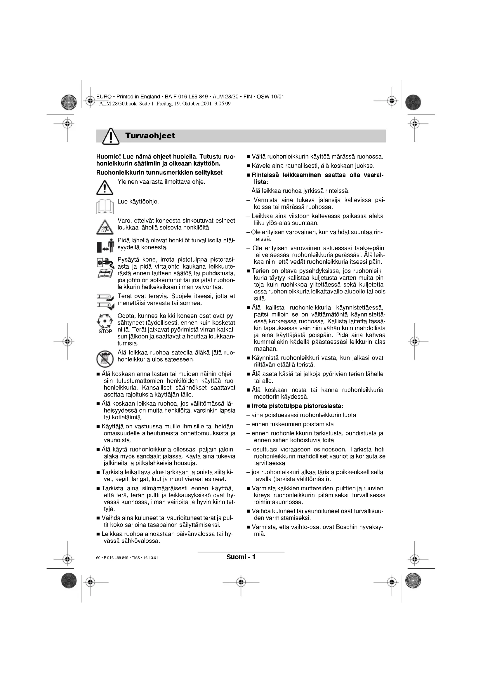 er la- vere enn 96 dB (A). Bedømmelsesmetode for sam- svar se vedlegg VIII. Angitt kontrollsted: SRL, Sudbury England Leinfelden, 10.10.2001. Dr. Gerhard Felten Dr. Eckerhard Strötgen Robert Bosch GmbH, Geschäftsbereich Elektrowerkzeuge Rett til endringer forbeholdes Garanti Miljøvern Kundeservice Samsvarserklæring ALM 28/30.book Seite 5 Freitag, 19. Oktober 2001 9:05 09 59 • F 016 L69 849 • TMS • 16.10.01EURO • Printed in England • BA F 016 L69 849 • ALM 28/30 • FIN • OSW 10/01 Suomi - 1 Huomio! Lue nämä ohjeet huolella. Tutustu ruo- honleikkurin säätimiin ja oikeaan käyttöön. Ruohonleikkurin tunnusmerkkien selitykset Yleinen vaarasta ilmoittava ohje. Lue käyttöohje. Varo, etteivät koneesta sinkoutuvat esineet loukkaa lähellä seisovia henkilöitä. Pidä lähellä olevat henkilöt turvallisella etäi- syydellä koneesta. Pysäytä kone, irrota pistotulppa pistorasi- asta ja pidä virtajohto kaukana leikkuute- rästä ennen laitteen säätöä tai puhdistusta, jos johto on sotkeutunut tai jos jätät ruohon- leikkurin hetkeksikään ilman valvontaa. Terät ovat teräviä. Suojele itseäsi, jotta et menettäisi varvasta tai sormea. Odota, kunnes kaikki koneen osat ovat py- sähtyneet täydellisesti, ennen kuin kosketat niitä. Terät jatkavat pyörimistä virran katkai- sun jälkeen ja saattavat aiheuttaa loukkaan- tumisia. Älä leikkaa ruohoa sateella äläkä jätä ruo- honleikkuria ulos sateeseen. ■ Älä koskaan anna lasten tai muiden näihin ohjei- siin tutustumattomien henkilöiden käyttää ruo- honleikkuria. Kansalliset säännökset saattavat asettaa rajoituksia käyttäjän iälle. ■ Älä koskaan leikkaa ruohoa, jos välittömässä lä- heisyydessä on muita henkilöitä, varsinkin lapsia tai kotieläimiä. ■ Käyttäjä on vastuussa muille ihmisille tai heidän omaisuudelle aiheutuneista onnettomuuksista ja vaurioista. ■ Älä käytä ruohonleikkuria ollessasi paljain jaloin äläkä myös sandaalit jalassa. Käytä aina tukevia jalkineita ja pitkälahkeisia housuja. ■ Tarkista leikattava alue tarkkaan ja poista siitä ki- vet, kepit, langat, luut ja muut vieraat esineet. ■ Tarkista aina silmämääräisesti ennen käyttöä, että terä, terän pultti ja leikkausyksikkö ovat hy- vässä kunnossa, ilman vairioita ja hyvin kiinnitet- tyjä. ■ Vaihda aina kuluneet tai vaurioituneet terät ja pul- tit koko sarjoina tasapainon säilyttämiseksi. ■ Leikkaa ruohoa ainoastaan päivänvalossa tai hy- vässä sähkövalossa. ■ Vältä ruohonleikkurin käyttöä märässä ruohossa. ■ Kävele aina rauhallisesti, älä koskaan juokse. ■ Rinteissä leikkaaminen saattaa olla vaaral- lista: – Älä leikkaa ruohoa jyrkissä rinteissä. – Varmista aina tukeva jalansija kaltevissa pai- koissa tai märässä ruohossa. – Leikkaa aina viistoon kaltevassa paikassa äläkä liiku ylös-alas suuntaan. – Ole erityisen varovainen, kun vaihdat suuntaa rin- teissä. – Ole erityisen varovainen astuessasi taaksepäin tai vetäessäsi ruohonleikkuria perässäsi. Älä leik- kaa niin, että vedät ruohonleikkuria itseesi päin. ■ Terien on oltava pysähdyksissä, jos ruohonleik- kuria täytyy kallistaa kuljetusta varten muita pin- toja kuin ruohikkoa ylitettäessä sekä kuljetetta- essa ruohonleikkuria leikattavalle alueelle tai pois siitä. ■ Älä kallista ruohonleikkuria käynnistettäessä, paitsi milloin se on välttämätöntä käynnistettä- essä korkeassa ruohossa. Kallista laitetta tässä- kin tapauksessa vain niin vähän kuin mahdollista ja aina käyttäjästä poispäin. Pidä aina kahvaa kummallakin kädellä päästäessäsi leikkurin alas maahan. ■ Käynnistä ruohonleikkuri vasta, kun jalkasi ovat riittävän etäällä teristä. ■ Älä aseta käsiä tai jalkoja pyörivien terien lähelle tai alle. ■ Älä koskaan nosta tai kanna ruohonleikkuria moottorin käydessä. ■ Irrota pistotulppa pistorasiasta: – aina poistuessasi ruohonleikkurin luota – ennen tukkeumien poistamista – ennen ruohonleikkurin tarkistusta, puhdistusta ja ennen siihen kohdistuvia töitä – osuttuasi vieraaseen esineeseen. Tarkista heti ruohonleikkurin mahdolliset vauriot ja korjauta se tarvittaessa – jos ruohonleikkuri alkaa täristä poikkeuksellisella tavalla (tarkista välittömästi). ■ Varmista kaikkien muttereiden, pulttien ja ruuvien kireys ruohonleikkurin pitämiseksi turvallisessa toimintakunnossa. ■ Vaihda kuluneet tai vaurioituneet osat turvallisuu- den varmistamiseksi. ■ Varmista, että vaihto-osat ovat Boschin hyväksy- miä. Turvaohjeet STOP ALM 28/30.book Seite 1 Freitag, 19. Oktober 2001 9:05 09 60 • F 016 L69 849 • TMS • 16.10.01EURO • Printed in England • BA F 016 L69 849 • ALM 28/30 • FIN • OSW 10/01 Suomi - 2 Tämä tuote on tarkoitettu ruohonleikkaukseen koti- talouksissa. Tässä käsikirjassa annetaan ohjeita oikeasta ko- koonpanosta ja ruohonleikkurin turvallisesta käy- töstä. On tärkeää, että luet nämä ohjeet huolella. Täysin kokoonpantu kone painaa n. 4,6 kg. Pyydä tarvittaessa apua koneen poistamiseksi pakkauk- sestaan. Nosta ruohonleikkuri varovasti pakkauksesta ja tar- kista, että siitä löytyy seuraavat tarvikkeet: – Ruohonleikkuri työntöaisoineen – 1 Sankakahvan alaosa – 2 Ruuvia – 2 Siipimutteria – 2 Pulttia – 2 Kaapelikiinnikettä – Käyttöohje Jos jokin osa puuttuu tai on vaurioitunut, ota yhteys jälleen- myyjääsi. 1 Käynnistyskytkin 2 Käynnistysvarmistin 3 Sankakahvan yläosa 4 Pistotulppa** 5 Kaapelin vedonpoistin 6 Sankakahvan alaosa **maakohtainen Käyttöohjeissa kuvatut lisätarvikkeet eivät välttämättä sisälly toimitukseen! Sähköturvallisuus Kone on turvallisuuden varmistamiseksi kaksois- eristetty eikä se vaadi maadoitusta. Käyttöjännite on 230 V, 50 Hz vaihtovirta. Käytä vain hyväksyttyjä jatkojohtoja. Tietoja saat Bosch- asiakasneuvon- nasta. Jatkojohtoina saa käyttää ainoastaan laatuluokan H05VV-F tai H05RN