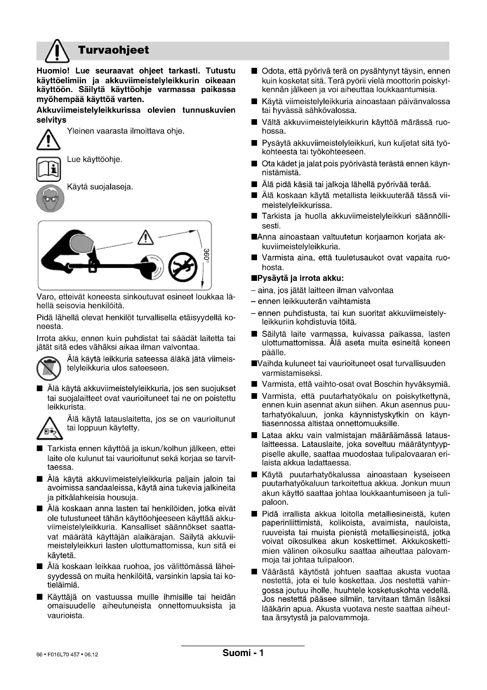 Rett til endringer forbeholdes Deponering Kundeservice Samsvarserklæring F016L70 457.book Seite 6 Montag, 18. Dezember 2006 9:45 09 65 • F016L70 457 • 06.12Suomi - 1 Huomio! Lue seuraavat ohjeet tarkasti. Tutustu käyttöelimiin ja akkuviimeistelyleikkurin oikeaan käyttöön. Säilytä käyttöohje varmassa paikassa myöhempää käyttöä varten. Akkuviimeistelyleikkurissa olevien tunnuskuvien selvitys Yleinen vaarasta ilmoittava ohje. Lue käyttöohje. Käytä suojalaseja. Varo, etteivät koneesta sinkoutuvat esineet loukkaa lä- hellä seisovia henkilöitä. Pidä lähellä olevat henkilöt turvallisella etäisyydellä ko- neesta. Irrota akku, ennen kuin puhdistat tai säädät laitetta tai jätät sitä edes vähäksi aikaa ilman valvontaa. Älä käytä leikkuria sateessa äläkä jätä viimeis- telyleikkuria ulos sateeseen. ■ Älä käytä akkuviimeistelyleikkuria, jos sen suojukset tai suojalaitteet ovat vaurioituneet tai ne on poistettu leikkurista. Älä käytä latauslaitetta, jos se on vaurioitunut tai loppuun käytetty. ■ Tarkista ennen käyttöä ja iskun/kolhun jälkeen, ettei laite ole kulunut tai vaurioitunut sekä korjaa se tarvit- taessa. ■ Älä käytä akkuviimeistelyleikkuria paljain jaloin tai avoimissa sandaaleissa, käytä aina tukevia jalkineita ja pitkälahkeisia housuja. ■ Älä koskaan anna lasten tai henkilöiden, jotka eivät ole tutustuneet tähän käyttöohjeeseen käyttää akku- viimeistelyleikkuria. Kansalliset säännökset saatta- vat määrätä käyttäjän alaikärajan. Säilytä akkuvii- meistelyleikkuri lasten ulottumattomissa, kun sitä ei käytetä. ■ Älä koskaan leikkaa ruohoa, jos välittömässä lähei- syydessä on muita henkilöitä, varsinkin lapsia tai ko- tieläimiä. ■ Käyttäjä on vastuussa muille ihmisille tai heidän omaisuudelle aiheutuneista onnettomuuksista ja vaurioista. ■ Odota, että pyörivä terä on pysähtynyt täysin, ennen kuin kosketat sitä. Terä pyörii vielä moottorin poiskyt- kennän jälkeen ja voi aiheuttaa loukkaantumisia. ■ Käytä viimeistelyleikkuria ainoastaan päivänvalossa tai hyvässä sähkövalossa. ■ Vältä akkuviimeistelyleikkurin käyttöä märässä ruo- hossa. ■ Pysäytä akkuviimeistelyleikkuri, kun kuljetat sitä työ- kohteesta tai työkohteeseen. ■ Ota kädet ja jalat pois pyörivästä terästä ennen käyn- nistämistä. ■ Älä pidä käsiä tai jalkoja lähellä pyörivää terää. ■ Älä koskaan käytä metallista leikkuuterää tässä vii- meistelyleikkurissa. ■ Tarkista ja huolla akkuviimeistelyleikkuri säännölli- sesti. ■ Anna ainoastaan valtuutetun korjaamon korjata ak- kuviimeistelyleikkuria. ■ Varmista aina, että tuuletusaukot ovat vapaita ruo- hosta. ■ Pysäytä ja irrota akku: – aina, jos jätät laitteen ilman valvontaa – ennen leikkuuterän vaihtamista – ennen puhdistusta, tai kun suoritat akkuviimeistely- leikkuriin kohdistuvia töitä. ■ Säilytä laite varmassa, kuivassa paikassa, lasten ulottumattomissa. Älä aseta muita esineitä koneen päälle. ■ Vaihda kuluneet tai vaurioituneet osat turvallisuuden varmistamiseksi. ■ Varmista, että vaihto-osat ovat Boschin hyväksymiä. ■ Varmista, että puutarhatyökalu on poiskytkettynä, ennen kuin asennat akun siihen. Akun asennus puu- tarhatyökaluun, jonka käynnistyskytkin on käyn- tiasennossa altistaa onnettomuuksille. ■ Lataa akku vain valmistajan määräämässä lataus- laitteessa. Latauslaite, joka soveltuu määrätyntyyp- piselle akulle, saattaa muodostaa tulipalovaaran eri- laista akkua ladattaessa. ■ Käytä puutarhatyökalussa ainoastaan kyseiseen puutarhatyökaluun tarkoitettua akkua. Jonkun muun akun käyttö saattaa johtaa loukkaantumiseen ja tuli- paloon. ■ Pidä irrallista akkua loitolla metalliesineistä, kuten paperinliittimistä, kolikoista, avaimista, nauloista, ruuveista tai muista pienistä metalliesineistä, jotka voivat oikosulkea akun koskettimet. Akkukosketti- mien välinen oikosulku saattaa aiheuttaa palovam- moja tai johtaa tulipaloon. ■ Väärästä käytöstä johtuen saattaa akusta vuotaa nestettä, jota ei tule koskettaa. Jos nestettä vahin- gossa joutuu iholle, huuhtele kosketuskohta vedellä. Jos nestettä pääsee silmiin, tarvitaan tämän lisäksi lääkärin apua. Akusta vuotava neste saattaa aiheut- taa ärsytystä ja palovammoja. Turvaohjeet 360° F016L70 457.book Seite 1 Montag, 18. Dezember 2006 9:45 09 66 • F016L70 457 • 06.12Suomi - 2 Laite on tarkoitettu ruohon ja rikkaruohon leikkuu- seen pensaiden alla sekä rinteissä ja reunoissa, jo- hon ei ruohonleikkurilla pääse. Määräyksenmukainen käyttö rajoittuu lämpötilaan 0 °C … 40 °C. Tässä käsikirjassa on ohjeita laitteesi oikeasta kokoamisesta ja sen turvallisesta käytöstä. On tär- keää, että luet nämä ohjeet huolellisesti. Ota akkuviimeistelyleikkuri varovasti pakkaukses- taan ja tarkista, että kaikki seuraavat osat löytyvät: – Viimeistelyleikkuri – Suojus – Leikkuulautanen – Leikkuuterä – Latauslaite – Käyttöohje Jos jokin osa puuttuu tai on vaurioitunut, ota yhteys jälleen- myyjääsi. 1 Käynnistyskytkin 2 Kahva 3 Apukahva 4 Varren yläosa 5 Varren alaosa 6 Leikkuupää 7 Tuuletusaukot 8 Suojus 9 Akku 10 Latauslaite 11 Akun latauskaukalo 12 LED-näyttö 13 Pistotulppa** 14 Valmistusnumero **maakohtainen Käyttöohjeissa kuvatut lisätarvikkeet eivät välttämättä sisälly toimitukseen! Tekniset tiedot Akkuviimeistelyleikkuri ART 23 EASYTRIM ACCU/