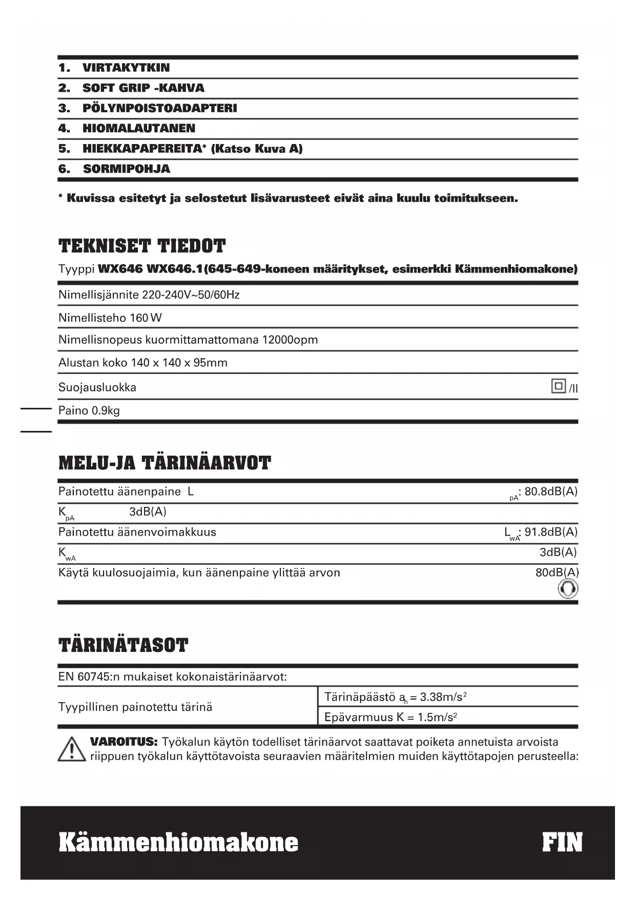 - Kuvissa esitetyt ja selostetut lisävarusteet eivät aina kuulu toimitukseen. Nimellisjännite 220-240V~50/60Hz Nimellisteho 160 W Nimellisnopeus kuormittamattomana 12000opm Alustan koko 140 x 140 x 95mm Suojausluokka /ll Paino 0.9kg TEKNISET TIEDOT Tyyppi WX646 WX646.1(645-649-koneen määritykset, esimerkki Kämmenhiomakone)