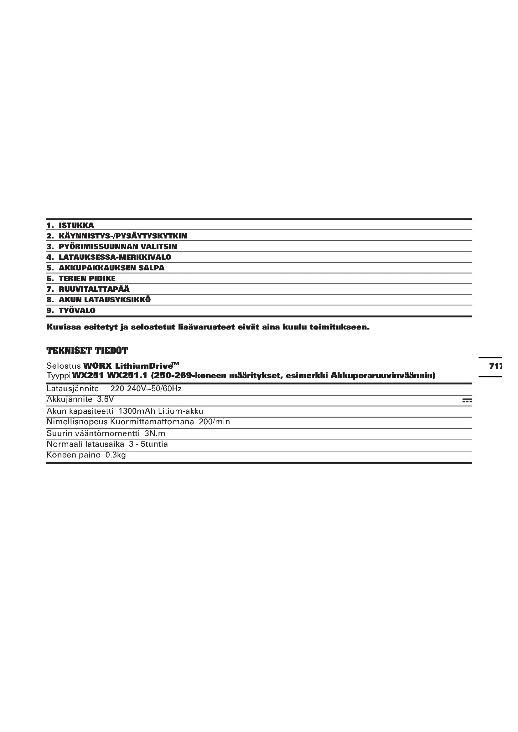 Kuvissa esitetyt ja selostetut lisävarusteet eivät aina kuulu toimitukseen. TeKniseT TiedoT Selostus WORX LithiumDrive
