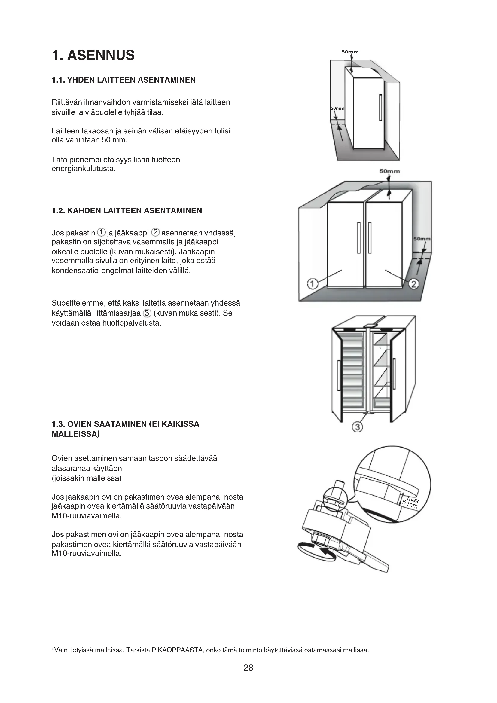 MALLEISSA) Ovien asettaminen samaan tasoon säädettävää alasaranaa käyttäen (joissakin malleissa) Jos jääkaapin ovi on pakastimen ovea alempana, nosta jääkaapin ovea kiertämällä säätöruuvia vastapäivään M10-ruuviavaimella. Jos pakastimen ovi on jääkaapin ovea alempana, nosta pakastimen ovea kiertämällä säätöruuvia vastapäivään M10-ruuviavaimella. *Vain tietyissä malleissa. Tarkista PIKAOPPAASTA, onko tämä toiminto käytettävissä ostamassasi mallissa. 50mm 50mm 5 mm max29