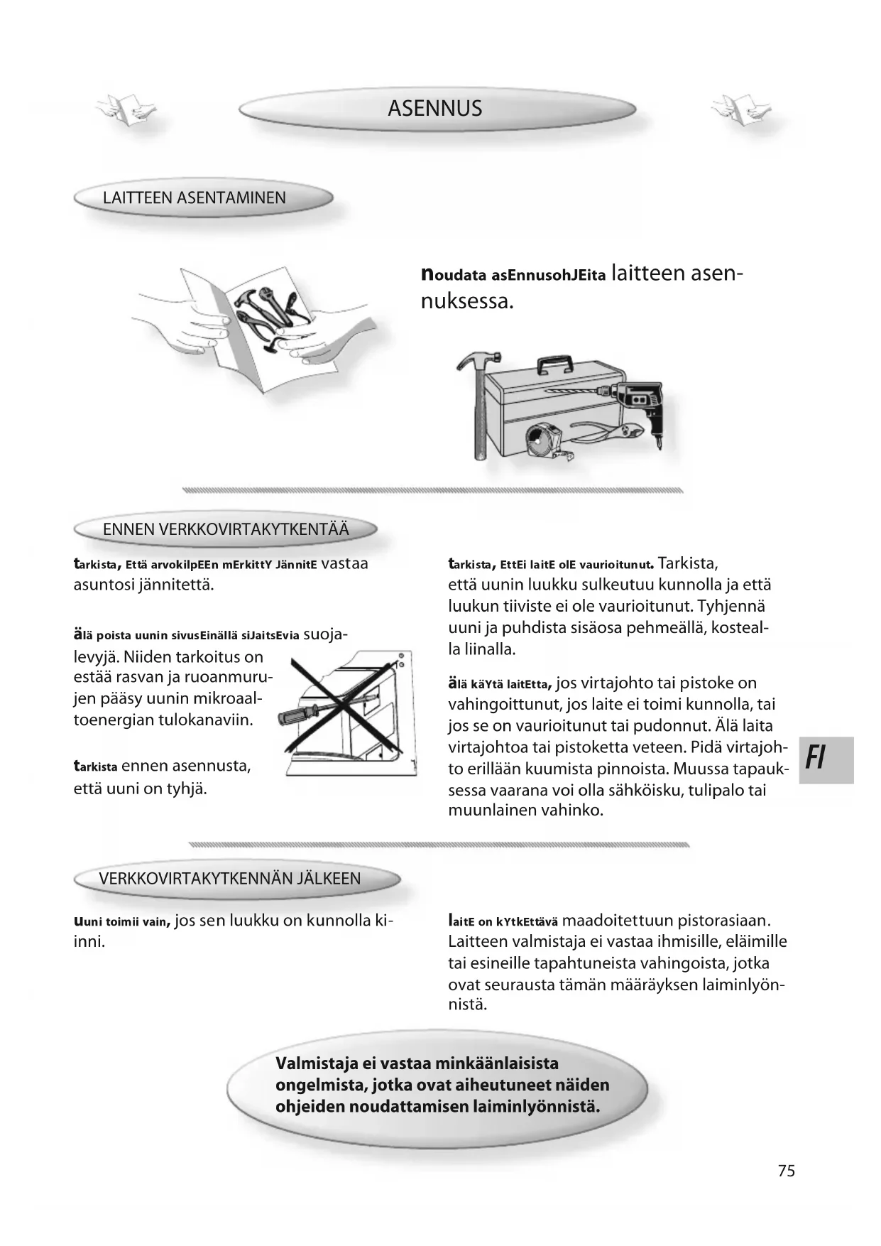 laitE on kYtkEttävä maadoitettuun pistorasiaan. Laitteen valmistaja ei vastaa ihmisille, eläimille tai esineille tapahtuneista vahingoista, jotka ovat seurausta tämän määräyksen laiminlyön- nistä. Valmistaja ei vastaa minkäänlaisista ongelmista, jotka ovat aiheutuneet näiden ohjeiden noudattamisen laiminlyönnistä. älä käYtä laitEtta, jos virtajohto tai pistoke on vahingoittunut, jos laite ei toimi kunnolla, tai jos se on vaurioitunut tai pudonnut. Älä laita virtajohtoa tai pistoketta veteen. Pidä virtajoh- to erillään kuumista pinnoista. Muussa tapauk- sessa vaarana voi olla sähköisku, tulipalo tai muunlainen vahinko. älä poista uunin sivusEinällä siJaitsEvia suoja- levyjä. Niiden tarkoitus on estää rasvan ja ruoanmuru- jen pääsy uunin mikroaal- toenergian tulokanaviin. tarkista ennen asennusta, että uuni on tyhjä. tarkista, Että arvokilpEEn mErkittY JännitE vastaa asuntosi jännitettä. uuni toimii vain, jos sen luukku on kunnolla ki- inni. LAITTEEN ASENTAMINEN noudata asEnnusohJEita laitteen asen- nuksessa. 2010-01-12 - CS4 - 16 Midi - MultiModel WH - Part 1 - 4619-694-70362.indd 75 2010-01-12 08:53:3976