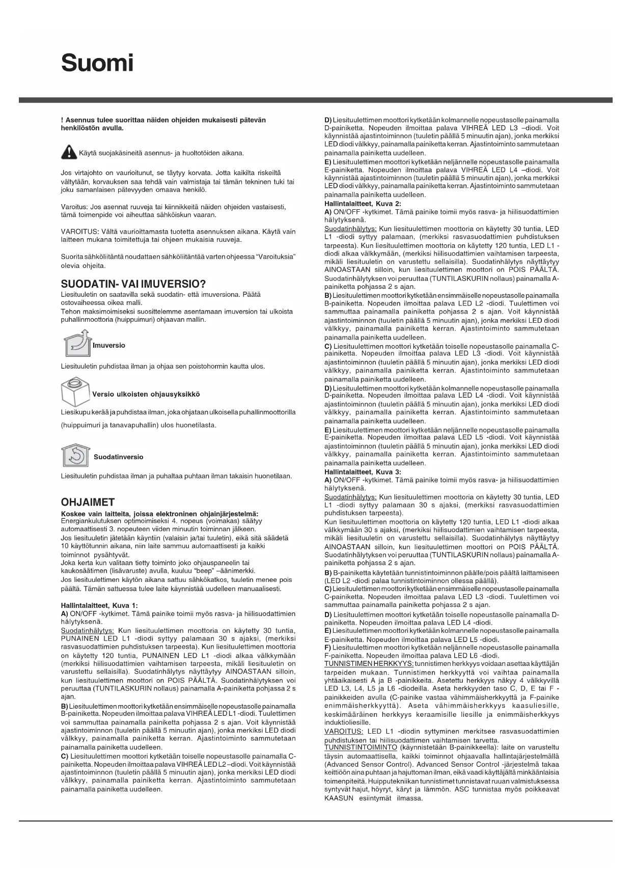 Käytä suojakäsineitä asennus- ja huoltotöiden aikana. Jos virtajohto on vaurioitunut, se täytyy korvata. Jotta kaikilta riskeiltä vältytään, korvauksen saa tehdä vain valmistaja tai tämän tekninen tuki tai joku samanlaisen pätevyyden omaava henkilö. Varoitus: Jos asennat ruuveja tai kiinnikkeitä näiden ohjeiden vastaisesti, tämä toimenpide voi aiheuttaa sähköiskun vaaran. VAROITUS: Vältä vaurioittamasta tuotetta asennuksen aikana. Käytä vain laitteen mukana toimitettuja tai ohjeen mukaisia ruuveja. Suorita sähköliitäntä noudattaen sähköliitäntää varten ohjeessa “Varoituksia” olevia ohjeita. SUODATIN- VAI IMUVERSIO? Liesituuletin on saatavilla sekä suodatin- että imuversiona. Päätä ostovaiheessa oikea malli. Tehon maksimoimiseksi suosittelemme asentamaan imuversion tai ulkoista puhallinmoottoria (huippuimuri) ohjaavan mallin. Imuversio Liesituuletin puhdistaa ilman ja ohjaa sen poistohormin kautta ulos. Versio ulkoisten ohjausyksikkö Liesikupu kerää ja puhdistaa ilman, joka ohjataan ulkoisella puhallinmoottorilla (huippuimuri ja tanavapuhallin) ulos huonetilasta. Suodatinversio Liesituuletin puhdistaa ilman ja puhaltaa puhtaan ilman takaisin huonetilaan. OHJAIMET Koskee vain laitteita, joissa elektroninen ohjainjärjestelmä: Energiankulutuksen optimoimiseksi 4. nopeus (voimakas) säätyy automaattisesti 3. nopeuteen viiden minuutin toiminnan jälkeen. Jos liesituuletin jätetään käyntiin (valaisin ja/tai tuuletin), eikä sitä säädetä 10 käyttötunnin aikana, niin laite sammuu automaattisesti ja kaikki toiminnot pysähtyvät. Joka kerta kun valitaan tietty toiminto joko ohjauspaneelin tai kaukosäätimen (lisävaruste) avulla, kuuluu “beep” –äänimerkki. Jos liesituulettimen käytön aikana sattuu sähkökatkos, tuuletin menee pois päältä. Tämän sattuessa tulee laite käynnistää uudelleen manuaalisesti. Hallintalaitteet, Kuva 1: A) ON/OFF -kytkimet. Tämä painike toimii myös rasva- ja hiilisuodattimien hälytyksenä. Suodatinhälytys: Kun liesituulettimen moottoria on käytetty 30 tuntia, PUNAINEN LED L1 -diodi syttyy palamaan 30 s ajaksi, (merkiksi rasvasuodattimien puhdistuksen tarpeesta). Kun liesituulettimen moottoria on käytetty 120 tuntia, PUNAINEN LED L1 -diodi alkaa välkkymään (merkiksi hiilisuodattimien vaihtamisen tarpeesta, mikäli liesituuletin on varustettu sellaisilla). Suodatinhälytys näyttäytyy AINOASTAAN silloin, kun liesituulettimen moottori on POIS PÄÄLTÄ. Suodatinhälytyksen voi peruuttaa (TUNTILASKURIN nollaus) painamalla A-painiketta pohjassa 2 s ajan. B) Liesituulettimen moottori kytketään ensimmäiselle nopeustasolle painamalla B-painiketta. Nopeuden ilmoittaa palava VIHREÄ LED L1 -diodi. Tuulettimen voi sammuttaa painamalla painiketta pohjassa 2 s ajan. Voit käynnistää ajastintoiminnon (tuuletin päällä 5 minuutin ajan), jonka merkiksi LED diodi välkkyy, painamalla painiketta kerran. Ajastintoiminto sammutetaan painamalla painiketta uudelleen. C) Liesituulettimen moottori kytketään toiselle nopeustasolle painamalla C- painiketta. Nopeuden ilmoittaa palava VIHREÄ LED L2 –diodi. Voit käynnistää ajastintoiminnon (tuuletin päällä 5 minuutin ajan), jonka merkiksi LED diodi välkkyy, painamalla painiketta kerran. Ajastintoiminto sammutetaan painamalla painiketta uudelleen. D) Liesituulettimen moottori kytketään kolmannelle nopeustasolle painamalla D-painiketta. Nopeuden ilmoittaa palava VIHREÄ LED L3 –diodi. Voit käynnistää ajastintoiminnon (tuuletin päällä 5 minuutin ajan), jonka merkiksi LED diodi välkkyy, painamalla painiketta kerran. Ajastintoiminto sammutetaan painamalla painiketta uudelleen. E) Liesituulettimen moottori kytketään neljännelle nopeustasolle painamalla E-painiketta. Nopeuden ilmoittaa palava VIHREÄ LED L4 –diodi. Voit käynnistää ajastintoiminnon (tuuletin päällä 5 minuutin ajan), jonka merkiksi LED diodi välkkyy, painamalla painiketta kerran. Ajastintoiminto sammutetaan painamalla painiketta uudelleen. Hallintalaitteet, Kuva 2: A) ON/OFF -kytkimet. Tämä painike toimii myös rasva- ja hiilisuodattimien hälytyksenä. Suodatinhälytys: Kun liesituulettimen moottoria on käytetty 30 tuntia, LED L1 -diodi syttyy palamaan, (merkiksi rasvasuodattimien puhdistuksen tarpeesta). Kun liesituulettimen moottoria on käytetty 120 tuntia, LED L1 - diodi alkaa välkkymään, (merkiksi hiilisuodattimien vaihtamisen tarpeesta, mikäli liesituuletin on varustettu sellaisilla). Suodatinhälytys näyttäytyy AINOASTAAN silloin, kun liesituulettimen moottori on POIS PÄÄLTÄ. Suodatinhälytyksen voi peruuttaa (TUNTILASKURIN nollaus) painamalla A- painiketta pohjassa 2 s ajan. B) Liesituulettimen moottori kytketään ensimmäiselle nopeustasolle painamalla B-painiketta. Nopeuden ilmoittaa palava LED L2 -diodi. Tuulettimen voi sammuttaa painamalla painiketta pohjassa 2 s ajan. Voit käynnistää ajastintoiminnon (tuuletin päällä 5 minuutin ajan), jonka merkiksi LED diodi välkkyy, painamalla painiketta kerran. Ajastintoiminto sammutetaan painamalla painiketta uudelleen. C) Liesituulettimen moottori kytketään toiselle nopeustasolle painamalla C- painiketta. Nopeuden ilmoittaa palava LED L3 -diodi. Voit käynnistää ajastintoiminnon (tuuletin päällä 5 minuutin ajan), jonka merkiksi LED diodi välkkyy, painamalla painiketta kerran. Ajastintoiminto sammutetaan painamalla painiketta uudelleen. D) Liesituulettimen moottori kytketään kolmannelle nopeustasolle painamalla D-painiketta. Nopeuden ilmoittaa palava LED L4 -diodi. Voit käynnistää ajastintoiminnon (tuuletin päällä 5 minuutin ajan), jonka merkiksi LED diodi välkkyy, painamalla painiketta kerran. Ajastintoiminto sammutetaan painamalla painiketta uudelleen. E) Liesituulettimen moottori kytketään neljännelle nopeustasolle painamalla E-painiketta. Nopeuden ilmoittaa palava LED L5 -diodi. Voit käynnistää ajastintoiminnon (tuuletin päällä 5 minuutin ajan), jonka merkiksi LED 
