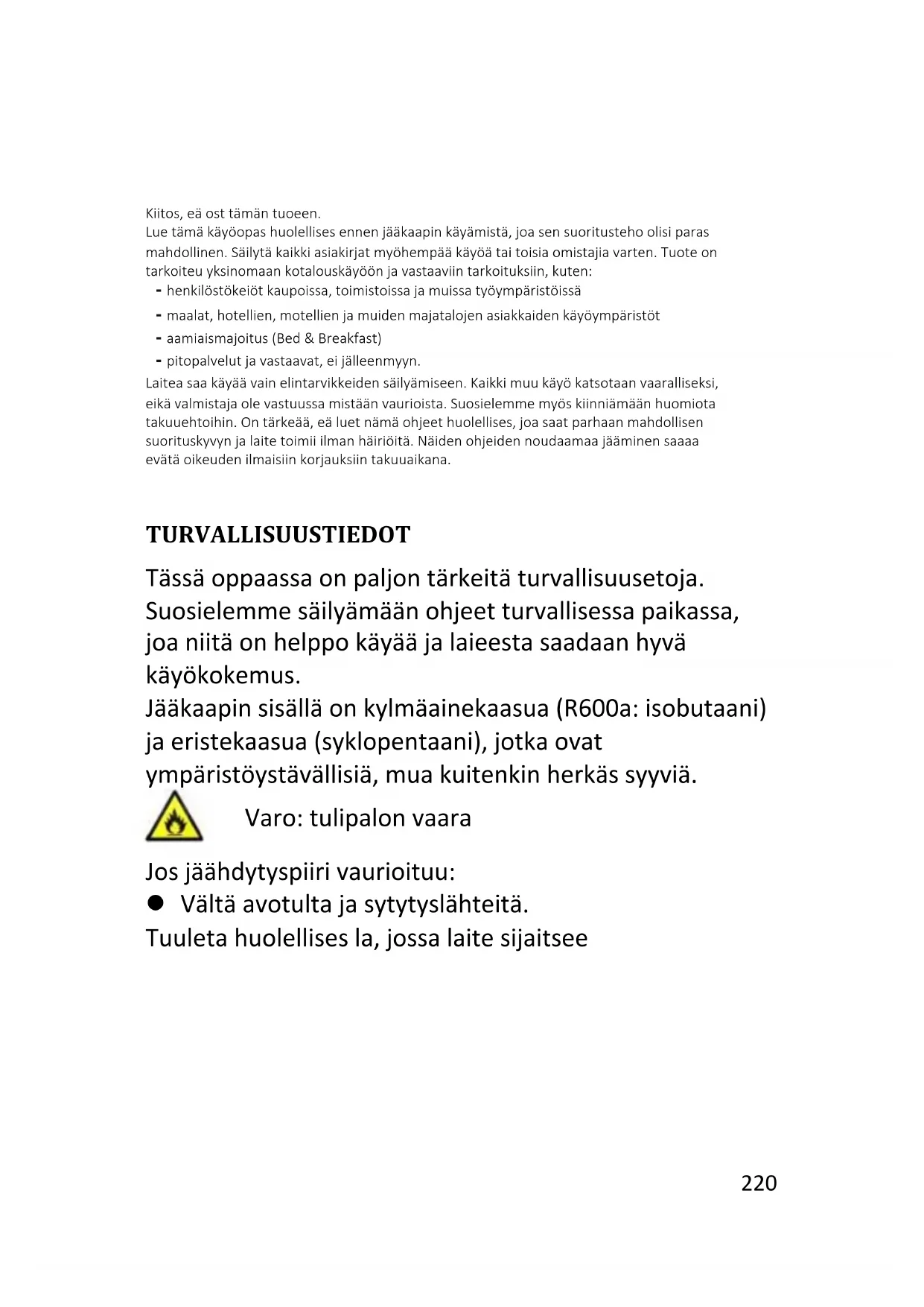 Lue tämä käyöopas huolellises ennen jääkaapin käyämistä, joa sen suoritusteho olisi paras mahdollinen. Säilytä kaikki asiakirjat myöhempää käyöä tai toisia omistajia varten. Tuote on tarkoiteu yksinomaan kotalouskäyöön ja vastaaviin tarkoituksiin, kuten: