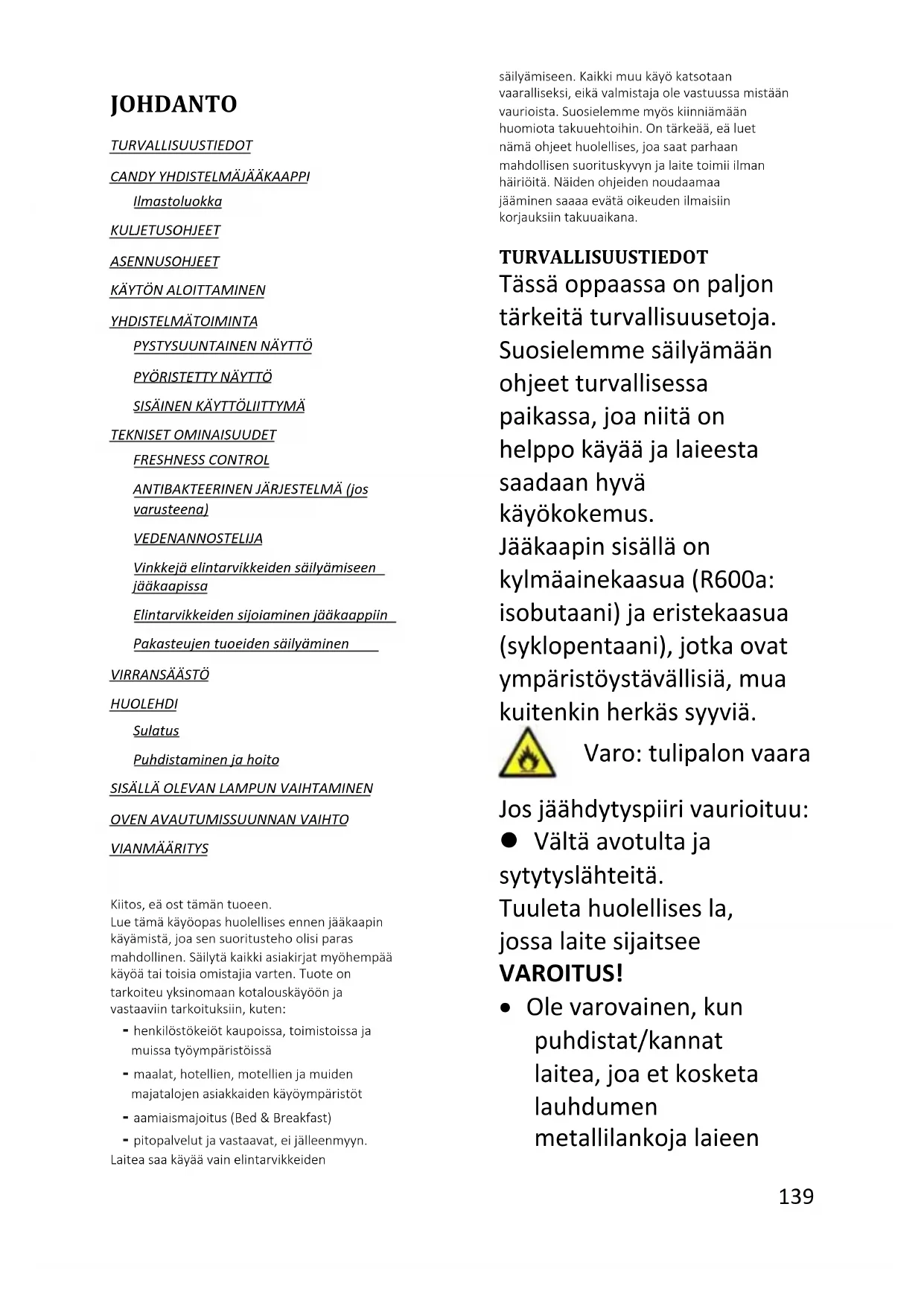 Överensstämmelse Genom att sätta varumärket på denna produkt bekräftar vi överensstämmelse med alla relevanta europeiska säkerhets-, hälso- och miljökrav som är tillämpliga inom lagstiftningen för denna produkt.139 Suomi JOHDANTO TURVALLISUUSTIEDOT CANDY YHDISTELMÄJÄÄKAAPPI Ilmastoluokka KULJETUSOHJEET ASENNUSOHJEET KÄYTÖN ALOITTAMINEN YHDISTELMÄTOIMINTA PYSTYSUUNTAINEN NÄYTTÖ PYÖRISTETTY NÄYTTÖ SISÄINEN KÄYTTÖLIITTYMÄ TEKNISET OMINAISUUDET FRESHNESS CONTROL ANTIBAKTEERINEN JÄRJESTELMÄ (jos varusteena) VEDENANNOSTELIJA Vinkkejä elintarvikkeiden säilyttämiseen jääkaapissa Elintarvikkeiden sijoittaminen jääkaappiin Pakastettujen tuotteiden säilyttäminen VIRRANSÄÄSTÖ HUOLEHDI Sulatus Puhdistaminen ja hoito SISÄLLÄ OLEVAN LAMPUN VAIHTAMINEN OVEN AVAUTUMISSUUNNAN VAIHTO VIANMÄÄRITYS Kiitos, että ostit tämän tuotteen. Lue tämä käyttöopas huolellisesti ennen jääkaapin käyttämistä, jotta sen suoritusteho olisi paras mahdollinen. Säilytä kaikki asiakirjat myöhempää käyttöä tai toisia omistajia varten. Tuote on tarkoitettu yksinomaan kotitalouskäyttöön ja vastaaviin tarkoituksiin, kuten: - henkilöstökeittiöt kaupoissa, toimistoissa ja muissa työympäristöissä - maatilat, hotellien, motellien ja muiden majatalojen asiakkaiden käyttöympäristöt - aamiaismajoitus (Bed & Breakfast) - pitopalvelut ja vastaavat, ei jälleenmyynti. Laitetta saa käyttää vain elintarvikkeiden säilyttämiseen. Kaikki muu käyttö katsotaan vaaralliseksi, eikä valmistaja ole vastuussa mistään vaurioista. Suosittelemme myös kiinnittämään huomiota takuuehtoihin. On tärkeää, että luet nämä ohjeet huolellisesti, jotta saat parhaan mahdollisen suorituskyvyn ja laite toimii ilman häiriöitä. Näiden ohjeiden noudattamatta jättäminen saattaa evätä oikeuden ilmaisiin korjauksiin takuuaikana. TURVALLISUUSTIEDOT Tässä oppaassa on paljon tärkeitä turvallisuustietoja. Suosittelemme säilyttämään ohjeet turvallisessa paikassa, jotta niitä on helppo käyttää ja laitteesta saadaan hyvä käyttökokemus. Jääkaapin sisällä on kylmäainekaasua (R600a: isobutaani) ja eristekaasua (syklopentaani), jotka ovat ympäristöystävällisiä, mutta kuitenkin herkästi syttyviä.
