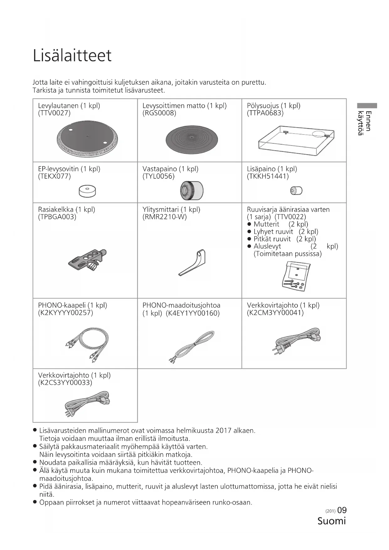 Jotta laite ei vahingoittuisi kuljetuksen aikana, joitakin varusteita on purettu. Tarkista ja tunnista toimitetut lisävarusteet. Levylautanen (1 kpl) (TTV0027) Levysoittimen matto (1 kpl) (RGS0008) Pölysuojus (1 kpl) (TTPA0683) EP-levysovitin (1 kpl) (TEKX077) Vastapaino (1 kpl) (TYL0056) Lisäpaino (1 kpl) (TKKH51441) Rasiakelkka (1 kpl) (TPBGA003) Ylitysmittari (1 kpl) (RMR2210-W) Ruuvisarja äänirasiaa varten (1 sarja) (TTV0022)