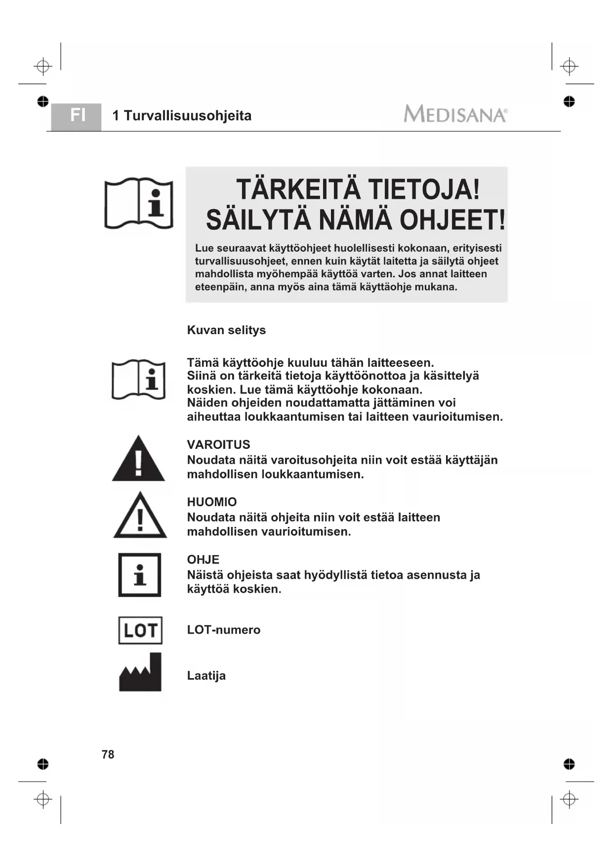 TÄRKEITÄ TIETOJA! SÄILYTÄ NÄMÄ OHJEET! Tämä käyttöohje kuuluu tähän laitteeseen. Siinä on tärkeitä tietoja käyttöönottoa ja käsittelyä koskien. Lue tämä käyttöohje kokonaan. Näiden ohjeiden noudattamatta jättäminen voi aiheuttaa loukkaantumisen tai laitteen vaurioitumisen. VAROITUS Noudata näitä varoitusohjeita niin voit estää käyttäjän mahdollisen loukkaantumisen. HUOMIO Noudata näitä ohjeita niin voit estää laitteen mahdollisen vaurioitumisen. OHJE Näistä ohjeista saat hyödyllistä tietoa asennusta ja käyttöä koskien. Laatija Lue seuraavat käyttöohjeet huolellisesti kokonaan, erityisesti turvallisuusohjeet, ennen kuin käytät laitetta ja säilytä ohjeet mahdollista myöhempää käyttöä varten. Jos annat laitteen Kuvan selitys eteenpäin, anna myös aina tämä käyttäohje mukana. LOT-numero• Käytä laitetta ainoastaan käyttöohjeessa ilmoitettuun tarkoitukseen.
