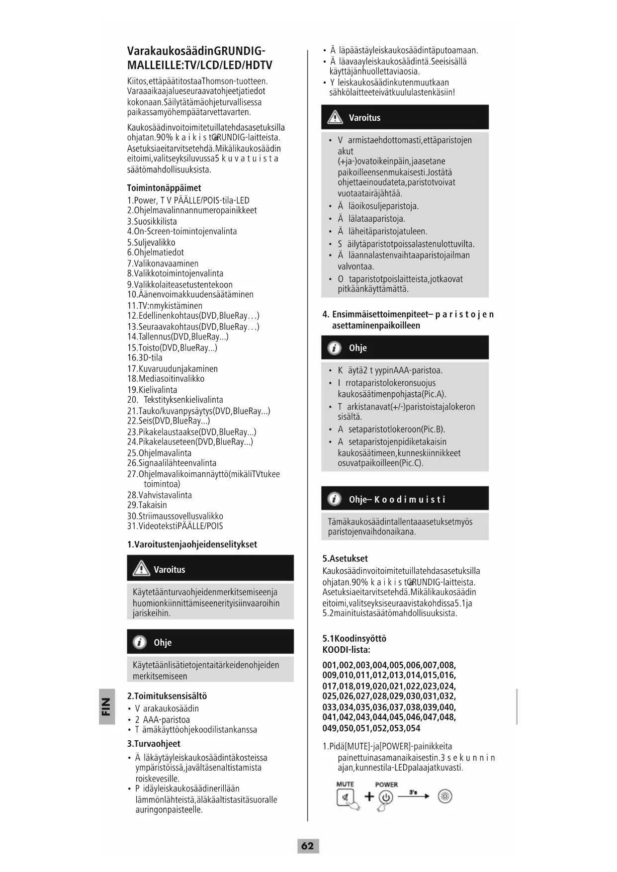 Kiitos, että päätit ostaa Thomson-tuotteen. Varaa aikaa ja lue seuraavat ohjeet ja tiedot kokonaan. Säilytä tämä ohje turvallisessa paikassa myöhempää tarvetta varten. Kaukosäädin voi toimitetuilla tehdasasetuksilla ohjata n. 90 %kaikista GRUNDIG -laitteista. Asetuksia ei tarvitse tehdä. Mikäli kaukosäädin ei toimi, valitse yksi luvussa 5kuvatuista säätömahdollisuuksista. Toimintonäppäimet