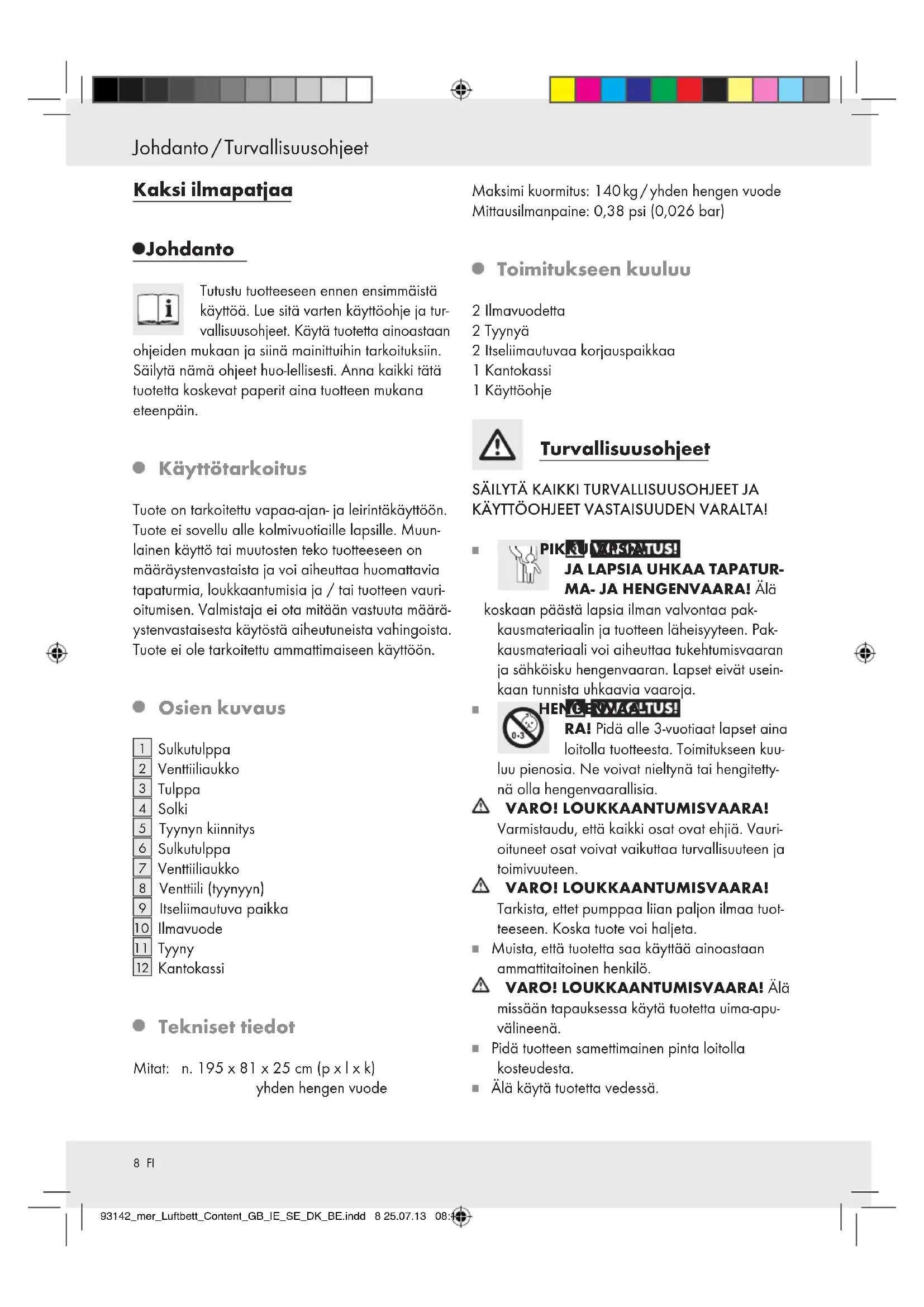 Maksimi kuormitus: 140kg /yhden hengen vuode Mittausilmanpaine: 0,38 psi (0,026 bar)