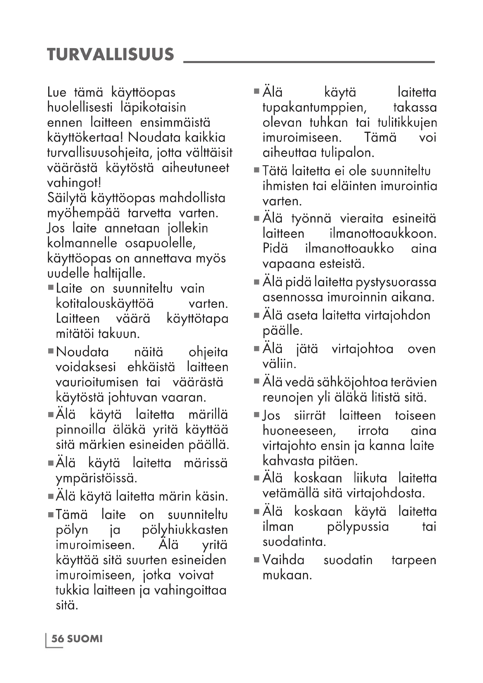 , 50–60 Hz Effekt: : 800 W Bruksradius : 9 m Støvkapasitet : 4 L Filter : HEPA12 Retten til tekniske og designmessige endringer er forbeholdt.56 SUOMI TURVALLISUUS ____________________________ Lue tämä käyttöopas huolellisesti läpikotaisin ennen laitteen ensimmäistä käyttökertaa! Noudata kaikkia turvallisuusohjeita, jotta välttäisit väärästä käytöstä aiheutuneet vahingot! Säilytä käyttöopas mahdollista myöhempää tarvetta varten. Jos laite annetaan jollekin kolmannelle osapuolelle, käyttöopas on annettava myös uudelle haltijalle.